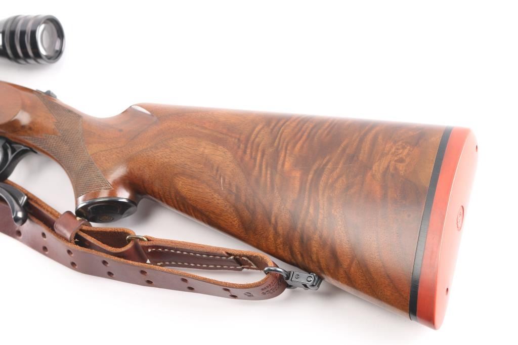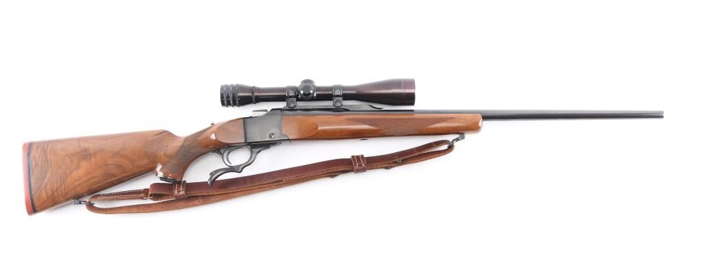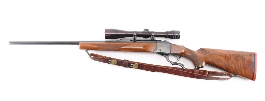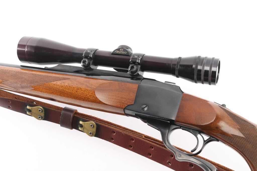 Single shot falling block rifle manufactured circa 1974. Features blued finish, walnut butt stock & forend, 24" barrel with dovetail blocks for scope mounting, no provision for sights, checkering on sides of forend & wrist, sliding tang safety, red rubber butt pad. Bore is excellent/bright. Retains about 98% finish, very minor scratches/scuffs. Wood is excellent with a couple of very minor scratches. Action is smooth. Mounted with a Redfield 6X scope, fine crosshairs, clear optics. Brown leather M1907 type sling attached.