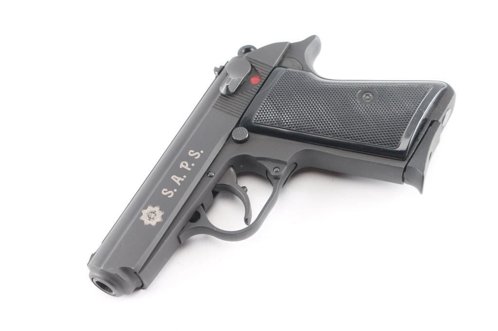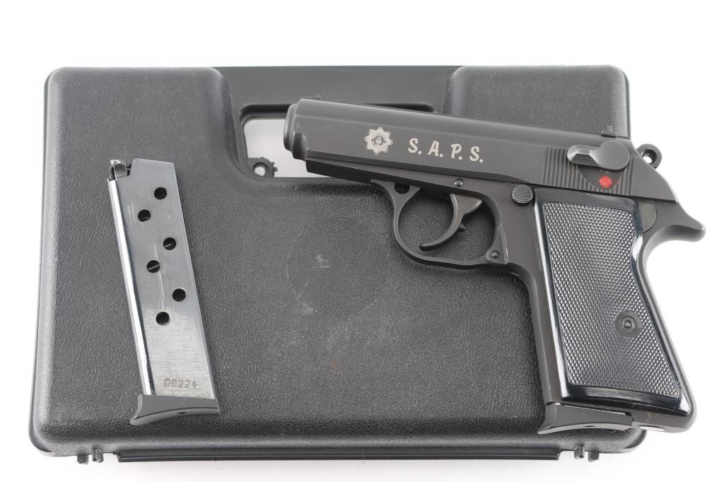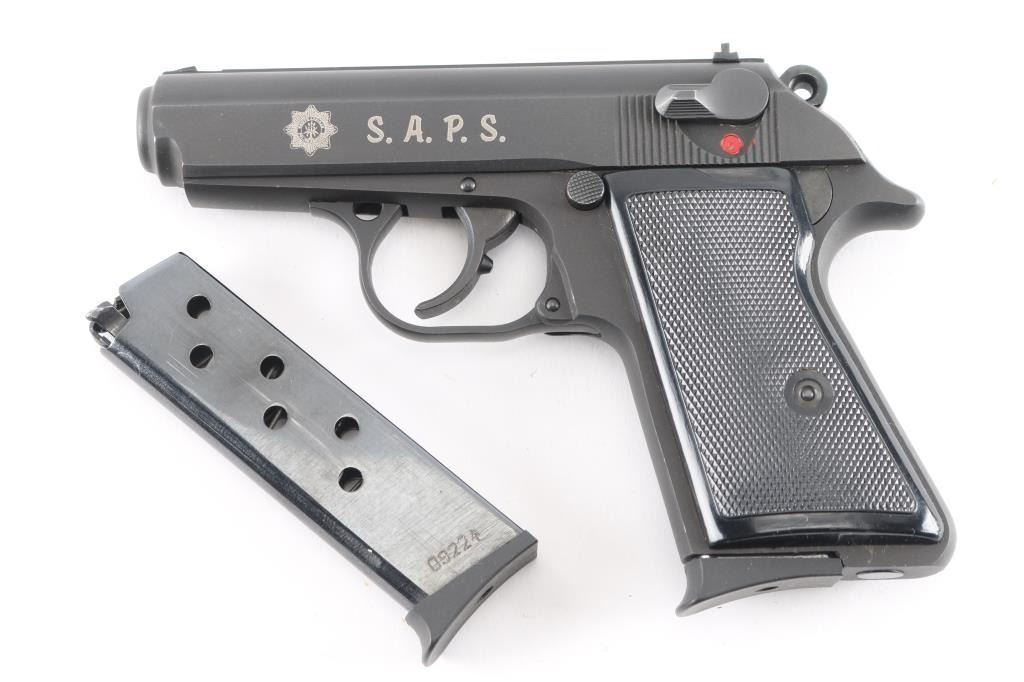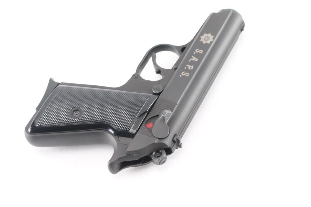 S.A.P.S. (South African Police Service) marked Hungarian copy of the Walther PP pistol. Imported by SSME, Plant City FL. Features matte blued or parkerized finish, 3.25" barrel, fixed front & dovetail mounted rear sight, double action, decocker/safety on left side of slide, push button mag release, checkered black plastic grips. Lacks the loaded chamber indicator of a real PP. Left side of slide marked with the SAPS logo & "S.A.P.S." in large letters. Bore is very good bright condition. Retains 95% finish, few blemishes. Includes two magazines, numbered to gun, spare left grip panel with thumbrest.