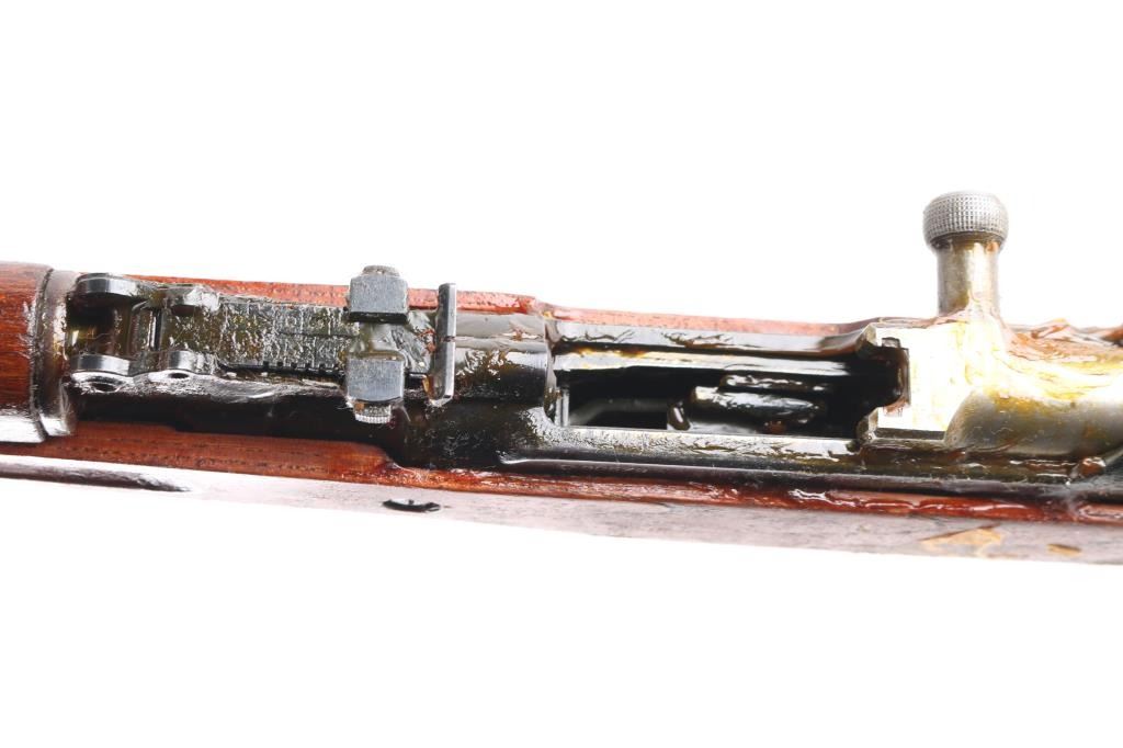 Zastava M59 PAP, also known as Papovka, is a Yugoslav licensed version of Soviet SKS semi-automatic rifle.'Mdl 59' Yugoslavian made gas-operated semi automatic rifle chambered in 7.62x39mm. Imported by CAI, right barrel. Features a blued finish, 20.5" barrel, hooded post front sight, tangent rear sight graduated to1,000 meters, cleaning rod missing, folding blade bayonet, manual safety, smooth trigger, fixed 10 round magazine, smooth wood handguard, pistol grip shoulder stock and trapdoor metal buttplate. Rifle has a heavy coat of cosmoline from storage, bolt carrier is locked to the rear, stuck due to dried cosmoline, needs cleaning. Serial number matches on the receiver, bolt carrier, triggerguard, and stock. Rifle retains approximately 98% of it's blued finish, bore appears good, strong rifling, has some dried cosmoline, needs cleaning, and wood stocks are very good. Serial numbers puts it at pre 1967,