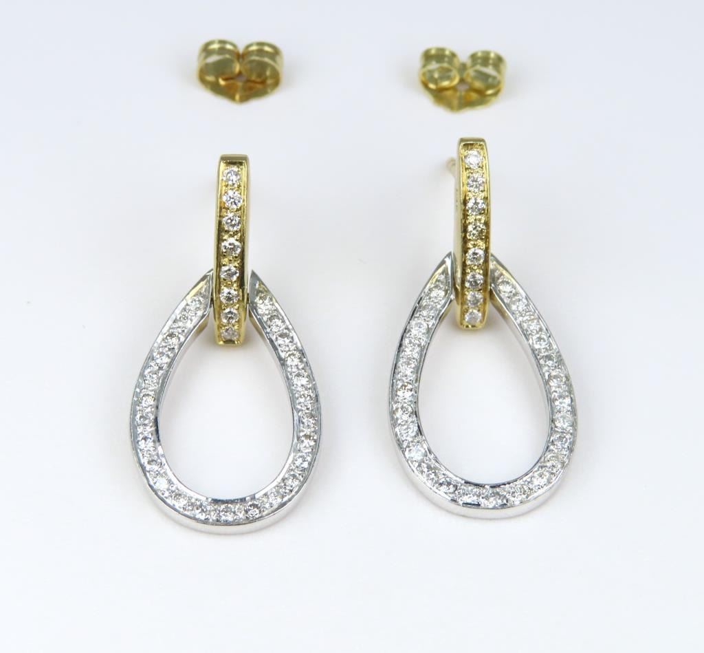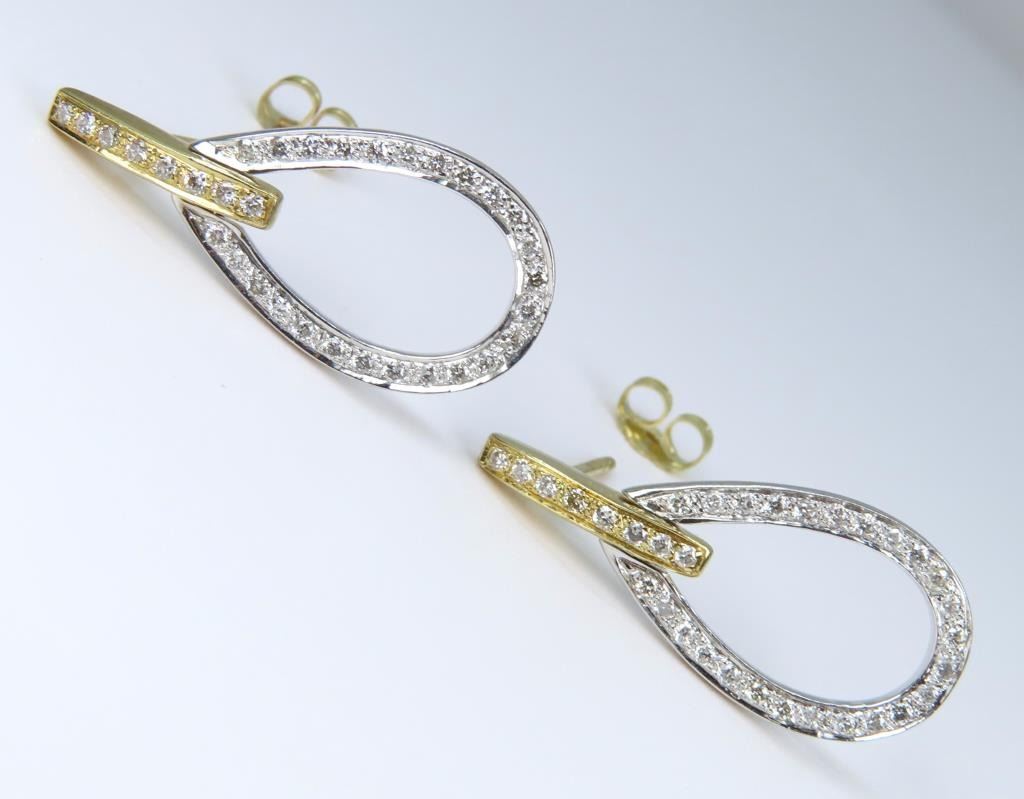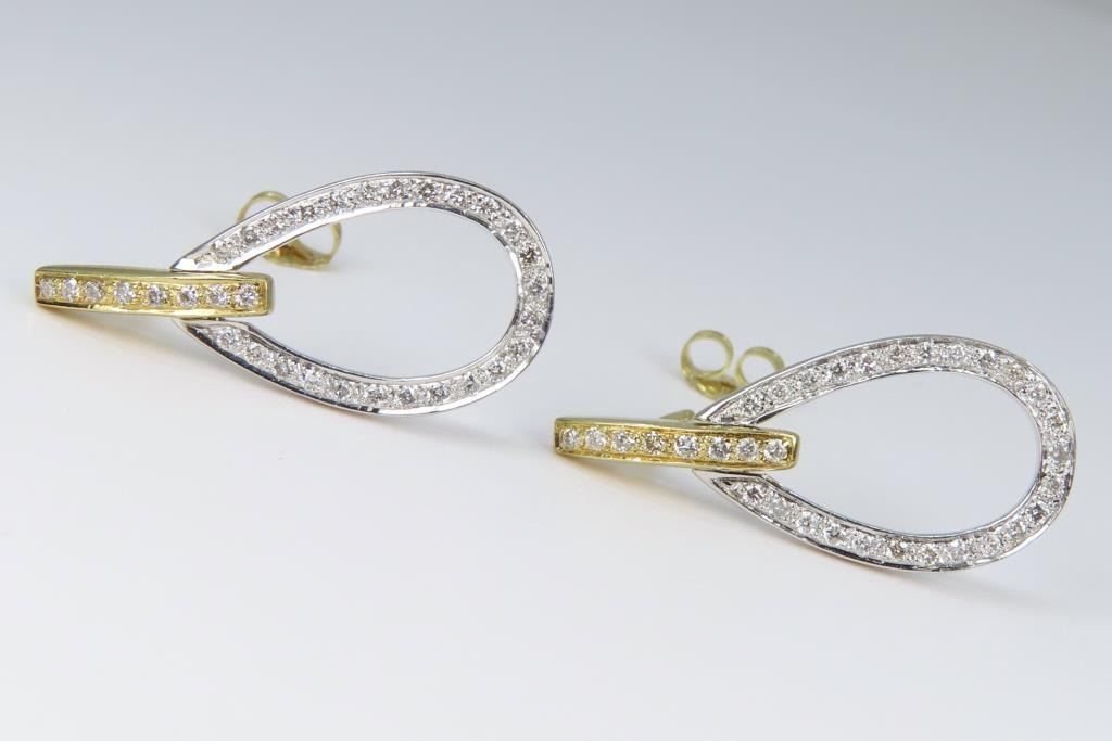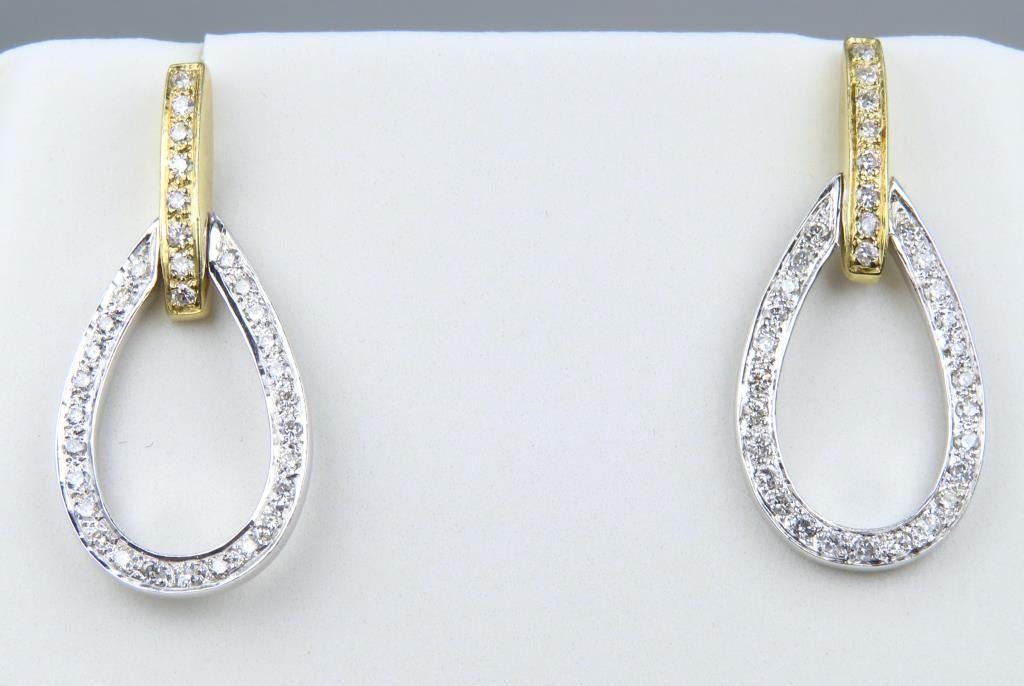 featuring 60 round Diamonds weighing approx. 0.50 carats with G-H colors and VS-SI clarity micro set in tear drop shaped 14 karat white and yellow gold settings.