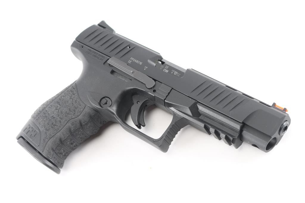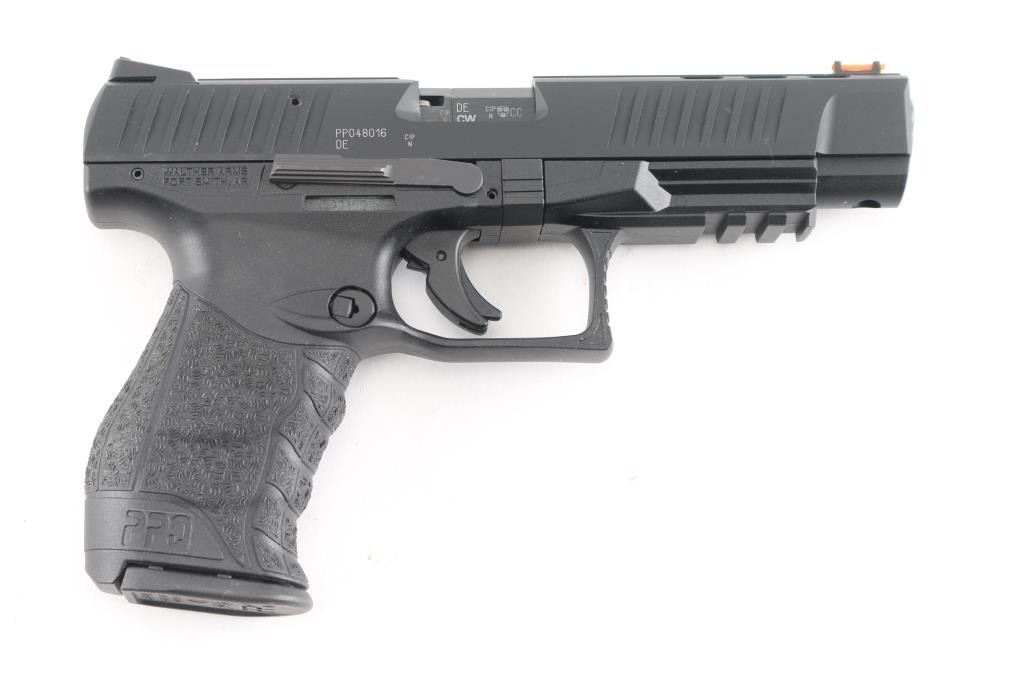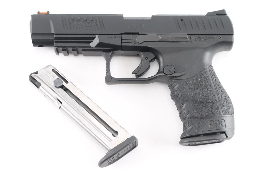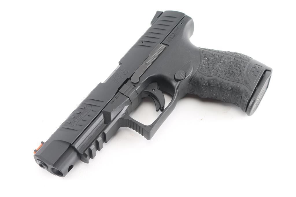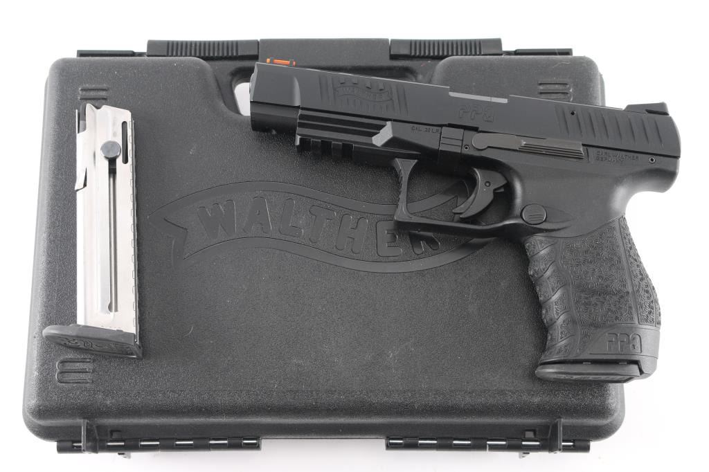 Semi-automatic striker fired rimfire target pistol chambered in 22 Long Rifle. Manufactured in Germany, imported by Walther Arms of Fort Smith, AR. Features a black Tenifer finished slide with fore & aft cocking serrations, lightening cuts to top of slide, 5” barrel, fiber optic insert front sight, adjustable rear sight, integrated trigger safety, ambidextrous slide catch, push button mag release, fiberglass-reinforced polymer frame with integral accessory rail. Bore is excellent. Pistol retains 98% finish and condition of polymer, with minor handling marks. Numbers match on frame, slide, barrel. Includes the original factory hard case with manual, spare magazine, small assortment of tools, spare front sight.