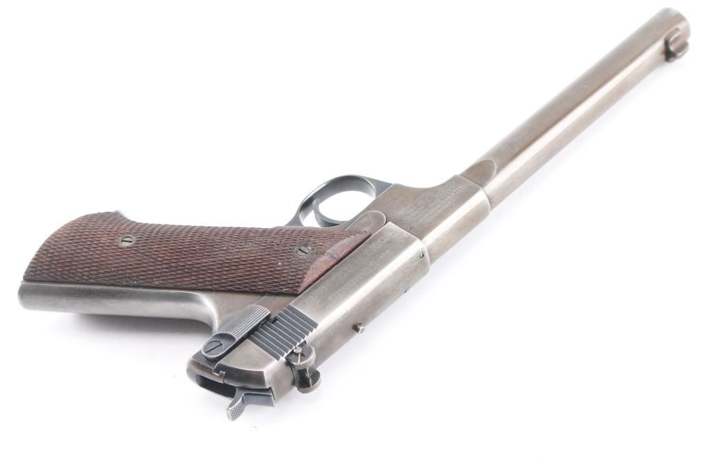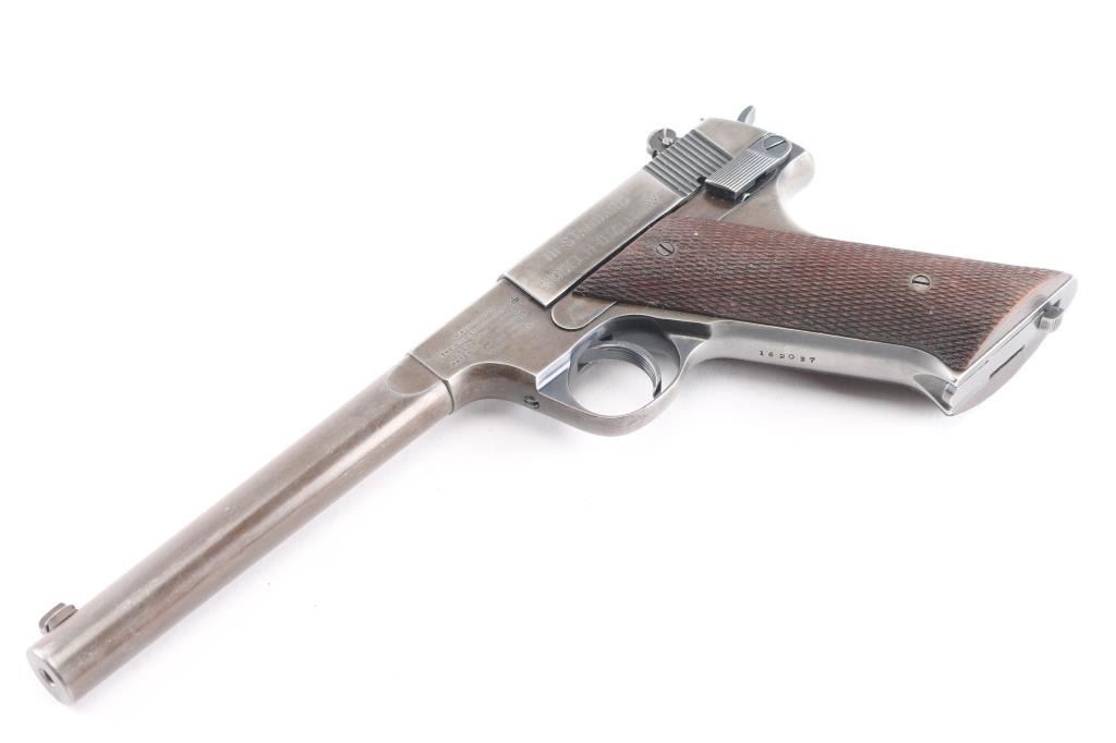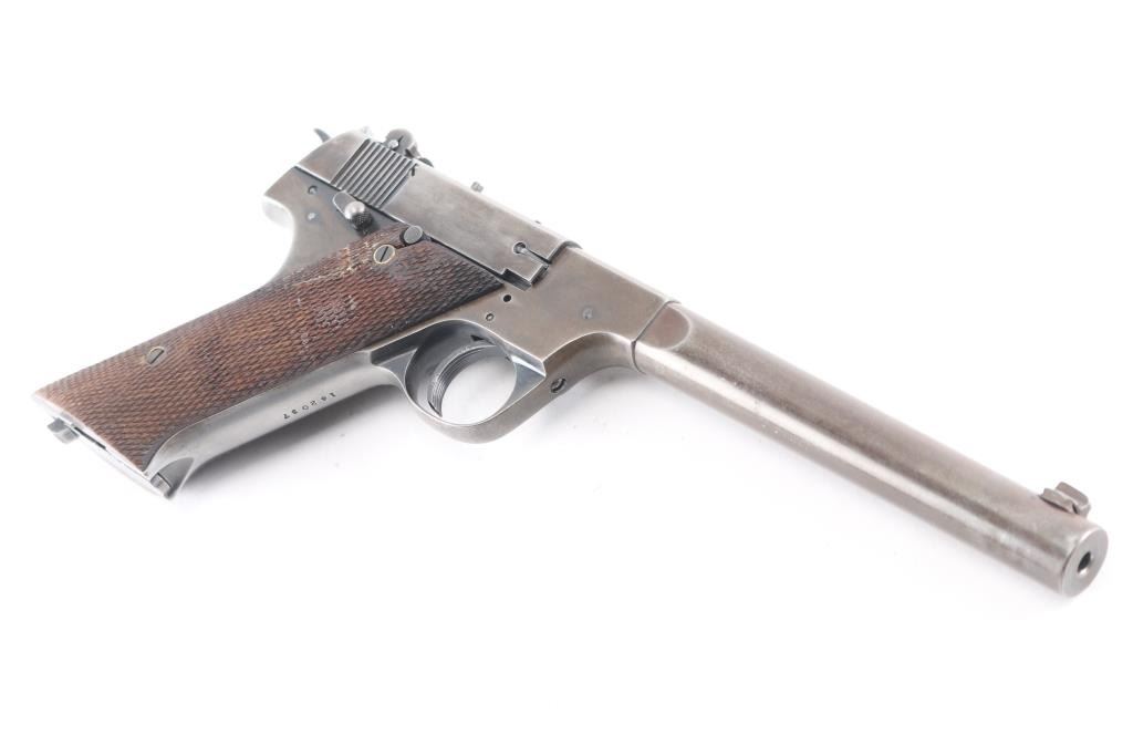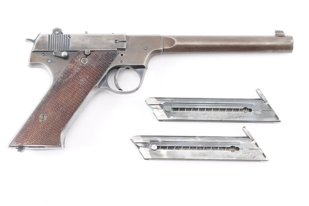 Semiautomatic rimfire pistol manufactured circa 1945. Features blued finish, checkered walnut grips, 6.75" heavy round barrel with shrouded breech, adjustable sights, manual safety, slide stop lever, heel magazine release, external hammer. Bore is excellent/bright. Retains about 20% blue, with most of the rest turned a gray/brown patina with bare metal on the straps. Grips are good overall with a crack repaired with glue on the right panel. Includes (3) magazines.
