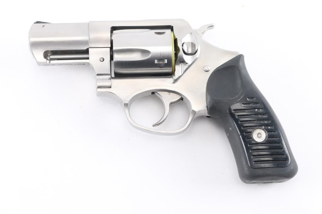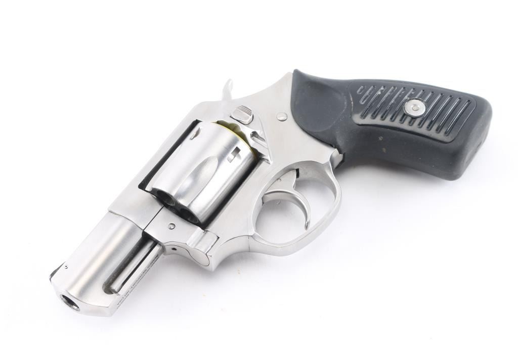 Compact double action revolver features stainless steel construction, 2.25" barrel with fixed sights, 5 shot fluted cylinder, black rubber grip with grooved plastic side panels. Bore and chambers are excellent condition. Overall condition is like new, with few signs of handling, few scratches. Includes original factory hard plastic box with small collection of moon clips.