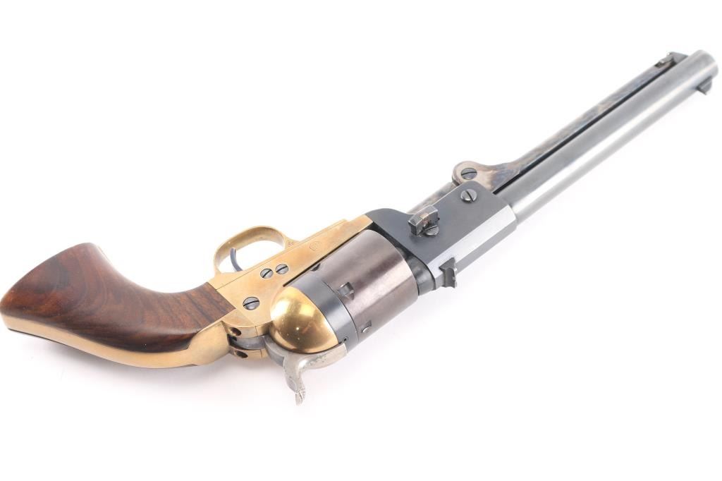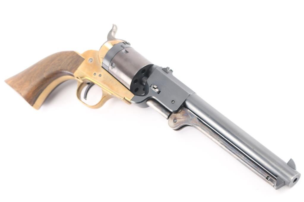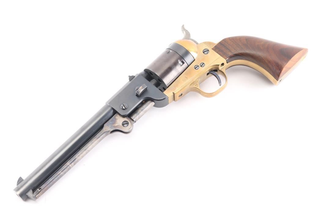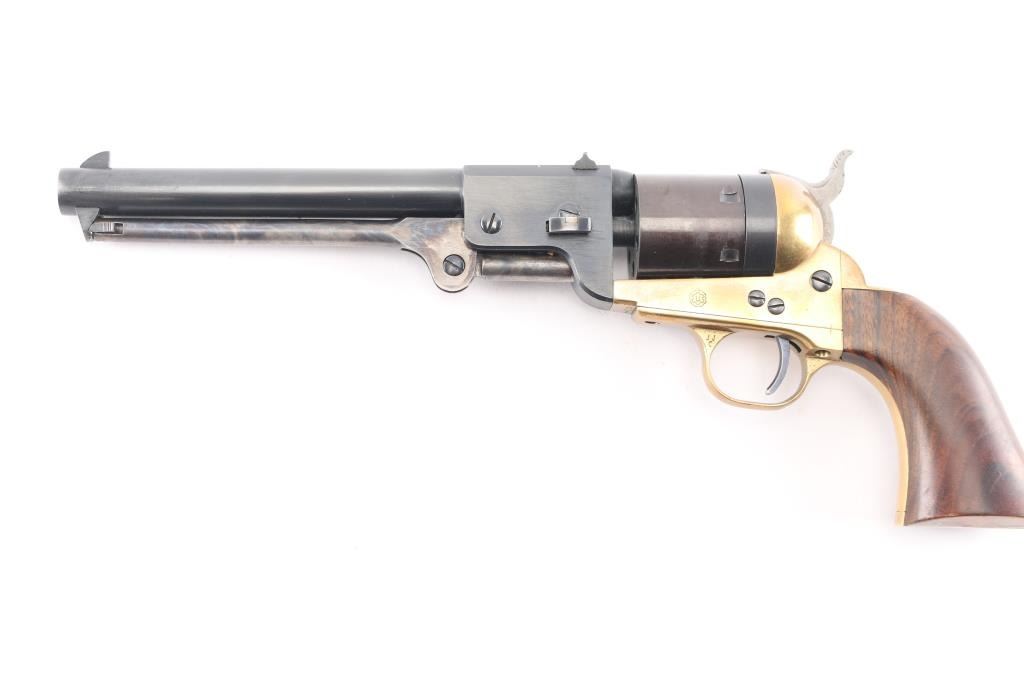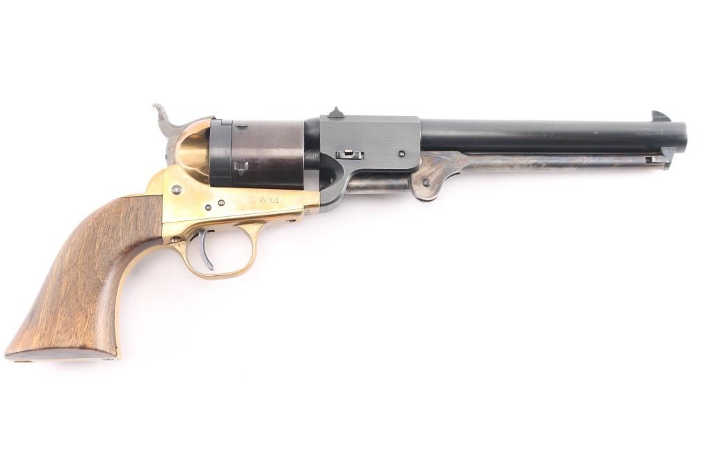 Italian made reproduction of the Colt 1851 Navy percussion revolver, that was converted to fire .22 LR. retaining the loading lever. Features a blued & case hardened finish, 7 1/2" round barrel, blade front sight, dovetailed square-notch rear, smooth thin trigger, knurled hammer spur, non- fluted 6 shot conversion cylinder, brass grip frame and one-piece smooth, wood grip. Naval battle scene on cylinder, loading lever is in two pieces with rod in channel to act as the ejector rod. Revolver is in very good condition with some minor scratches. Bore is excellent/bright, finishes, grips are very good, action is smooth,