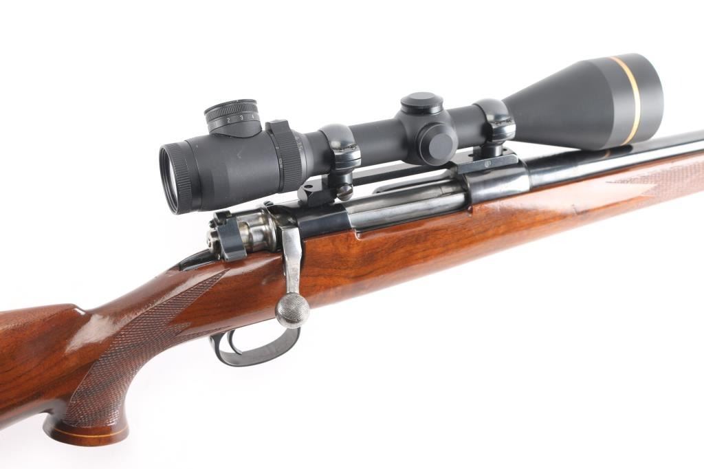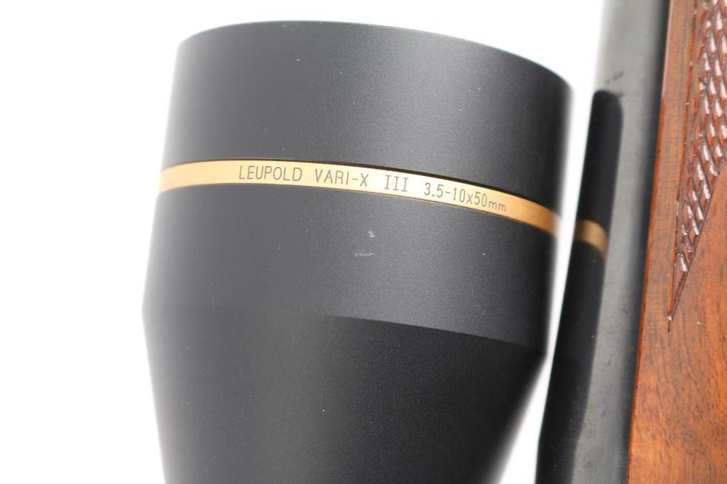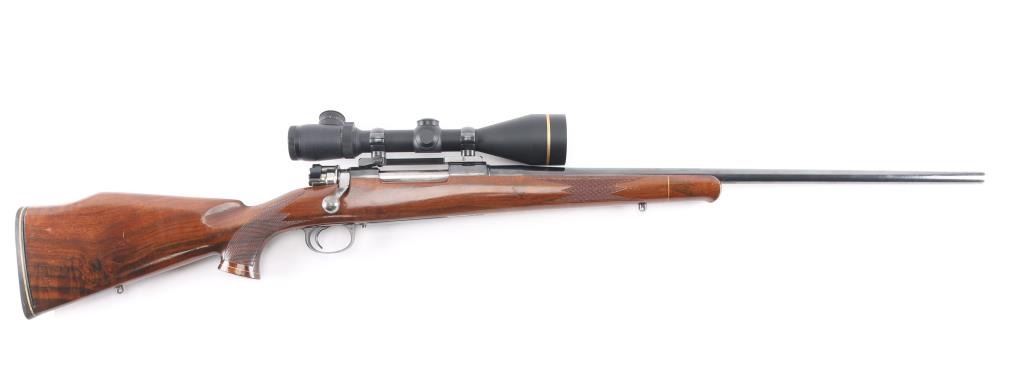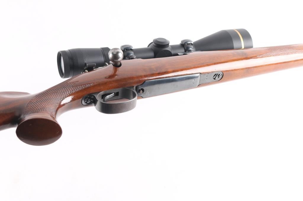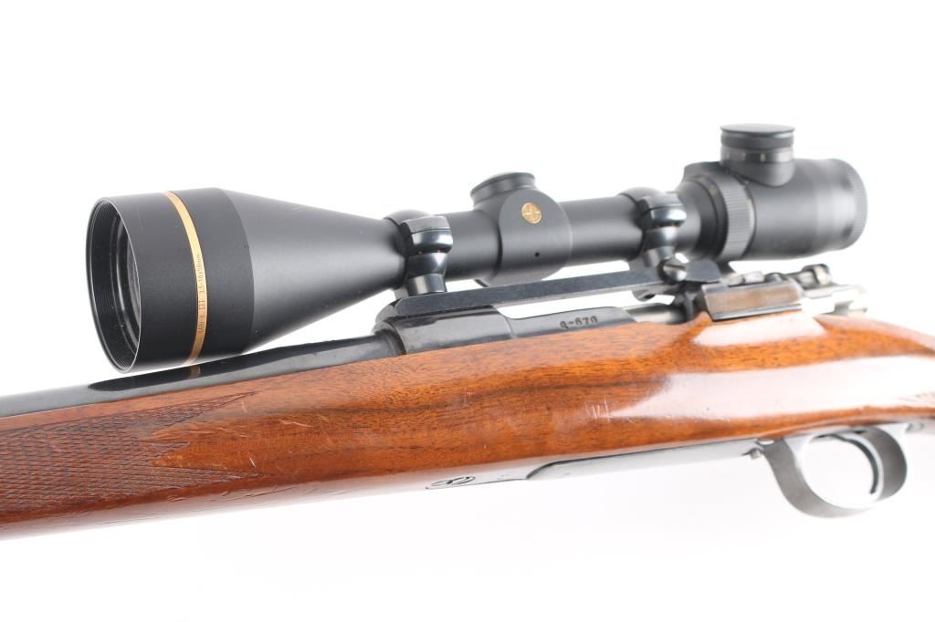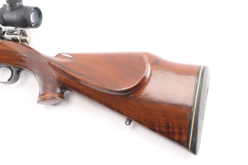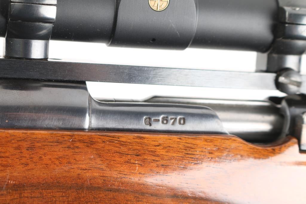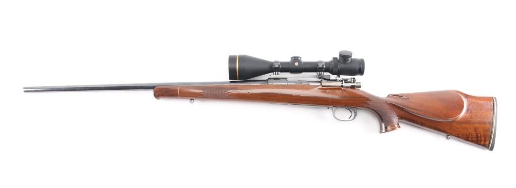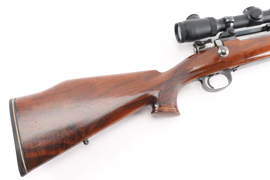 Custom built bolt action sporting rifle chambered in .257 Roberts. Utilizes a 98 Mauser action which has been scrubbed of markings other that the serial number. This work on this rifle is well done, probably by Matthews of Downey, CA (who this old time collector used exclusively for his repairs & custom work). Features a blued finish, 24” round tapered medium weight barrel with no provisions for sights, Leupold Vari-X III 3.5-10x 50mm scope with illuminated reticle mounted with a one-piece Redfield base, serrated curved trigger, two-position Buehler low-swing safety, turned-down & swept back bolt handle with single panel checkering on the knob, internal box magazine with removable floorplate and 1950’s style Monte Carlo walnut stock with flared semi-pistol grip, contrasting Schnabel forend tip/grip cap, multi-point checkering, sling swivel studs, right handed cheekpiece, White Line thin recoil pad & 13 7/8” LOP. The barrel is marked “J.A.” under the caliber marking on the barrel. Rifle retains approximately 85% of its blued finish showing moderate wear with a small amount of surface rust observed. The action is mechanically sound, the bore is excellent, the optics are clear/sharp (battery appears dead for illuminated reticle), and the figured walnut stock is very good with moderate blemishes.