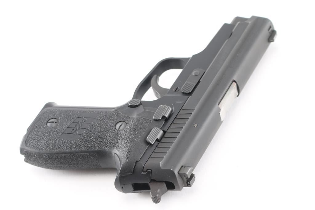 Semiautomatic pistol, frame made in Germany, imported by SIGARMS, Exeter NH. Features matte black finish, stippled black plastic grips, 3.8" barrel, dovetail mounted night sights, frame mounted decocker, double/single action trigger. Bore is very good condition. Retains 95% finish with edge losses. Night sights retain very little glow. Includes factory plastic box, (1) 10 rd magazine.