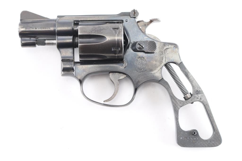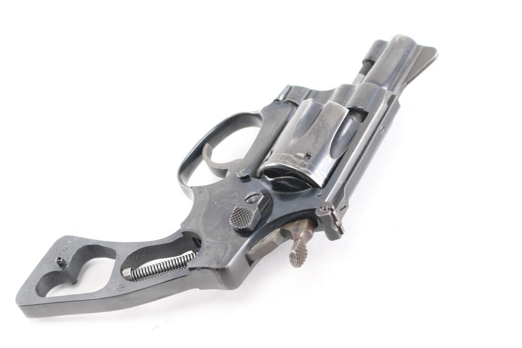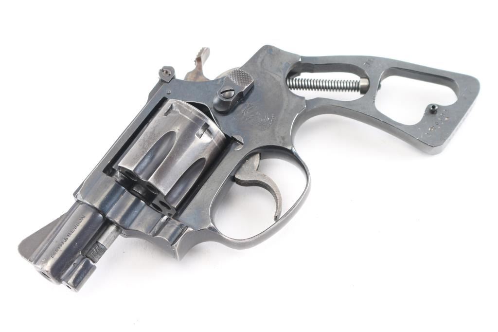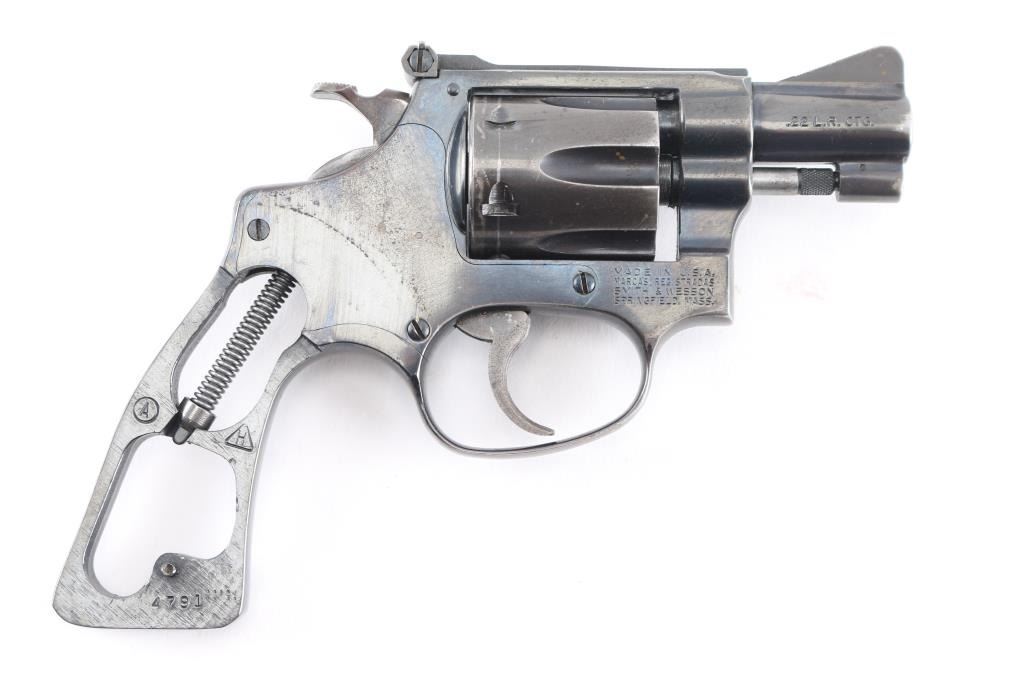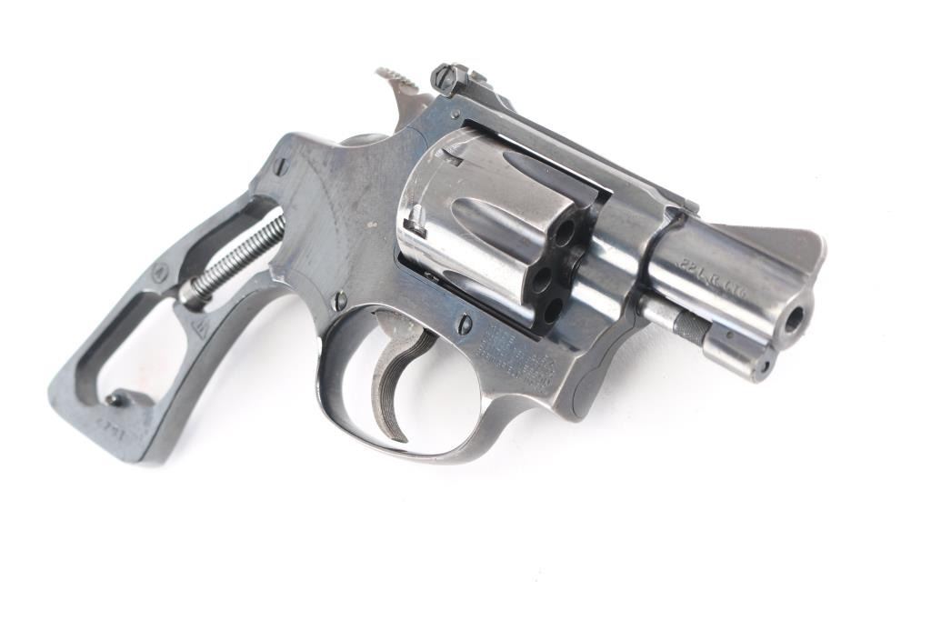 Double action rimfire revolver circa 1981. Features blued finish, 2" barrel, serrated ramp front and adjustable rear sights, square butt, "J" frame, 6 shot fluted cylinder. No grips. Bore is very good, needs cleaning. Retains 80% finish, with muzzle wear, edge losses, drag line, losses around rear of cylinder. Action is smooth with good lock-up. Needs adjustment or repair, as cylinder is sometimes very hard to open, cylinder has end shake, barrel cylinder gap issues, maybe other similar conditions.