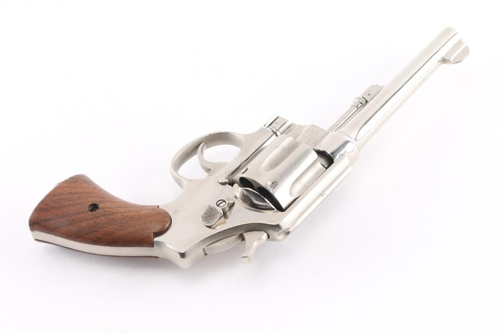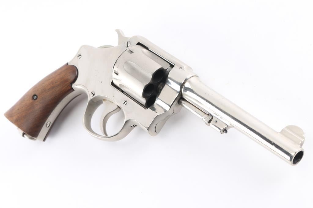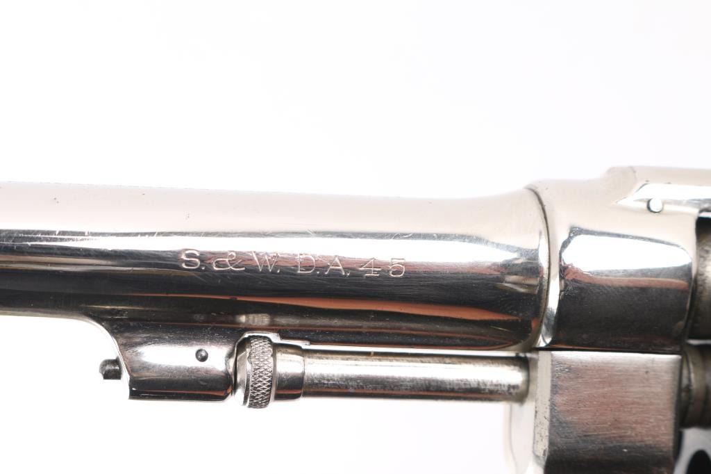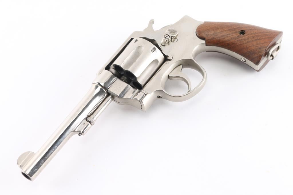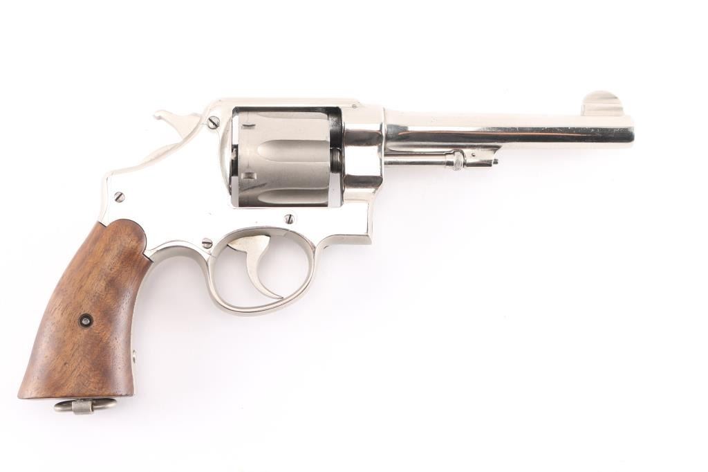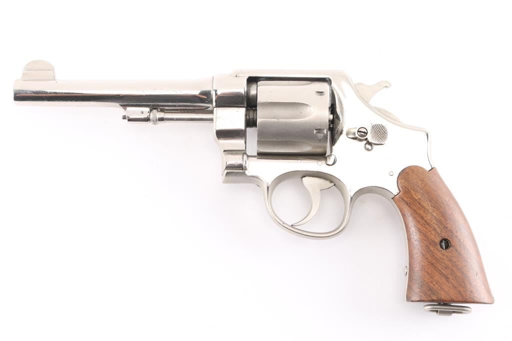 SN: 36275. This revolver has been chrome plated. WWI era U.S. Army contract large frame double-action service revolver chambered in .45 Auto, manufactured in Springfield, MA . Features a chrome plated finish with matte cylinder, top strap, and grip frame, pinned 5.5" tapered barrel, forged round blade front sight, "u" notched rear sight, fluted six-shot swing-out cylinder, non-shrouded ejector rod, case hardened .265" smooth trigger, case hardened .265" hammer with knurled spur, five screw square butt N service frame with lanyard ring on the butt, and smooth walnut grips. Mismatched serial numbers on the barrel, cylinder. Other Markings: Frame -"U.S/ARMY/MODEL/1917". Barrel- "SMITH & WESSON SPRINGFIELD MASS. U.S.A./PATENTED DEC.17.1901. FEB.6.1906. SEP.14.1909", "S.&W. D.A. 45", "140462". There is a eagle head proofs. U.S. Property stamp on barrel. The chrome has many minor scratches, the bore has rifling with dark frosting in the grooves, the grips appear to be newer replacements, very good condition.