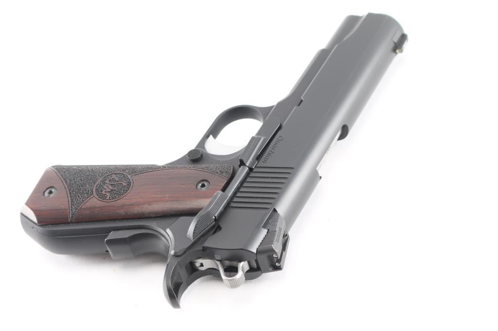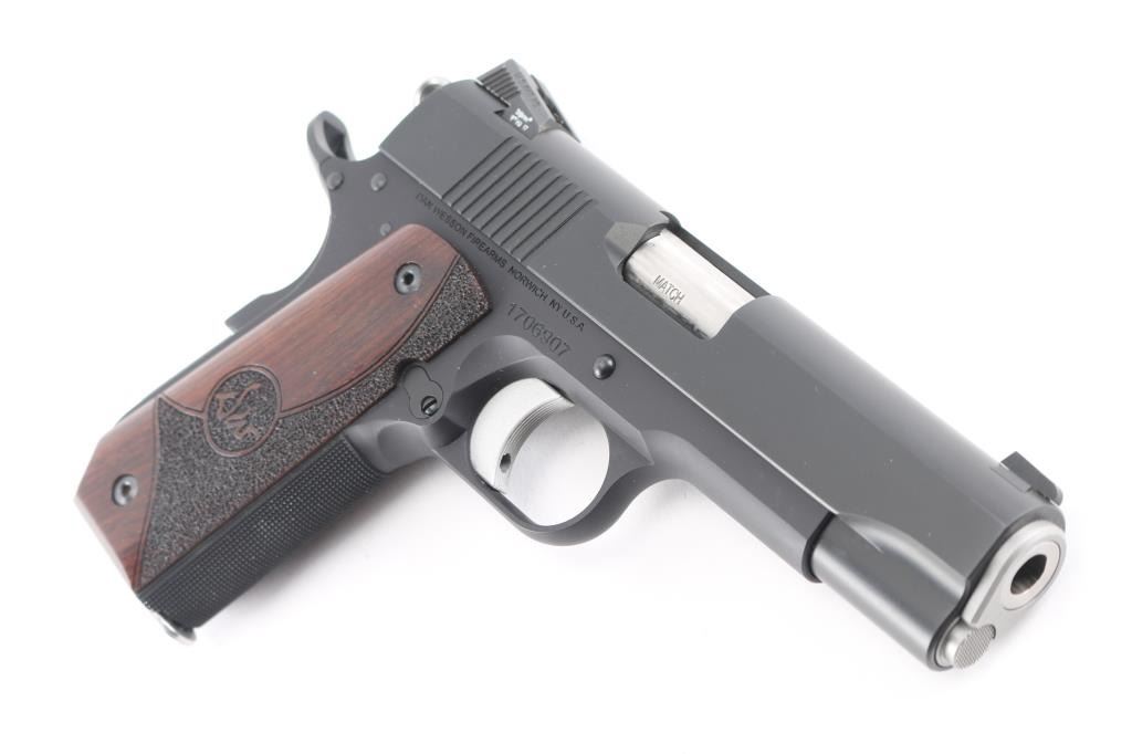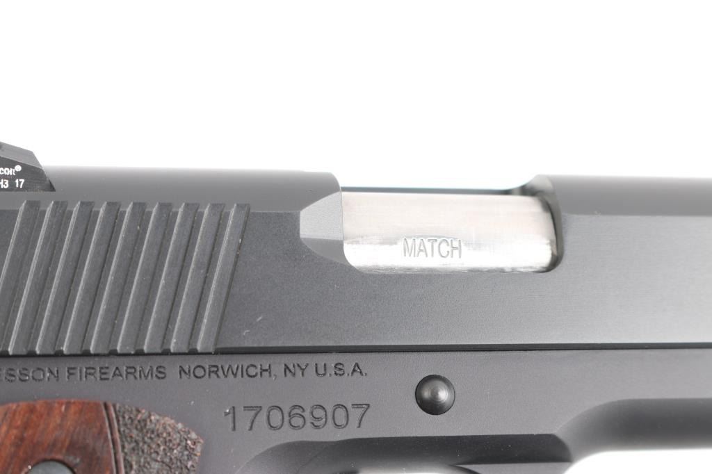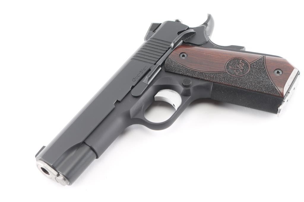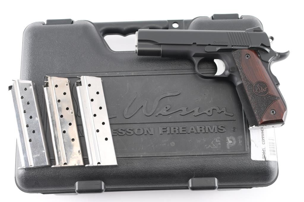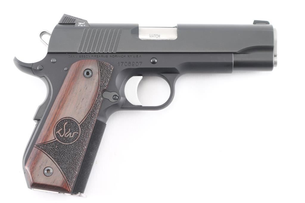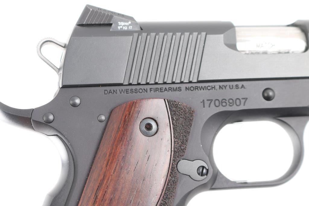 Commander length 1911 type carry pistol. Features 4.25" 'Match' barrel, dovetail mounted nights sights, extended thumb safety, upswept beavertail safety with memory bump, skeletonized hammer, adjustable over travel stop trigger, serrated front strap, smooth mainspring housing with curved butt, matte black finish, Dan Wesson logo wood grips with partially stippled surface. Bore is very good. Retains 98% finish with handling marks. Night sight inserts retain dim glow. Includes original plastic box with paperwork, bushing wrench, four mags (two Dan Wesson, one Kimber, one Mecgar).