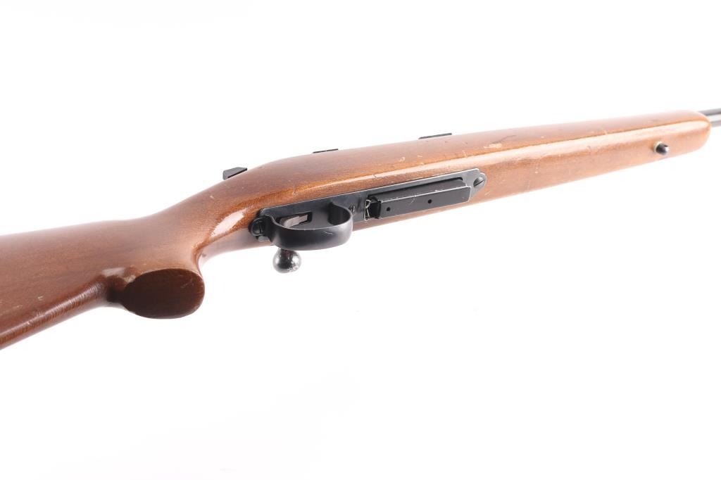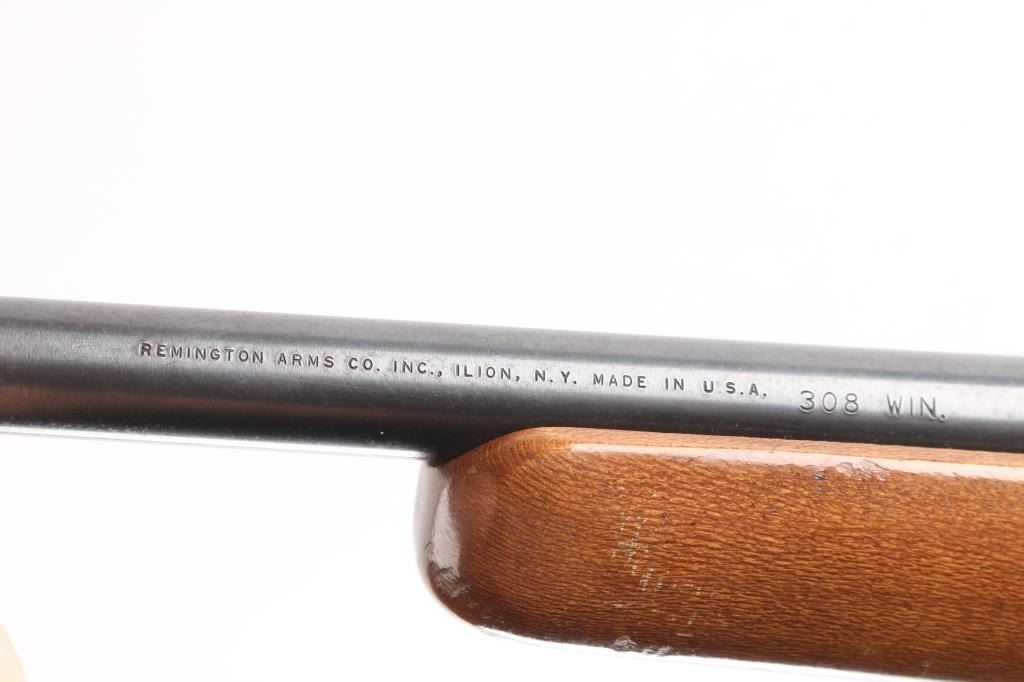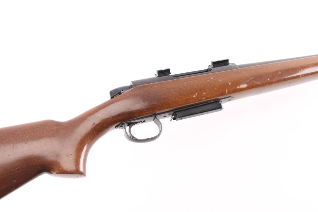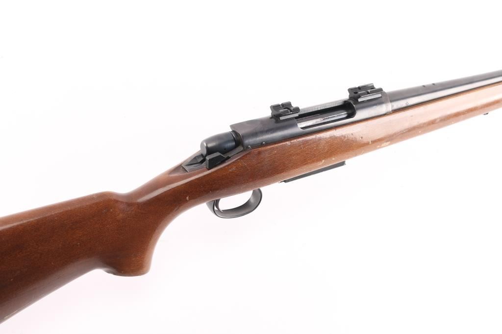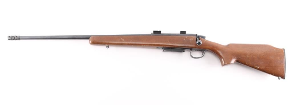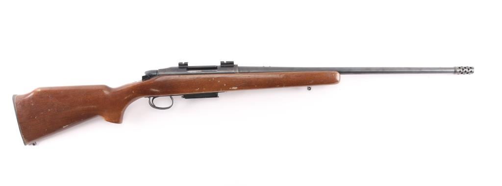 Economic left handed push feed bolt action sporting rifle chambered in .308 Winchester. Date coded 1973. The model 788 debuted in 1967 and was marketed as an inexpensive yet accurate hunting rifle. Features a blued finish, 22" barrel with pepper pot muzzle brake, provisions for sights, two piece Weaver bases on receiver, smooth trigger with beveled edges, stamped steel trigger guard, manual safety on the right side of the receiver, blued bolt with rear locking lugs, 3 round detachable magazine, sling swivel studs, smooth beech semi-pistol grip shoulder stock with high comb, factory knurled metal buttplate. Bore is very good. Rifle retains approx 85% finish showing edge/handing wear. Wood stock is good condition with scratches & scuffs.
