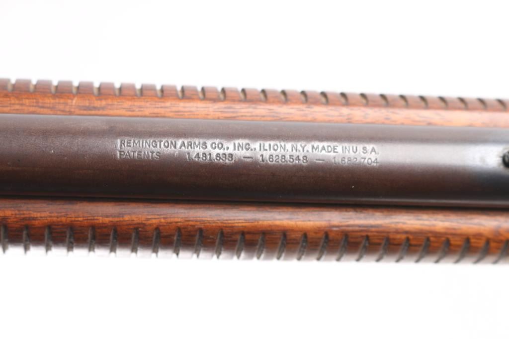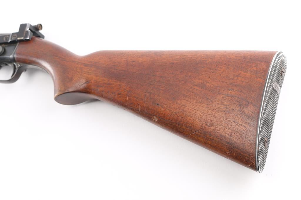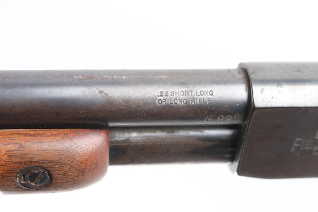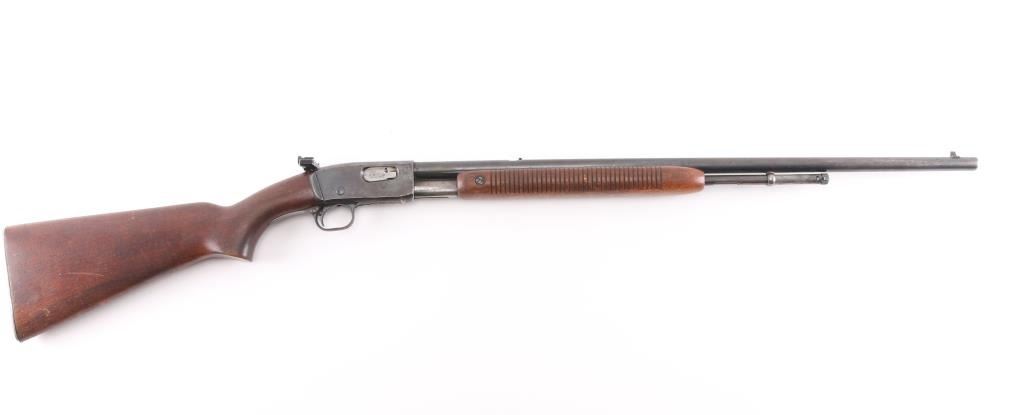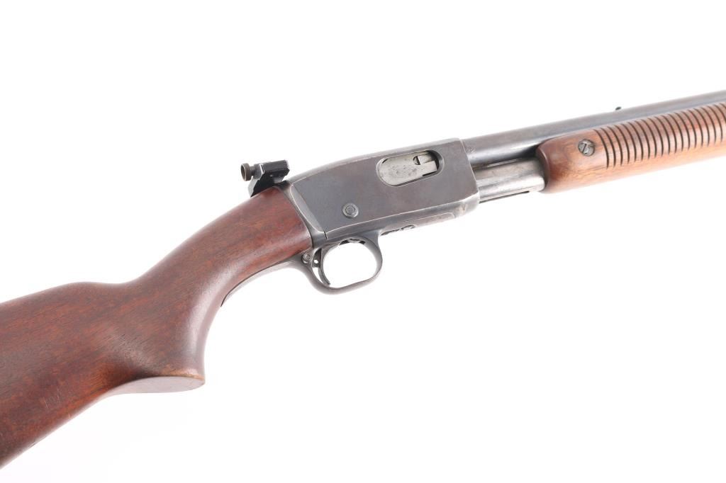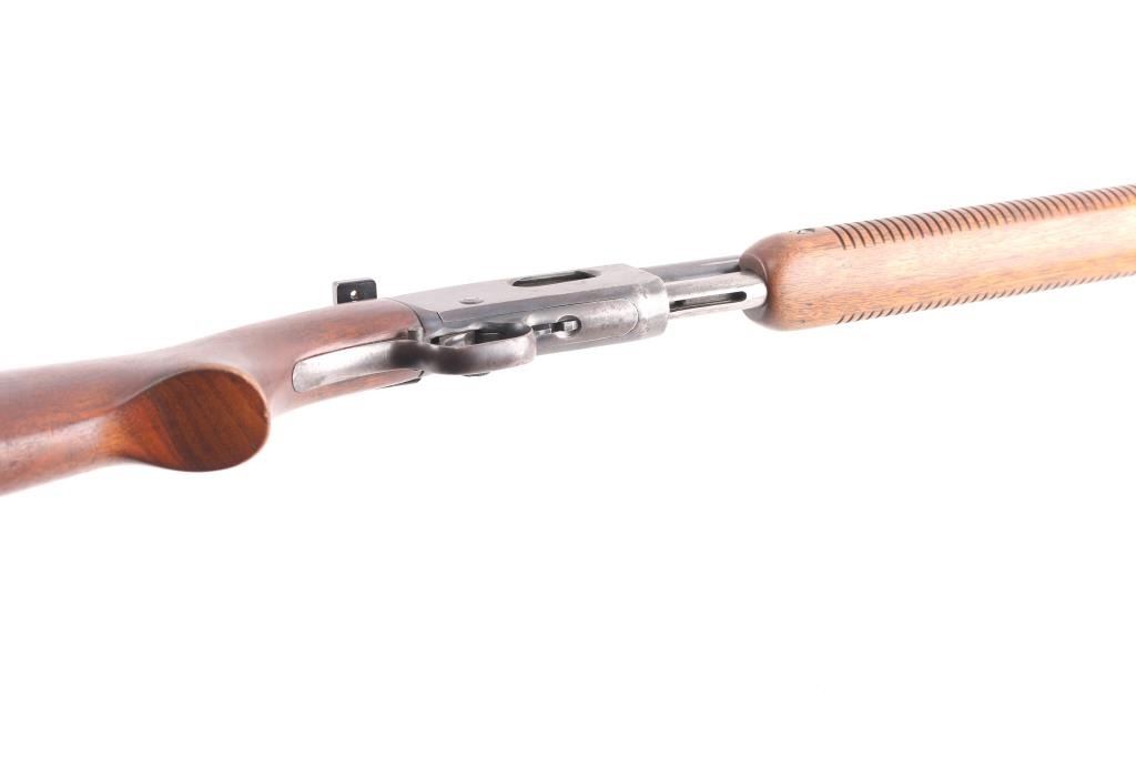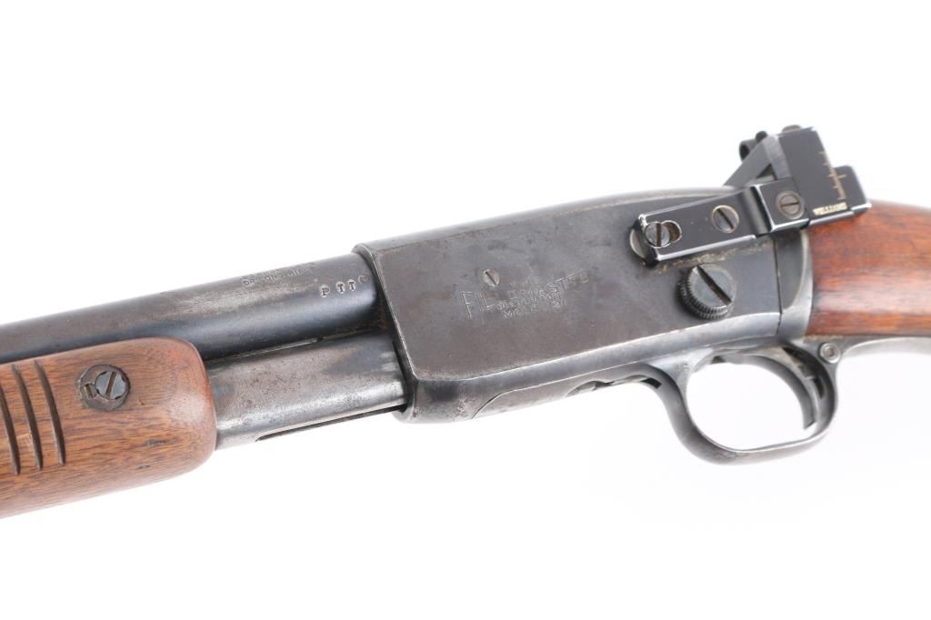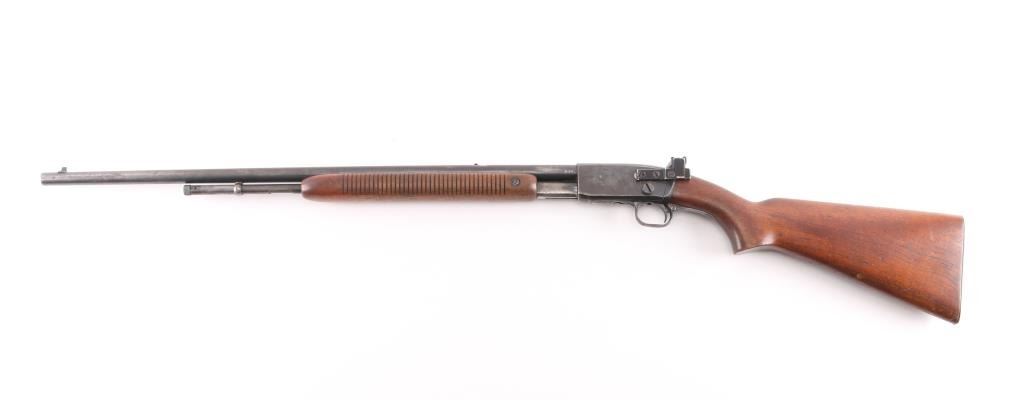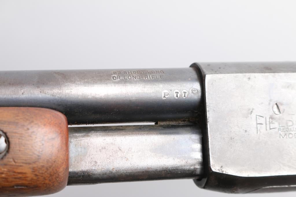 'The Field Master' Take down pump action rimfire rifle manufactured circa 1948. Features blued finish, grooved walnut pump handle, smooth walnut stock with curved grip, factory checkered metal buttplate, 24.5" barrel, blade front sight with bead top, barrel mounted rear sight missing (empty dovetail), Williams receiver mounted peep rear sight, 3/4 length tube magazine, manual safety, takedown screw at receiver. Bore is very good condition. Retains 80% coverage of a faded, brown color finish, some darker gray colors retained, much bare metal, some light patina. Wood is good to very good condition with dents & scratches, some finish losses. Serial number inside receiver.