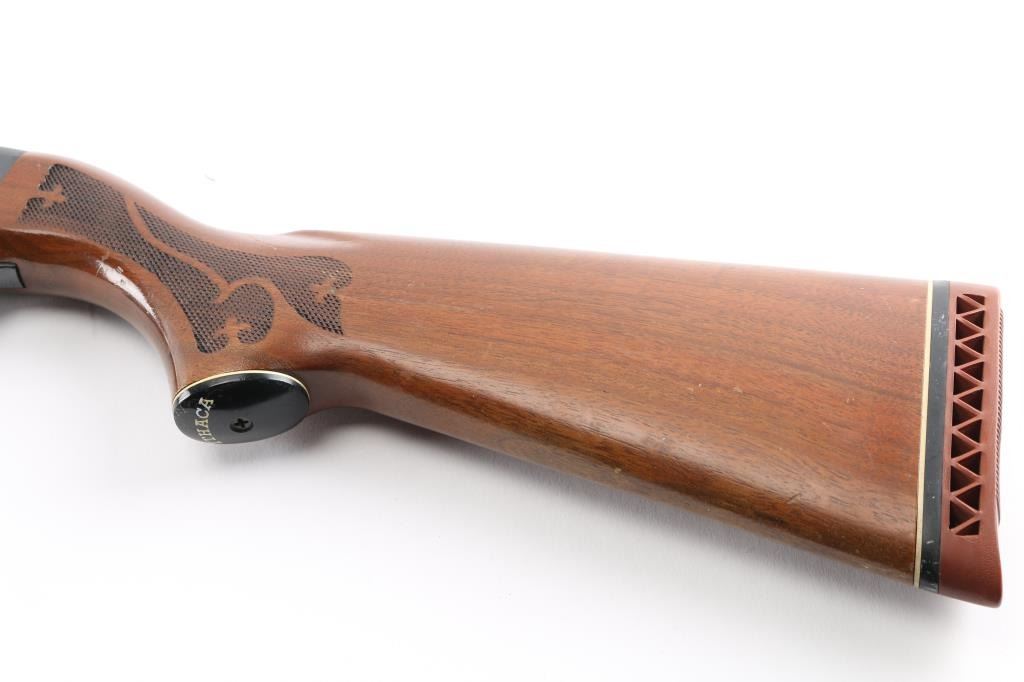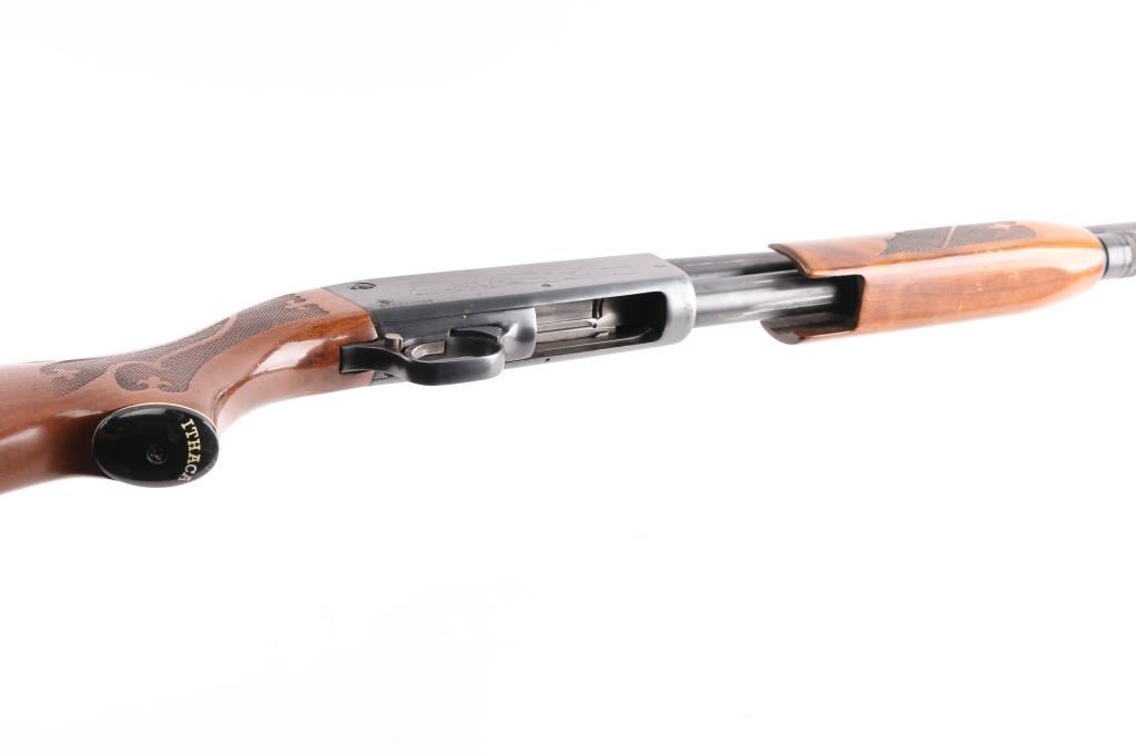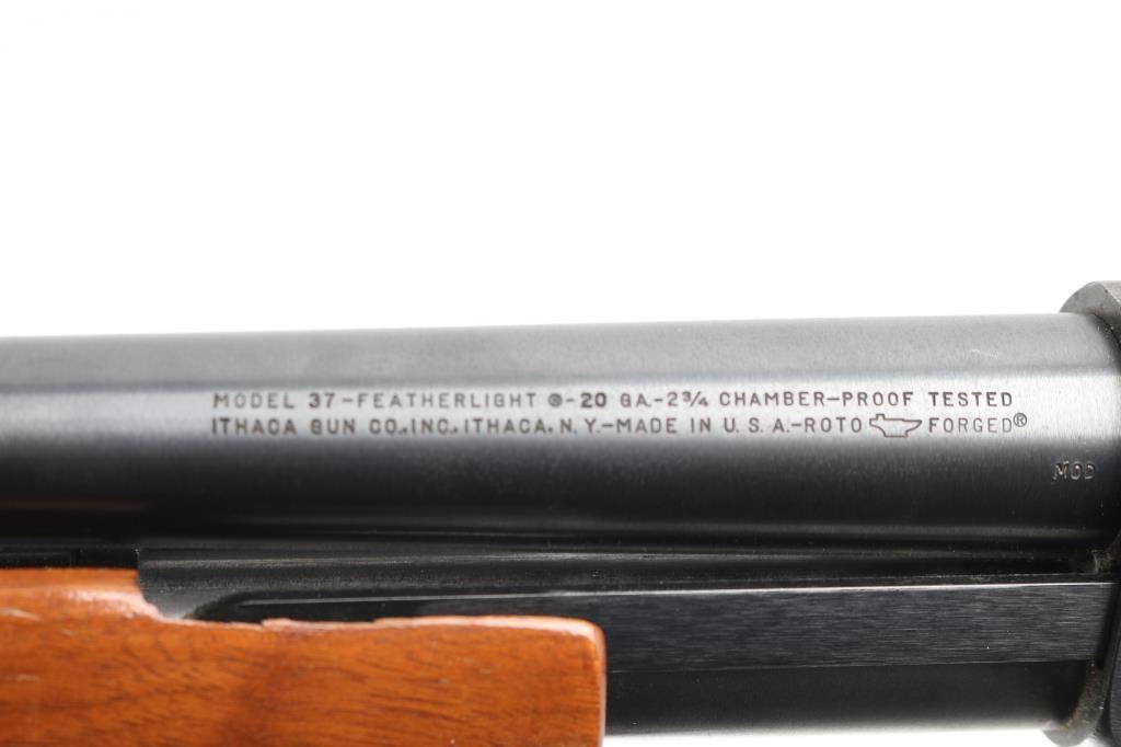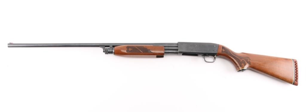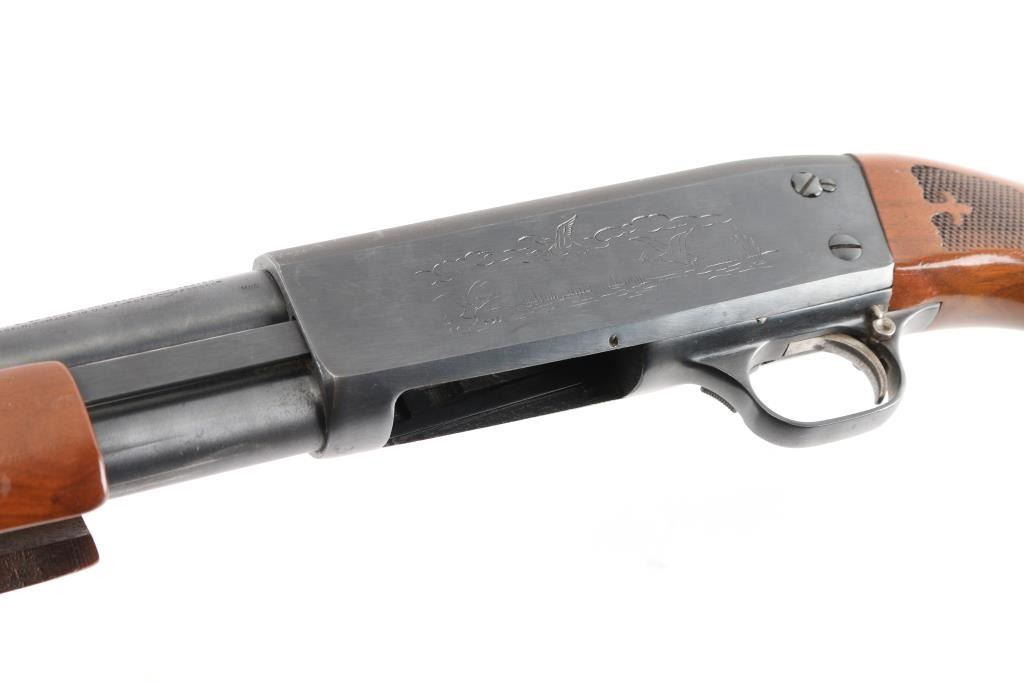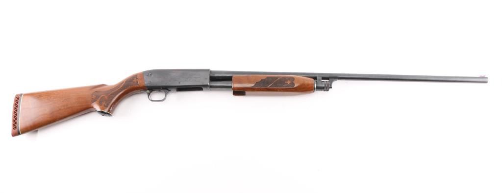 'Featherlight' bottom ejecting pump action repeating shotgun chambered for 2 3/4" shells. Manufactured circa 1972 per factory records. Features 28" plain barrel, MOD choke, orange fiber optic front sight, roll stamped game bird scenes on the receiver, push button safety, single action bar, checkered flat bottomed walnut pump handle, pistol grip shoulder stock with checkering at wrist, ventilated rubber recoil pad. Bore is very good condition. Shotgun retains 85% blued finish showing edge losses & scratches, rubbing wear on moving parts. Top of receiver matte blued. Wood is very good condition, with minor scratches and dents.