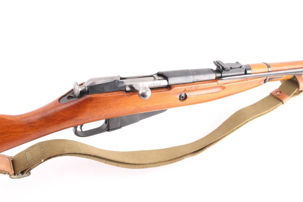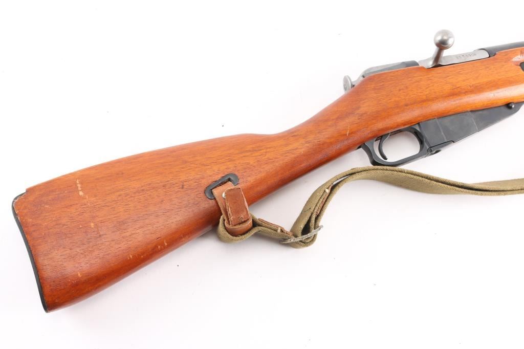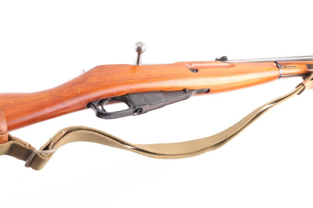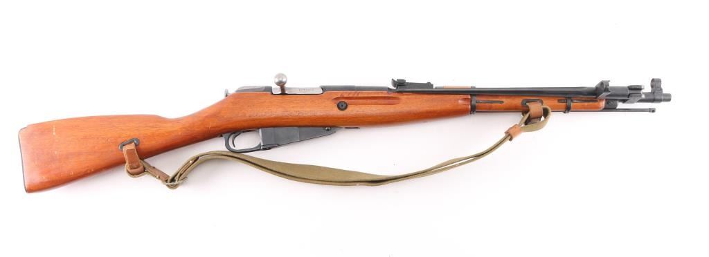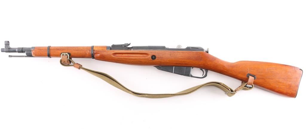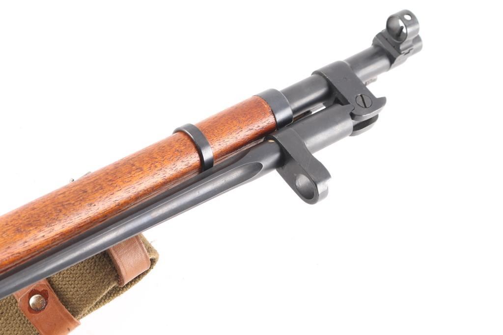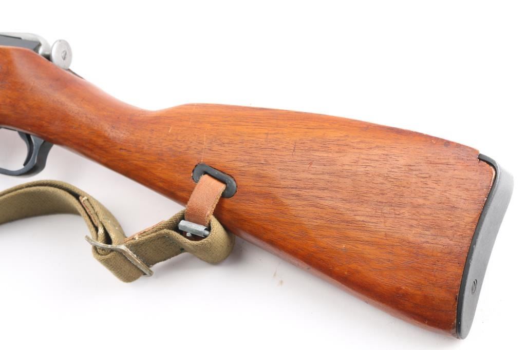 Chinese military bolt action rifle manufactured circa 1954 at the State Factory at Chongqing, import marks on right receiver are incomplete, most likely Navy Arms. Same as Russian M44. Features 20" barrel, post front sight inside protective ring, tangent style rear sight, manual safety, straight bolt handle, sling slots, cleaning rod under barrel folding spike bayonet. Bore is very good condition, strong rifling, needs cleaning. Retains 97% bluing. Bolt assembly is polished. Wood is very good condition, arsenal varnish with scratches & dents. Matching serial number on barrel shank, & bolt, no other SN's observed. Includes good condition khaki color canvass web sling with leather "dog collars".