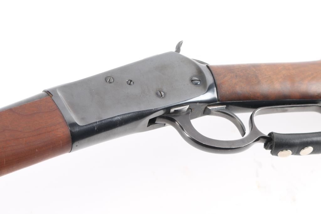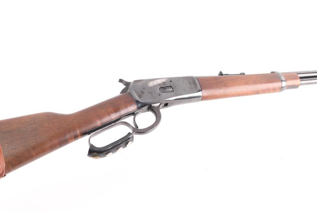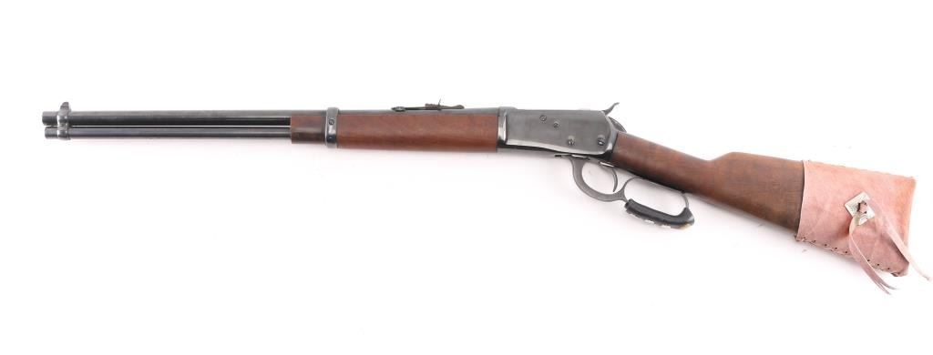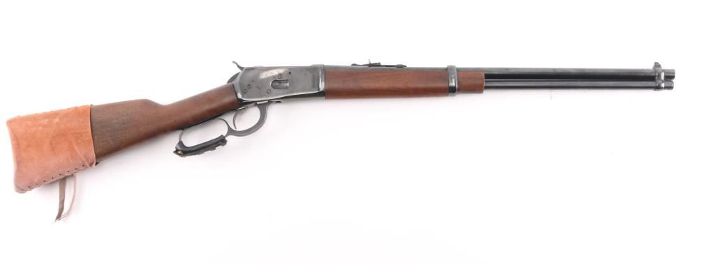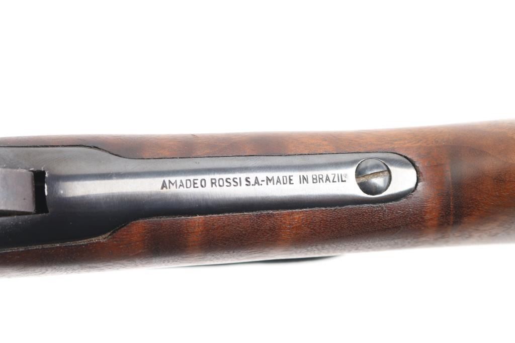 Brazilian made lever action rifle chambered for .357 Magnum and .38 Spl. cartridges. Imported by Interarms, marked on lower tang. It features a 20" blued barrel and receiver A full length magazine tube, barrel banded blade front sight, adjustable rear sight, serrated hammer spur and smooth trigger. The smooth wood stocks have a barrel band on the forearm and a smooth metal butt plate. Metal finish is about. 85% with scratches, finish loss on the lower band, bolt, the right receiver has areas of pitting, and an 1 1/2" area of finish loss/scratches were someone tried to buff it out. Wood stocks look very good with minor signs of handling. Bore looks very good, needs cleaned. Buttstock has brown leather sleeve with concho, & the lever has a black leather, snap-on sleeve.