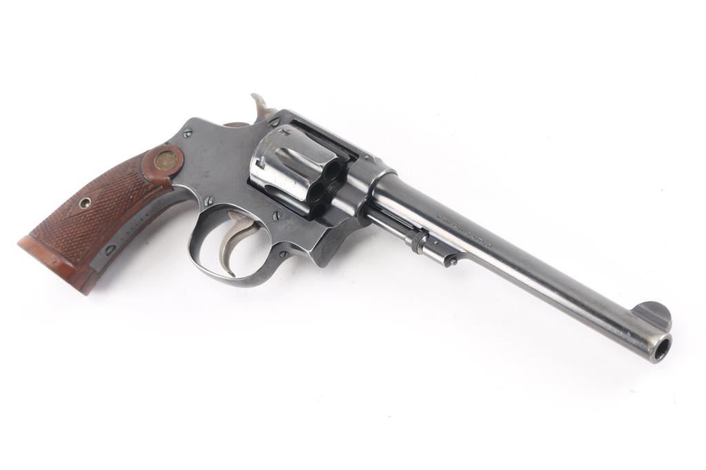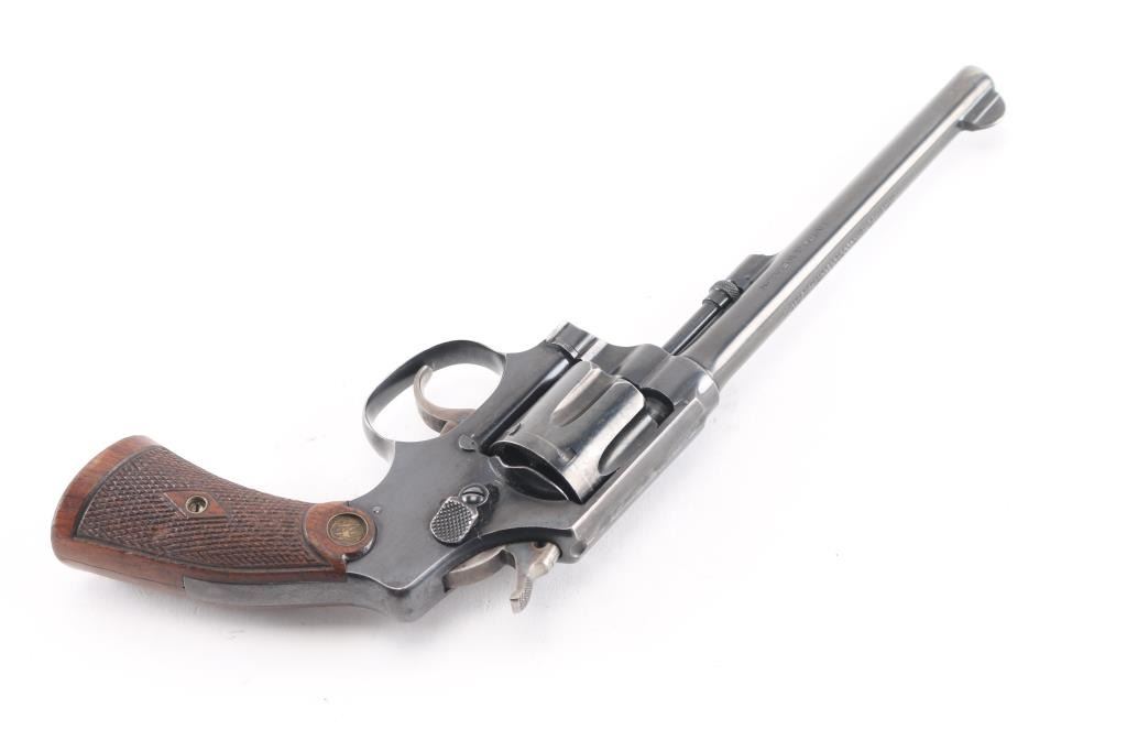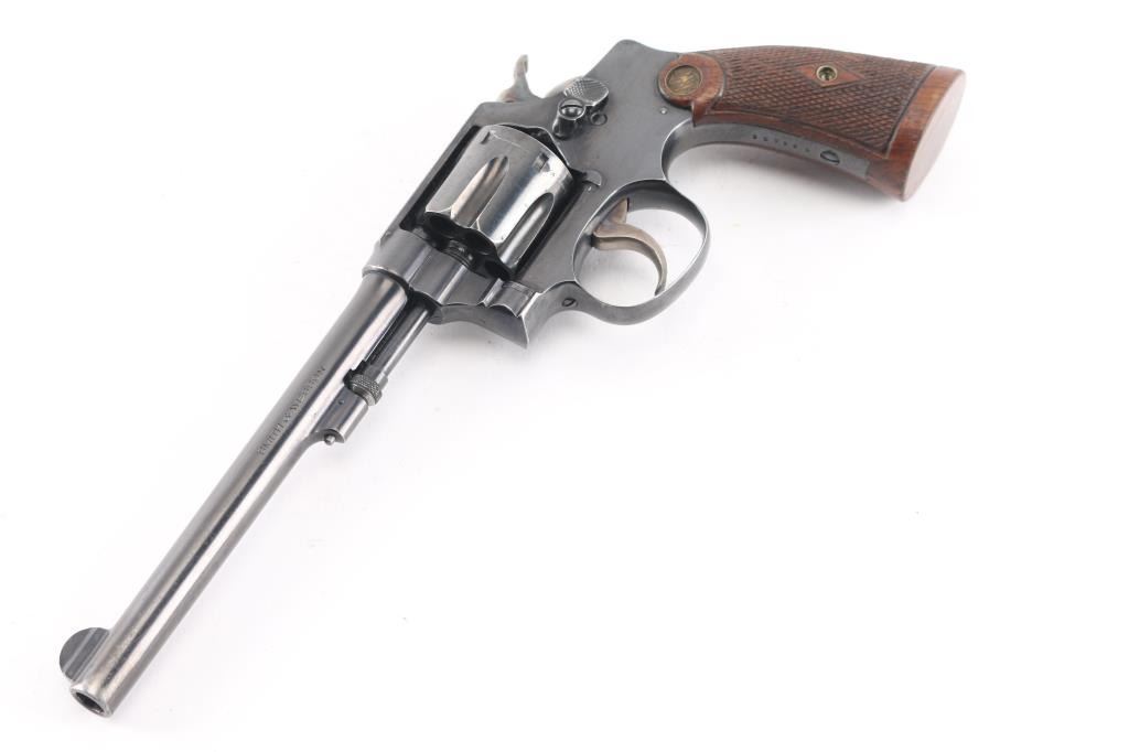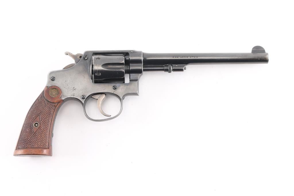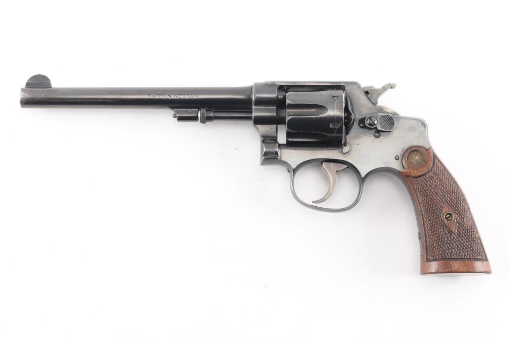 SN: 296426 .32 regulation Police , pre War. (1917-1942) Features a blued finish, pinned 6" barrel, blade front sight, integral notch rear sight, non-shrouded ejector rod, fluted six-shot cylinder, smooth case trigger, case hardened hammer with knurled spur, built on a round butt I frame, two-piece diamond checkered walnut 'extension' grips with S&W medallions. Grips held by two screws, no S&W trade mark, patent date of June 5, 1917 stamped on the underside of left grip. Bore and charge holes are excellent/bright. Retains 92% of the original blue finish. Markings are crisp. Wood grips are very good. Action is smooth with good lock-up. Serial number repeated on cylinder, under barrel, and fore strap.. Assembly number in frame recess matches yoke.