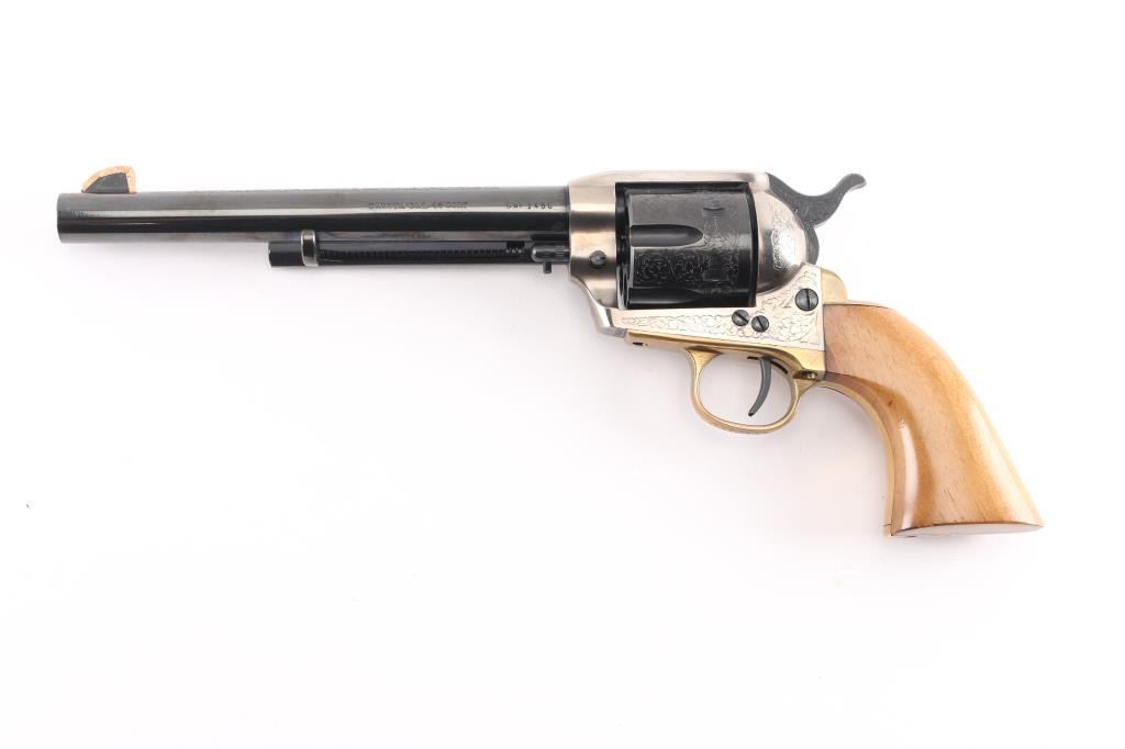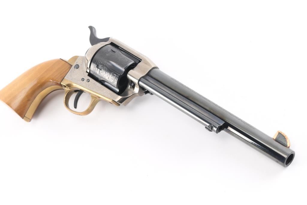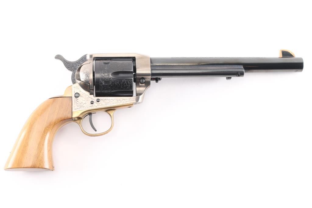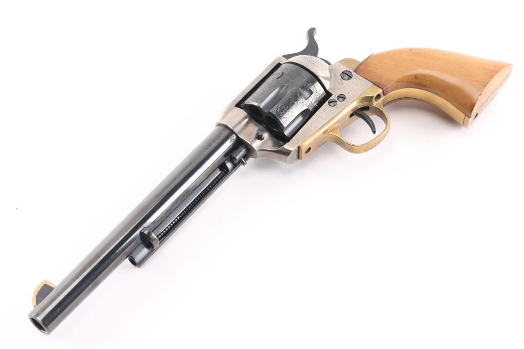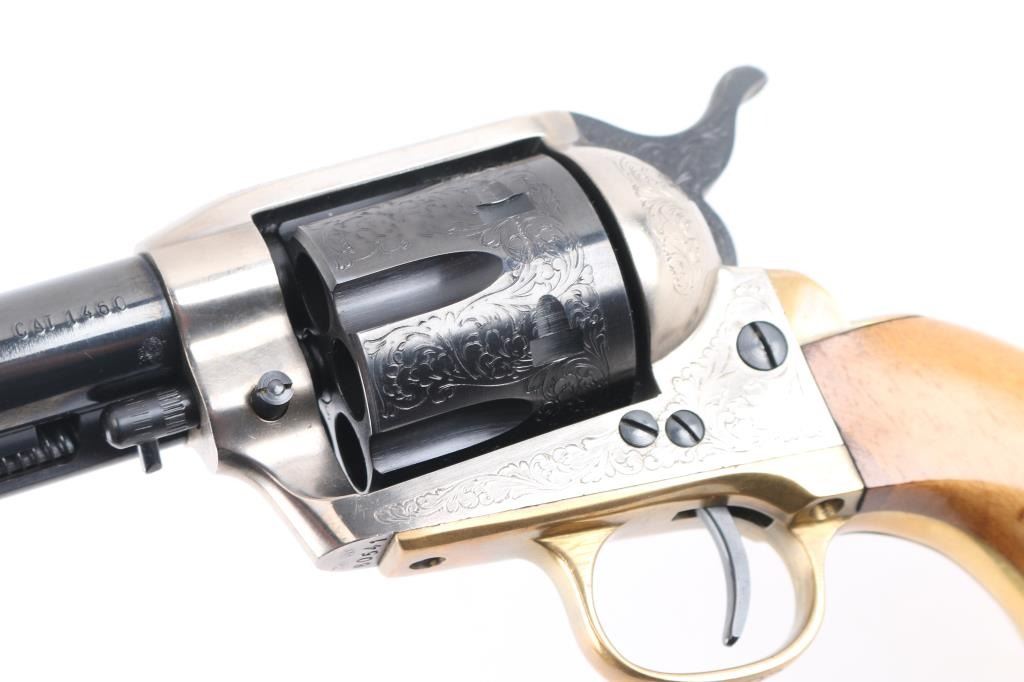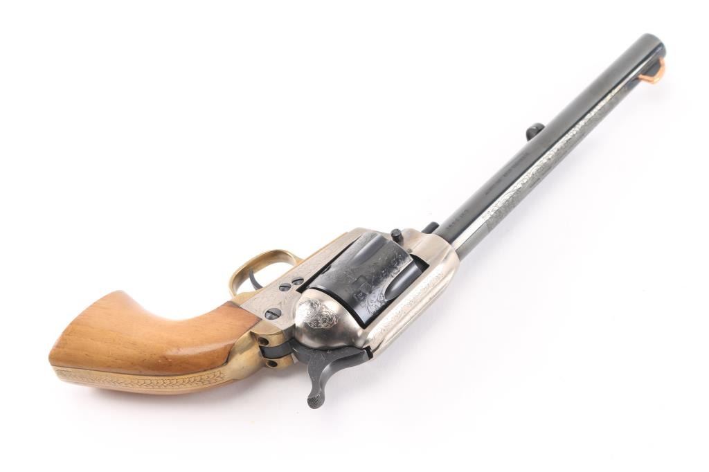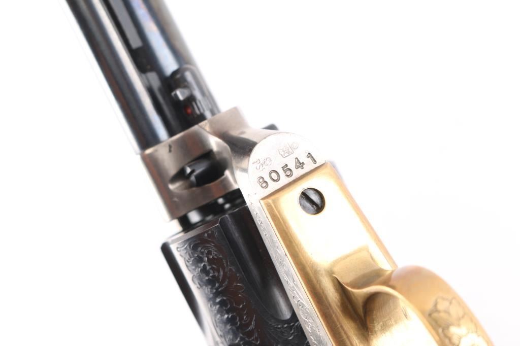 7,5 "barrel with an excellent bore. the sight blade is edged with a thin strip of copper foe better visibility. The barrel, hammer and cylinder retain about 99% original blue, the triggerguard and grip frame are a bright goldenrod patina and the frame is a satin gunmetal gray. This revolver has been extensively and tastefully engraved in a foliate scroll pattern with tight intricate patterns on the cylinder and backstrap and a more loose, open pattern on the barrel and hammer. The smooth walnut grips are about very good with just a few small handling marks. An attractive revolver with crisp action in likely unfired condition.
