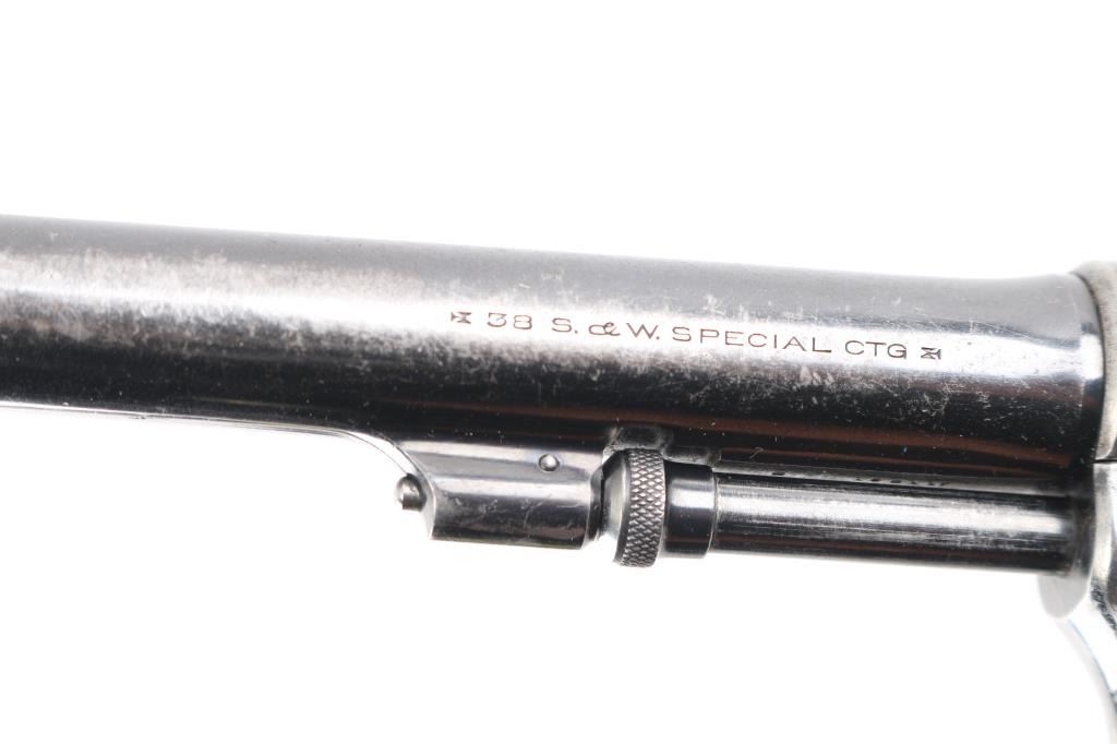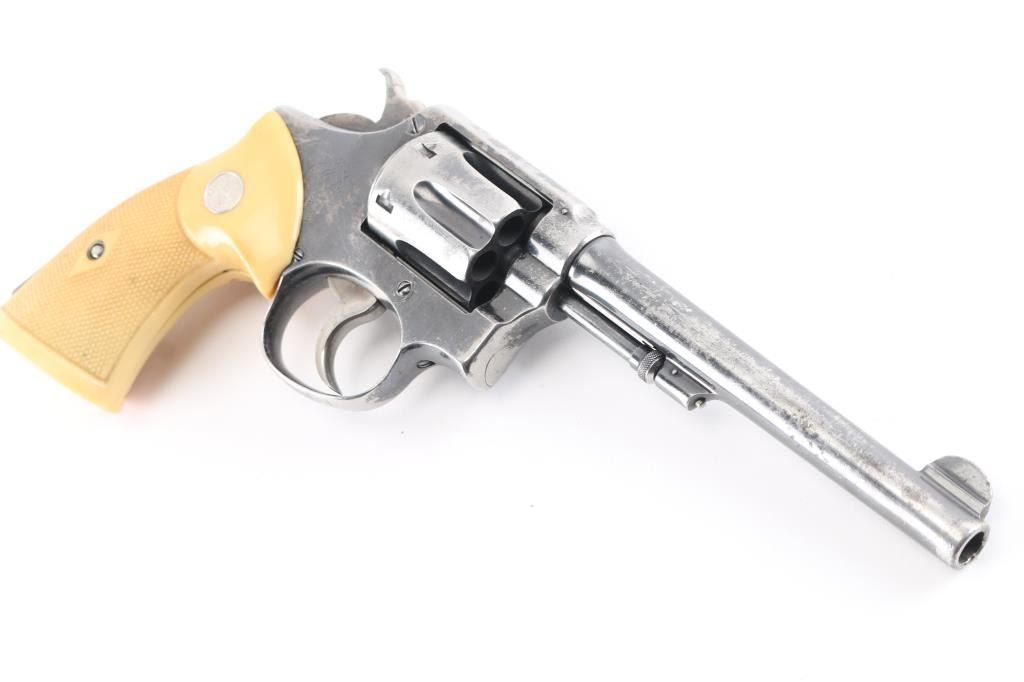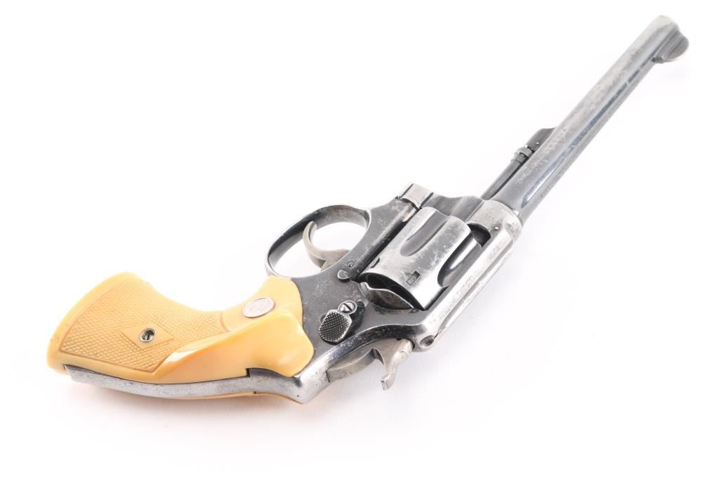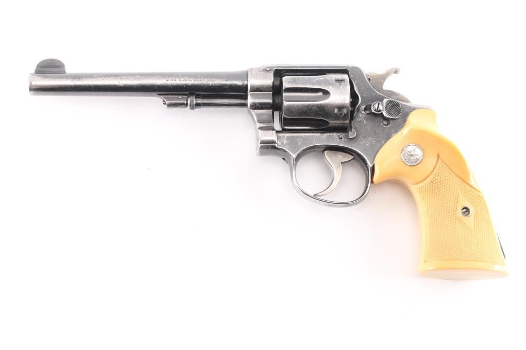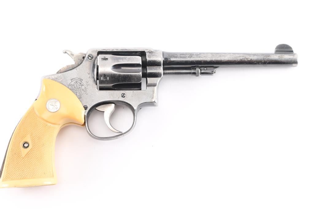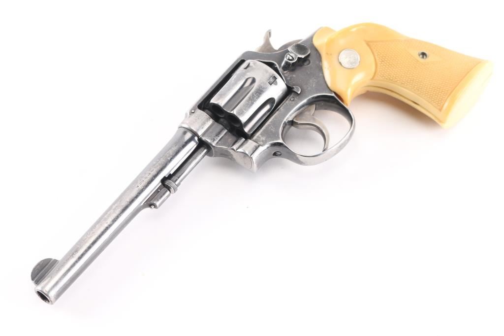 'Model of 1905 - 3rd Change' Vintage double action revolver manufactured circa 1909-1915. Features blued finish, 6" pinned barrel with half moon front sight, fixed notch rear sight, 6 shot fluted cylinder, smooth polished trigger face, polished top on knurled "humpback" shaped hammer, five screw square butt service K frame. Fitted with checkered yellowed white polymer Franzite grips with right handed thumb rest, factory medallions. Bore is good or better, some darkness in grooves may clean out. Retains 50% finish with cleaned areas throughout, some slight shallow pitting in a few areas. Sides of trigger and hammer retain some case colors. Grips are very good, with fair to good fit. Action is sound, smooth with good lock-up.