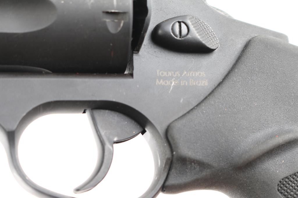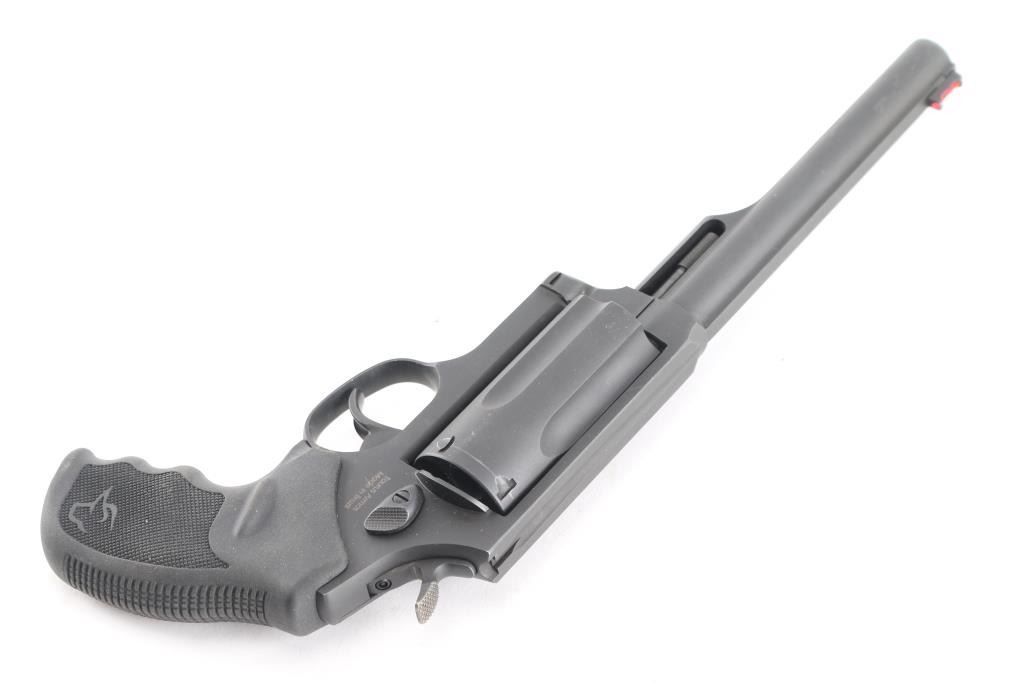 SN: ADH630224 Brazilian made double action revolver chambered for both .45 Colt & .410 bore 3" shells. Features matte dark gray finish, 6.5" barrel, orange fiber optic front sight, square channel cut rear sight, shrouded ejector rod, fluted five-shot cylinder, smooth trigger, knurled hammer spur, internal locking safety on the rear of the hammer, transfer bar safety, and one-piece ribbed black rubber grip with Taurus logos. Bore is very good condition. Retains 85% finish with handling marks, edge losses, drag line. Smooth action with good lock-up.