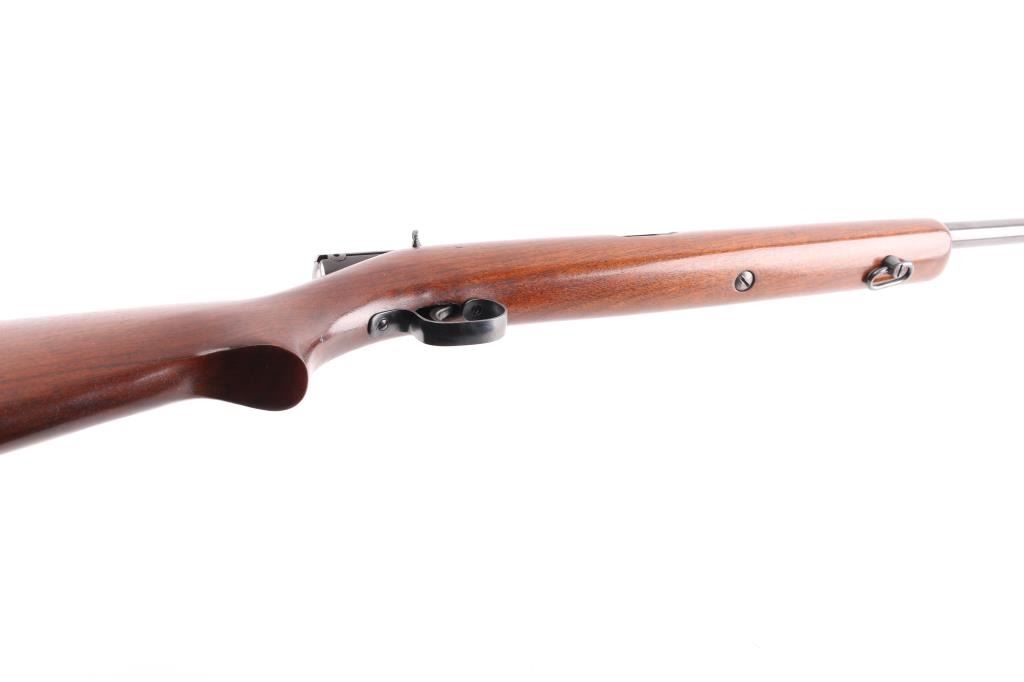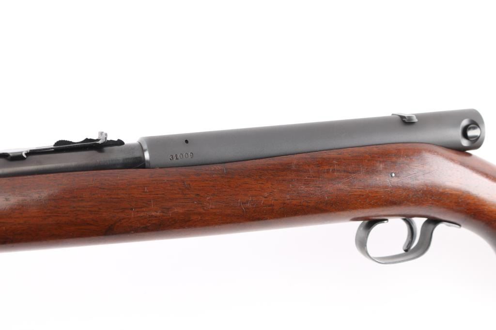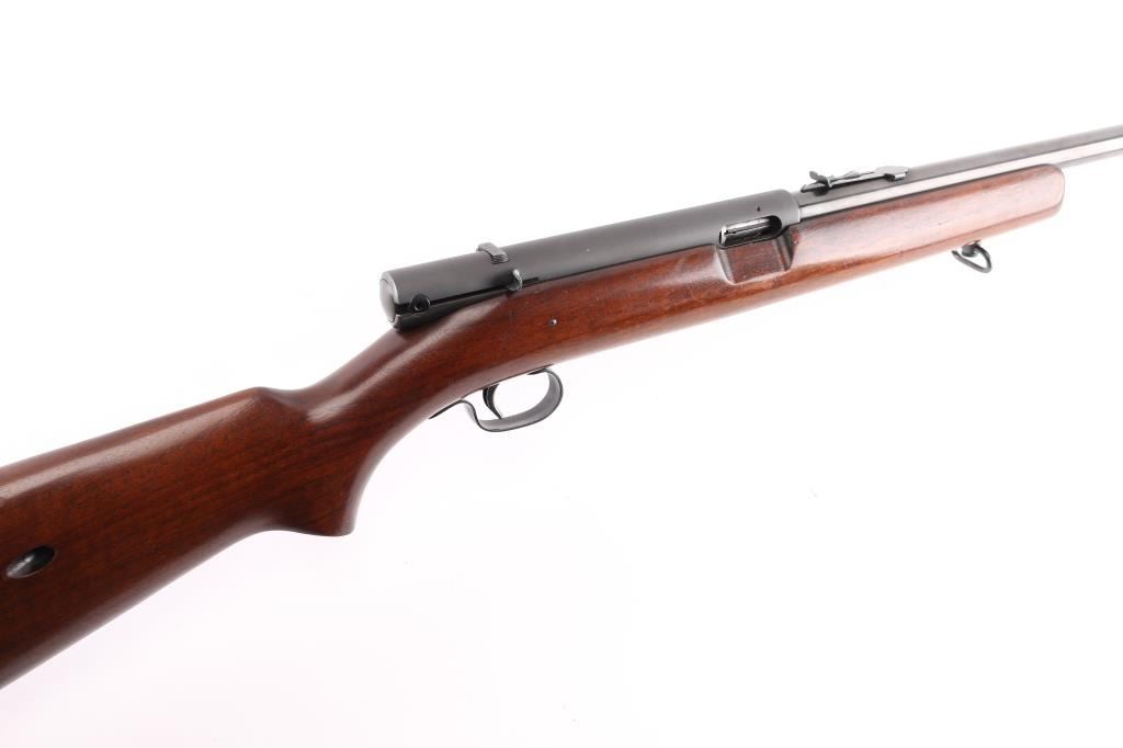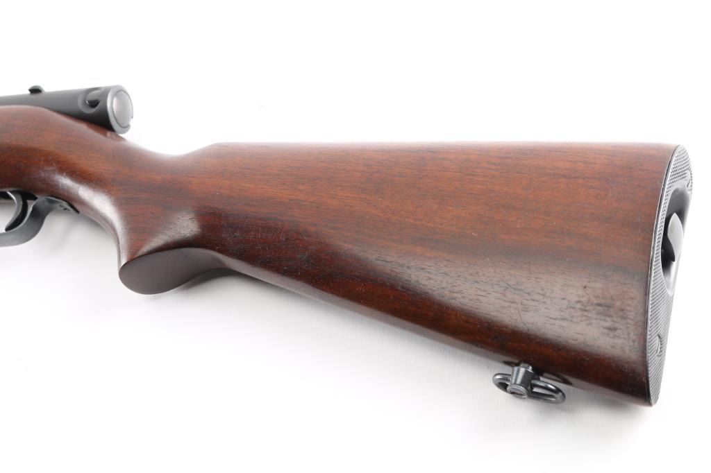 Semiautomatic rimfire rifle manufactured circa 1940. Features blued finish, smooth walnut stock, magazine tube in butt, blade front & sporting rear sights, 24" barrel, manual safety on top of receiver, steel buttplate, sling swivels. Bore is very good bright condition. Metal appears refinished, some thinning to markings, matte finish on receiver, other parts polished blue, 95% coverage with minor handling marks, metal shows a variety of surface finishes from cleaning and prep for re-blue. Wood is very good condition, lightly sanded, some darker color stains retained.