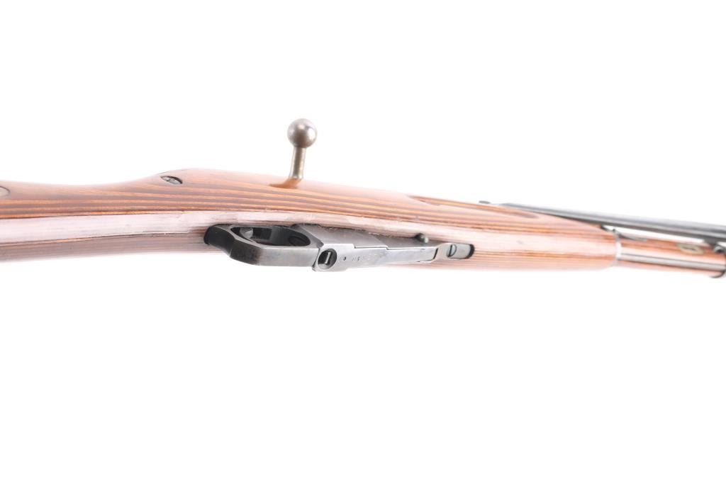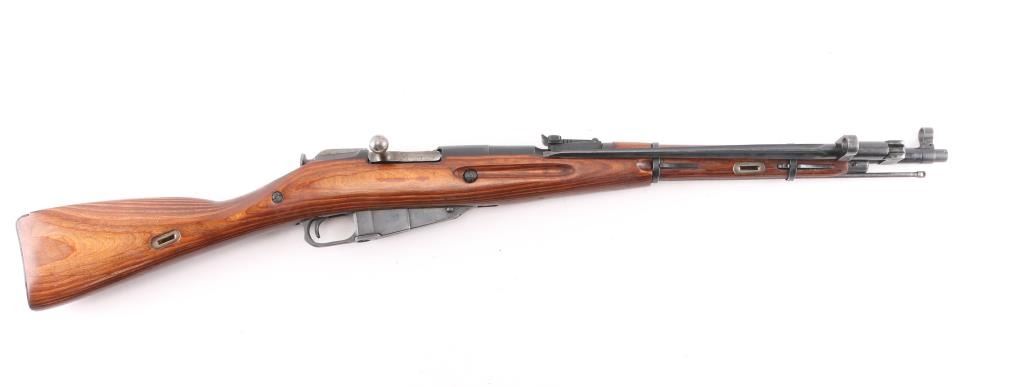 Russian Mosin Nagant military bolt action rifle dated 1944, imported by CAI, Georgia VT. Features 20" barrel, post front sight inside protective ring, tangent style rear sight, manual safety, straight bolt handle, sling slots, cleaning rod under barrel, folding spike bayonet. Bore is excellent/bright, strong rifling. Retains 92% dark blued arsenal refinish with small scratches and handling marks. Bolt assembly is very good polished bare metal. Laminated stock & handguard are very good condition, good fit to metal. Serial numbers matched barrel shank, floorplate, and steel butt plate, mismatched bolt.