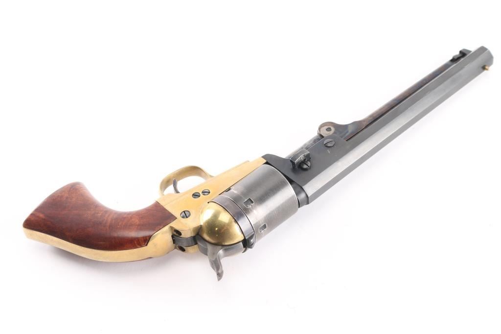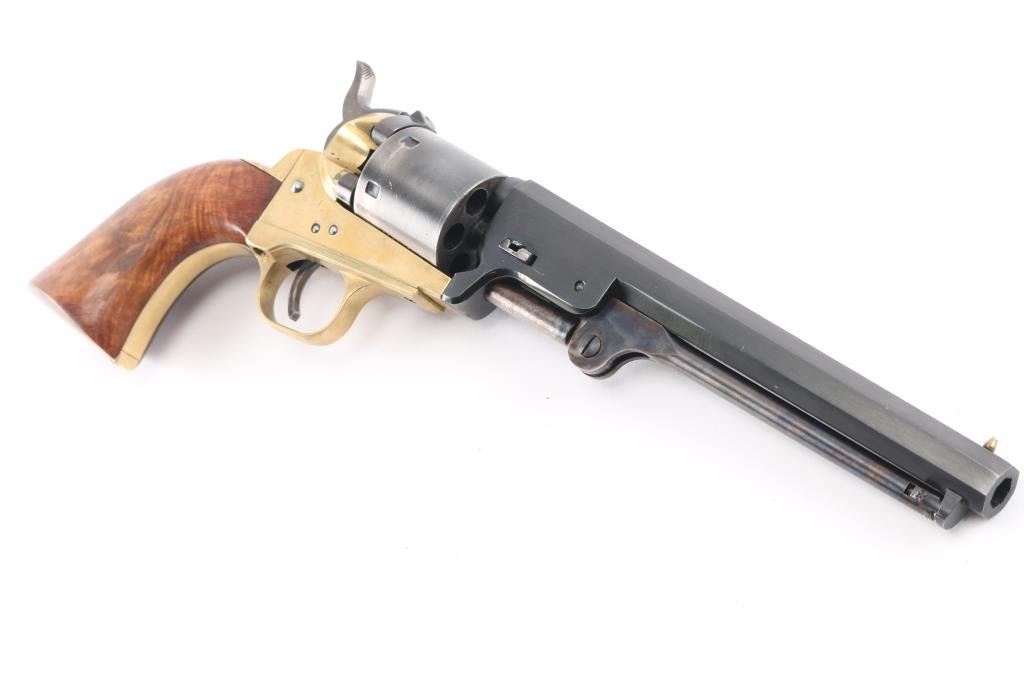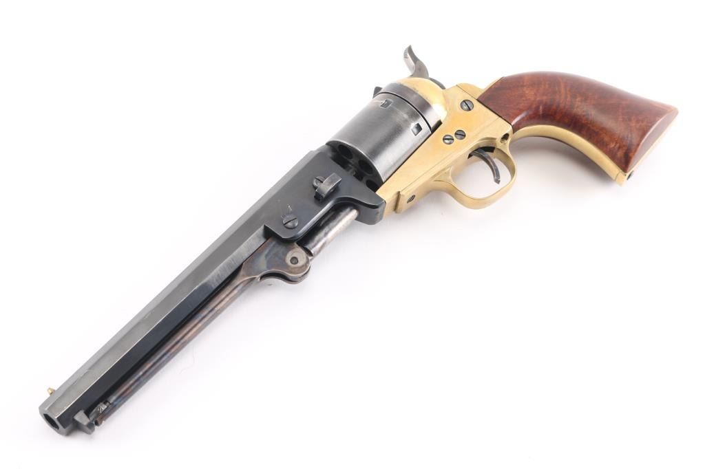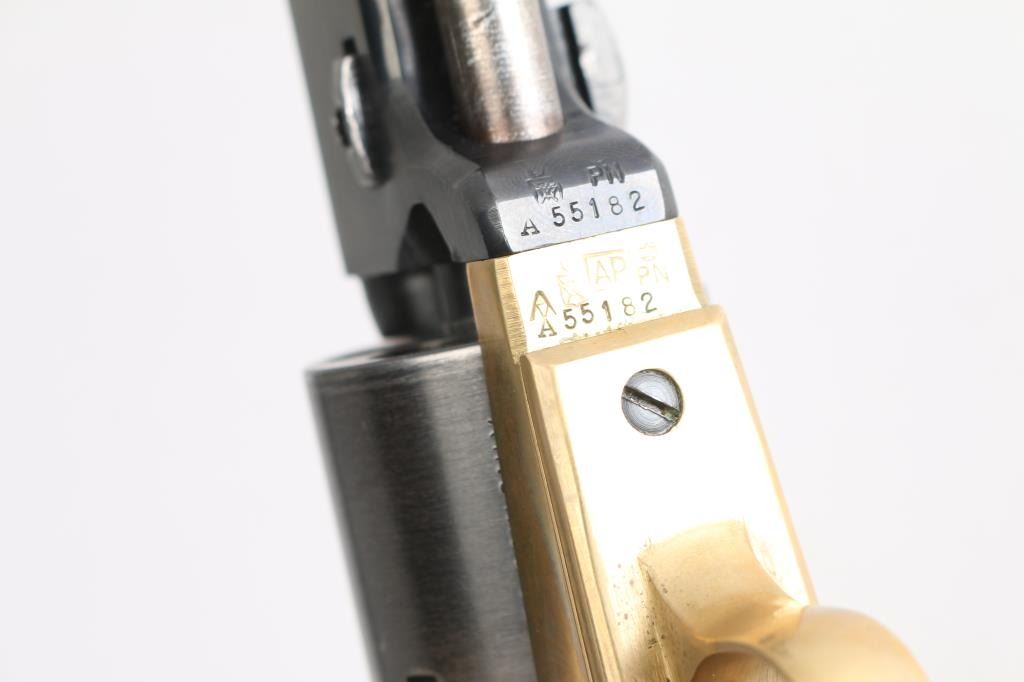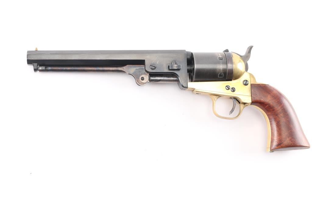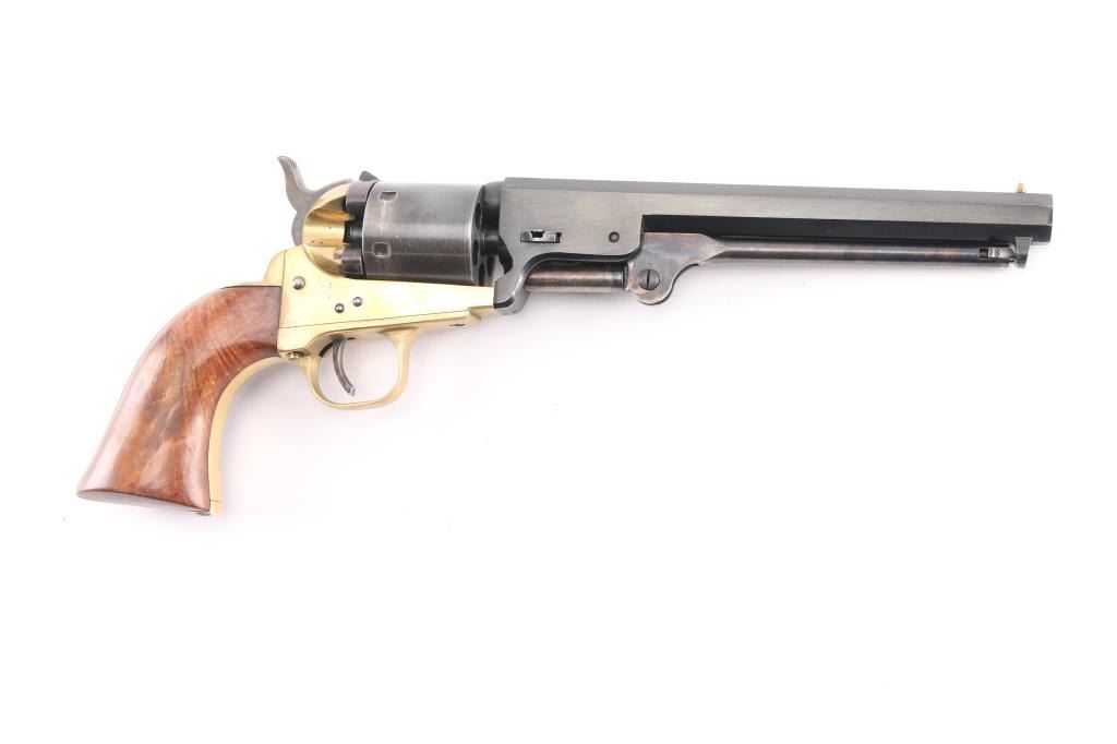 Sn: A55182. Italian made reproduction of a Colt 1851 Navy single action conversion revolver chambered in .38 S&W. Features a blued finish, brass plated frame, triggerguard, & grip frame. 7 1/2" octagonal barrel, brass cone front sight, fixed 'v square notch rear sight, unfluted six-shot cylinder, case colored loading lever, thin smooth trigger, knurled hammer spur, smooth walnut one-piece grip. Revolver retains approximately 92% of its original finish showing minor scratches, turning wear on the cylinder, vivid case colors and a mellow patina on the brass. Action is smooth with good lock-up, the bore is excellent, and the wood grip is fine.