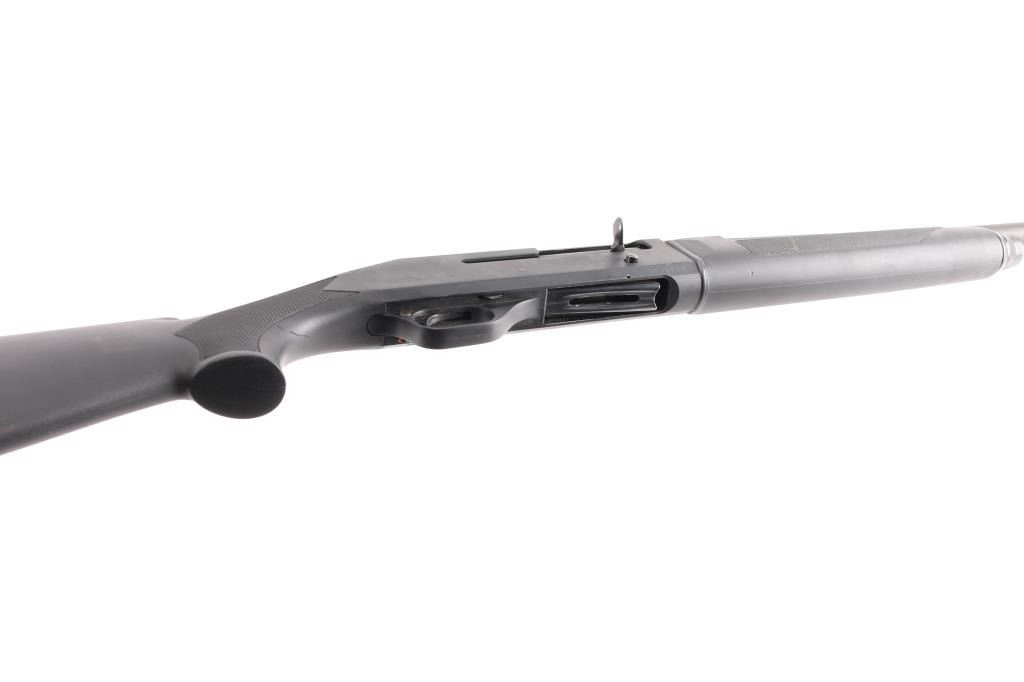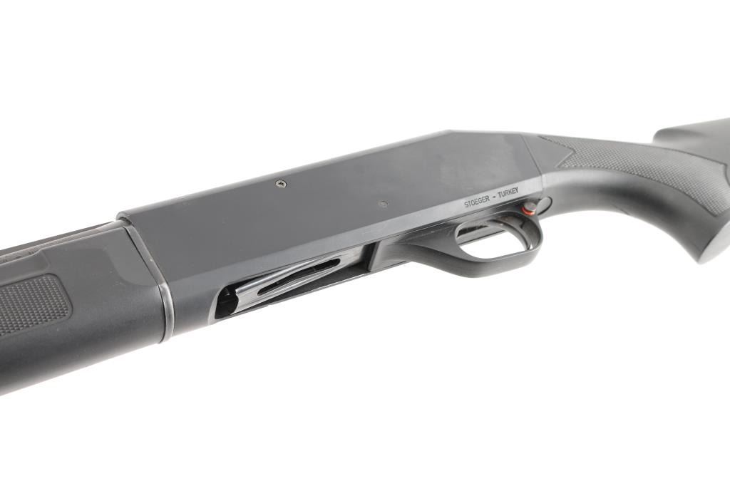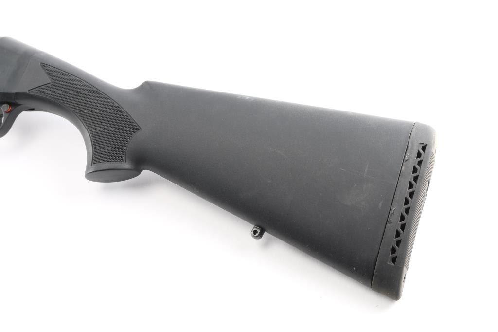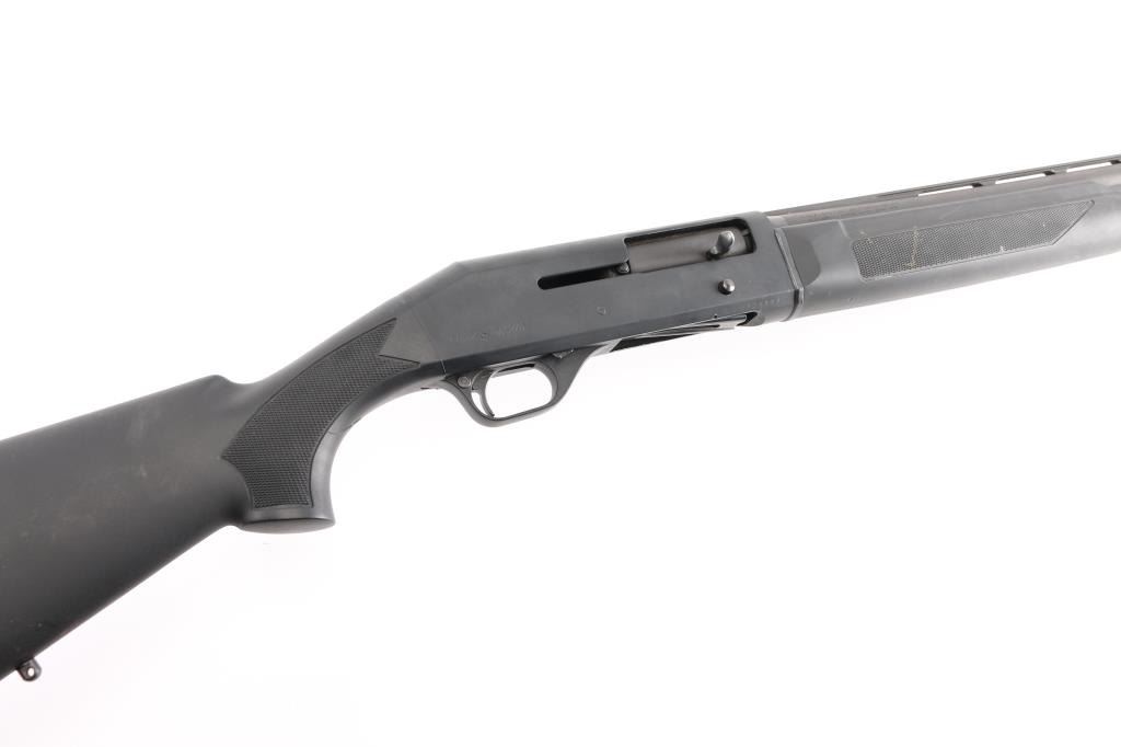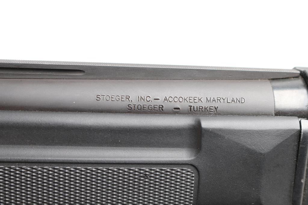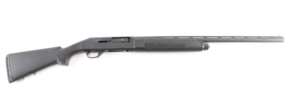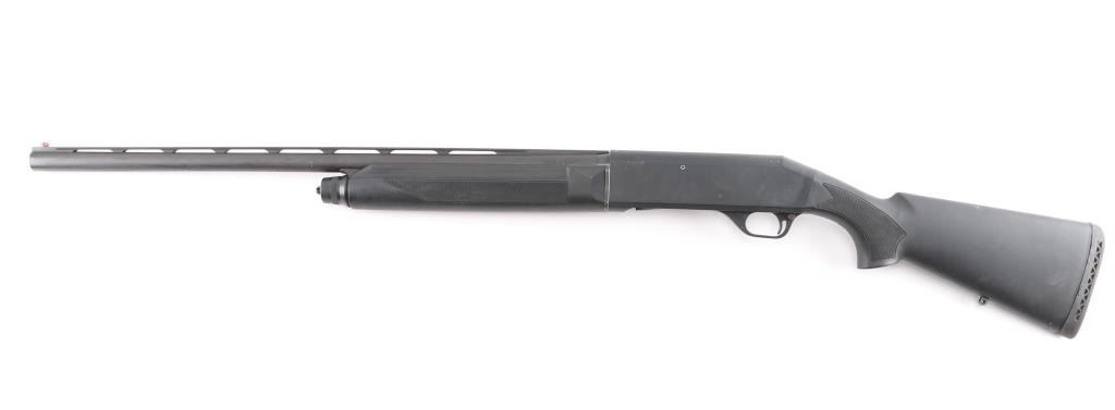 Turkish made semi-automatic shotgun, imported by Stoeger, Accokeek, MD. Features a Parkerized finish, 26" vent rib barrel with IC choke tube installed, Hi-Viz type red fiber optic front sight, curved trigger and push button safety, black checkered polymer forearm and stock w/ventilated soft rubber recoil pad and swivel sling studs attached. Retains approximately 80% finish with scratches on top of the barrel rib, back of receiver with handling marks and edge loss. Bore is bright and clean. Action is slightly loose and bolt release button does not operate consistently.