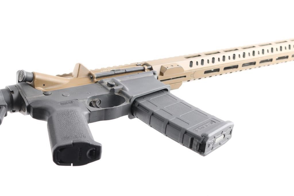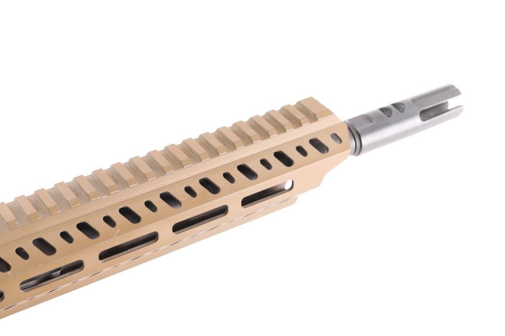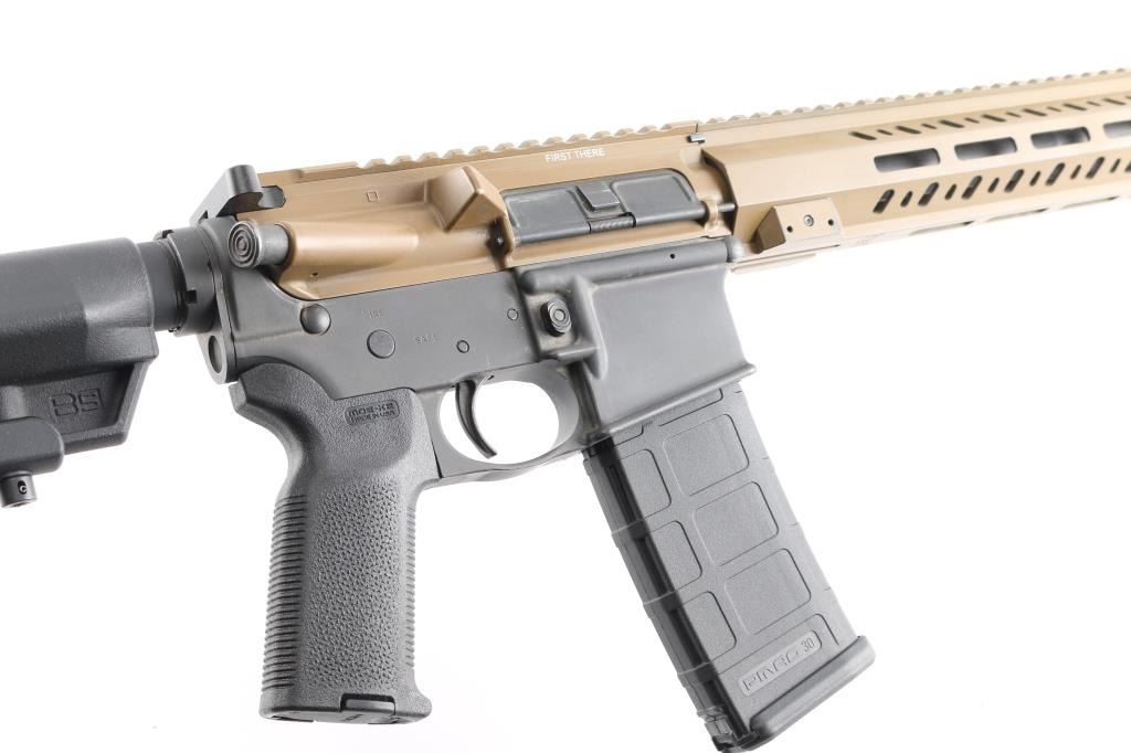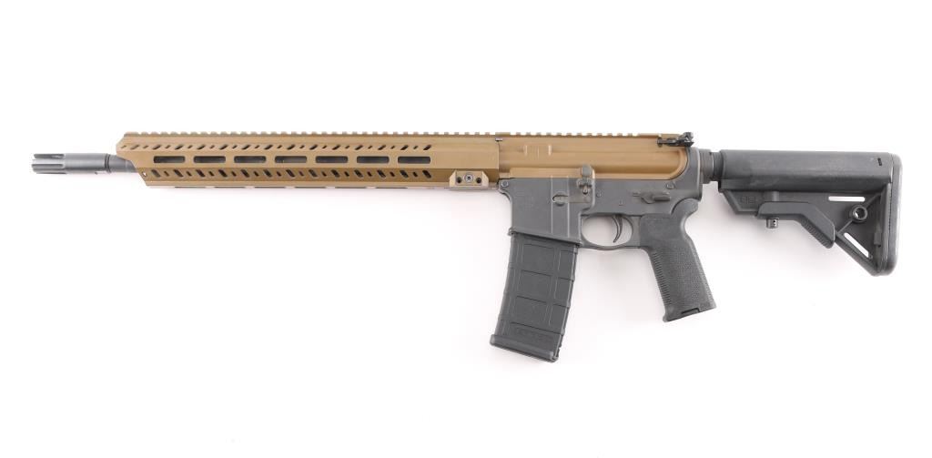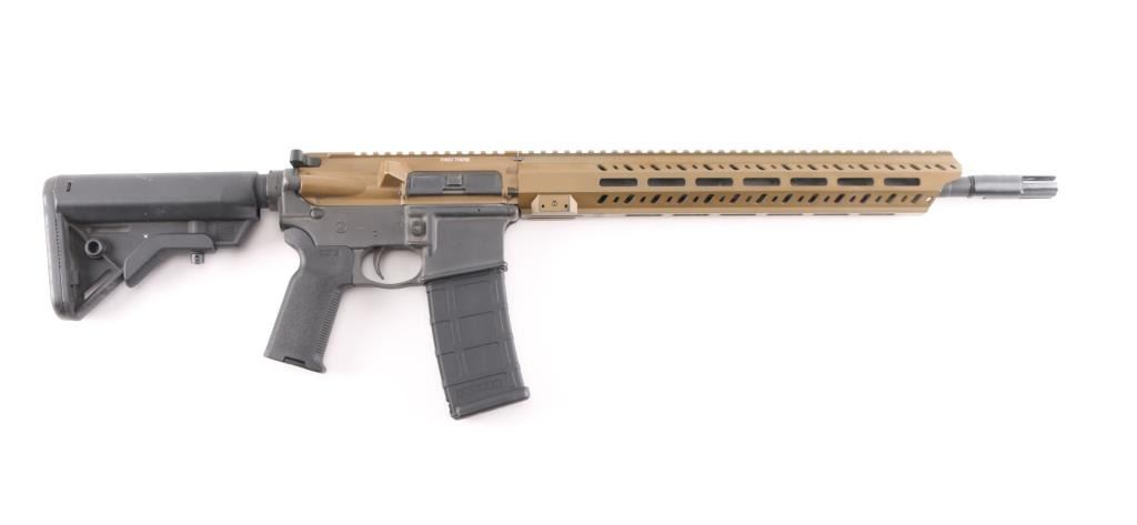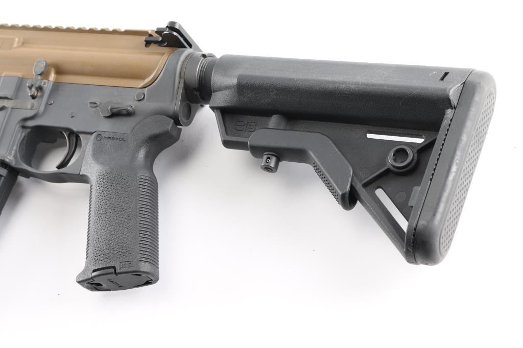 Semiautomatic AR15 type rifle. Features Flat Dark Earth color coated flat top upper receiver & M-Lok rail handguard, other parts are flat black parkerized or black polymer, 16.5" barrel, muzzle brake & flash hider combo with open prongs, forward assist, ejection port cover, deflector hump, manual safety, Magpul grip, B5 adjustable carbine stock. Bore is very good condition. Metal retains 95% finish with scuffs and handling marks. Polymer is very good. Includes one Magpul PMAG 30. No sights.