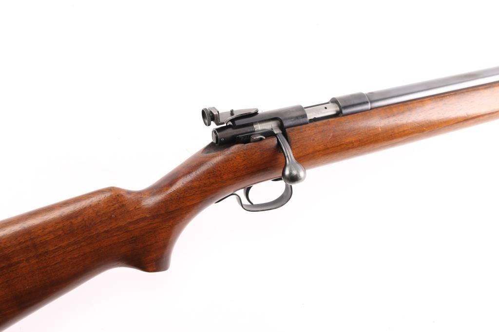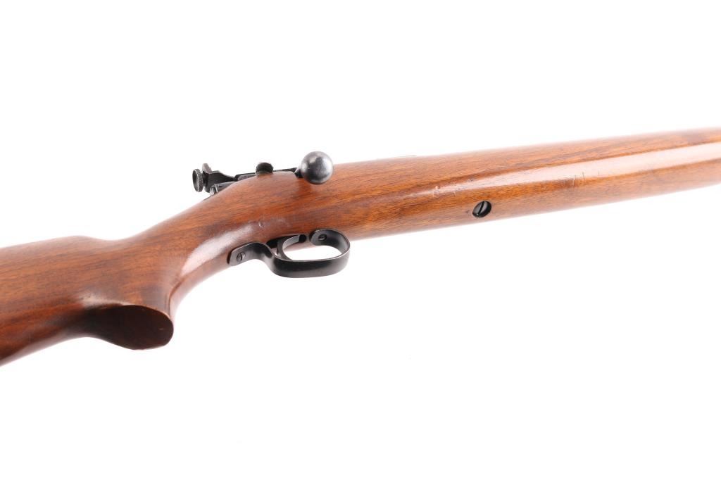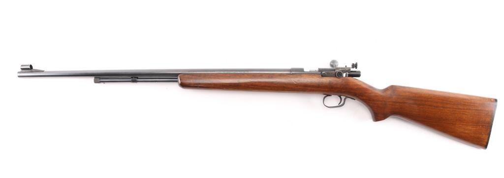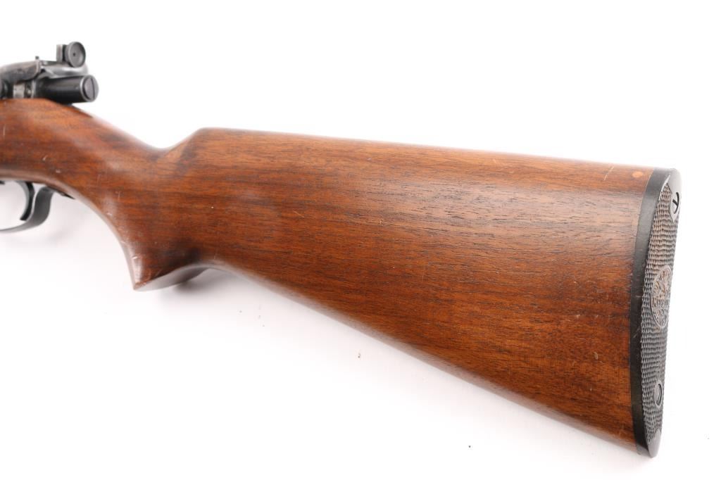 Vintage bolt action rimfire rifle manufactured between 1938 and 1949. Features blued finish, smooth walnut stock with curved grip, factory plastic buttplate, 25" barrel, hooded blade front sight, receiver mounted rear peep sight, tube magazine under barrel, manual safety. Bore is pristine condition. Appears carefully reblued, retaining 95% dark almost black color, showing few blemishes to the metal under the re-finish, markings remain crisp, some spotting and color loss on rear sight bracket. Stock is very good condition with dents & scratches, lightly varnished.