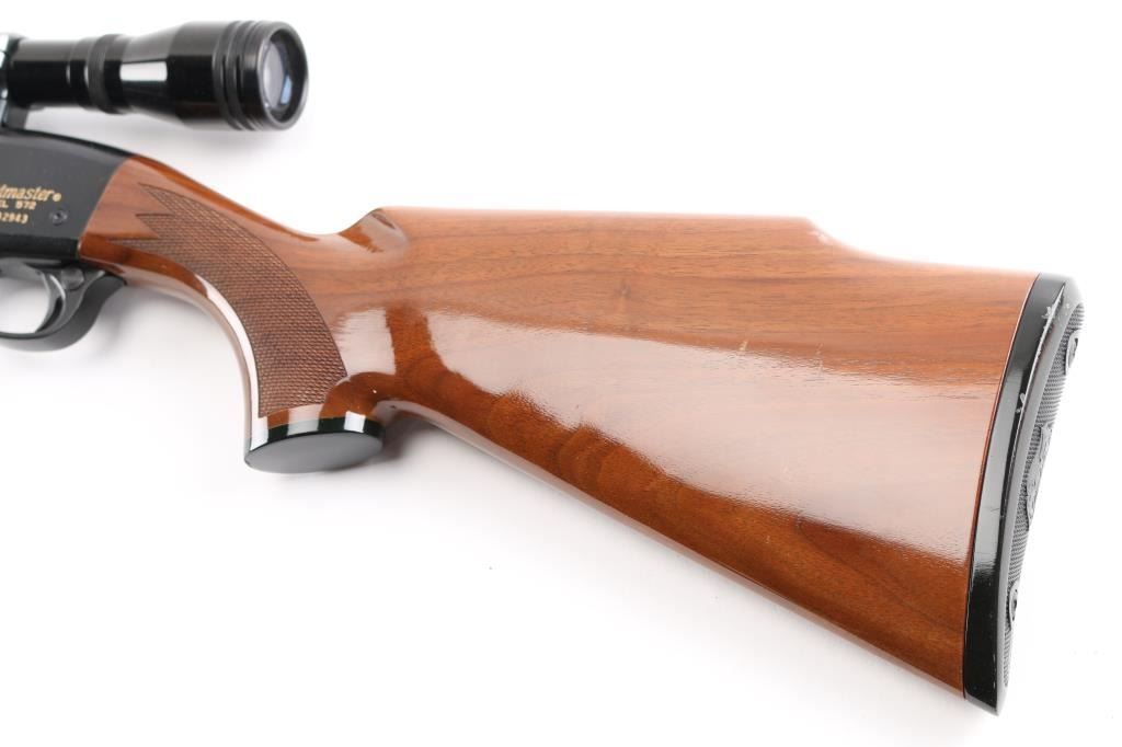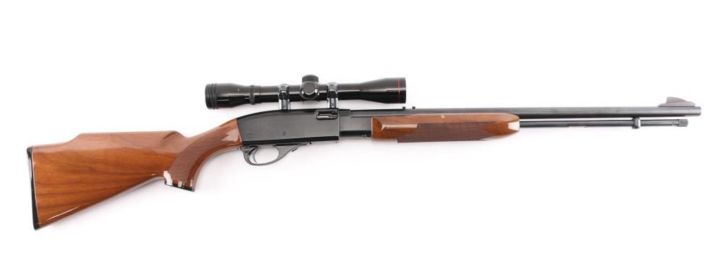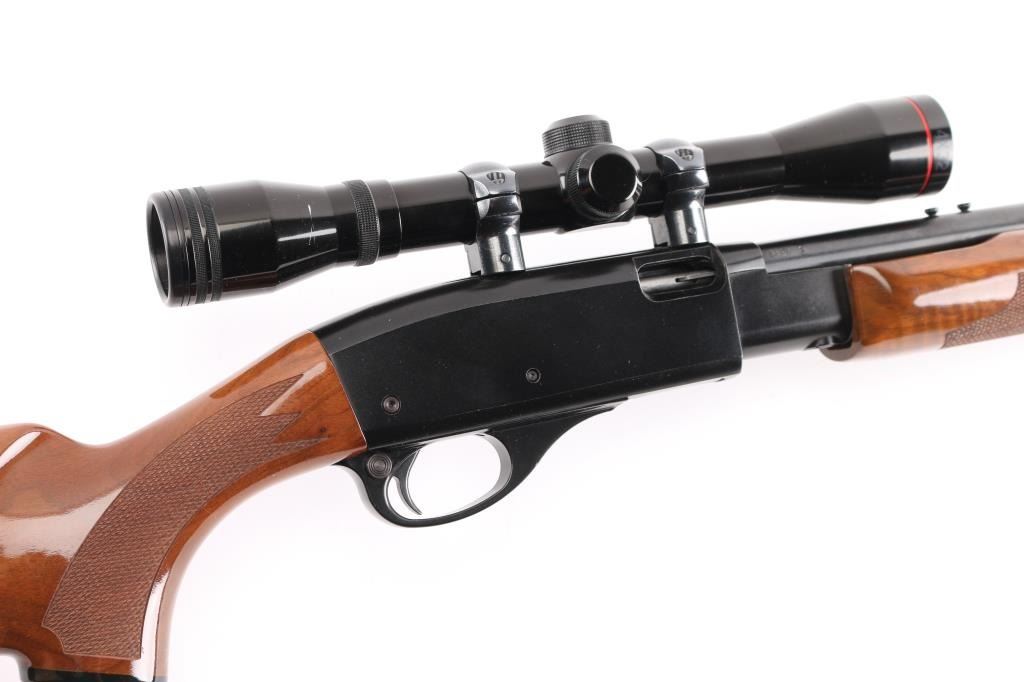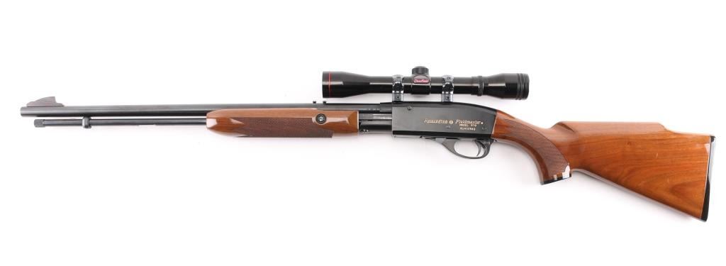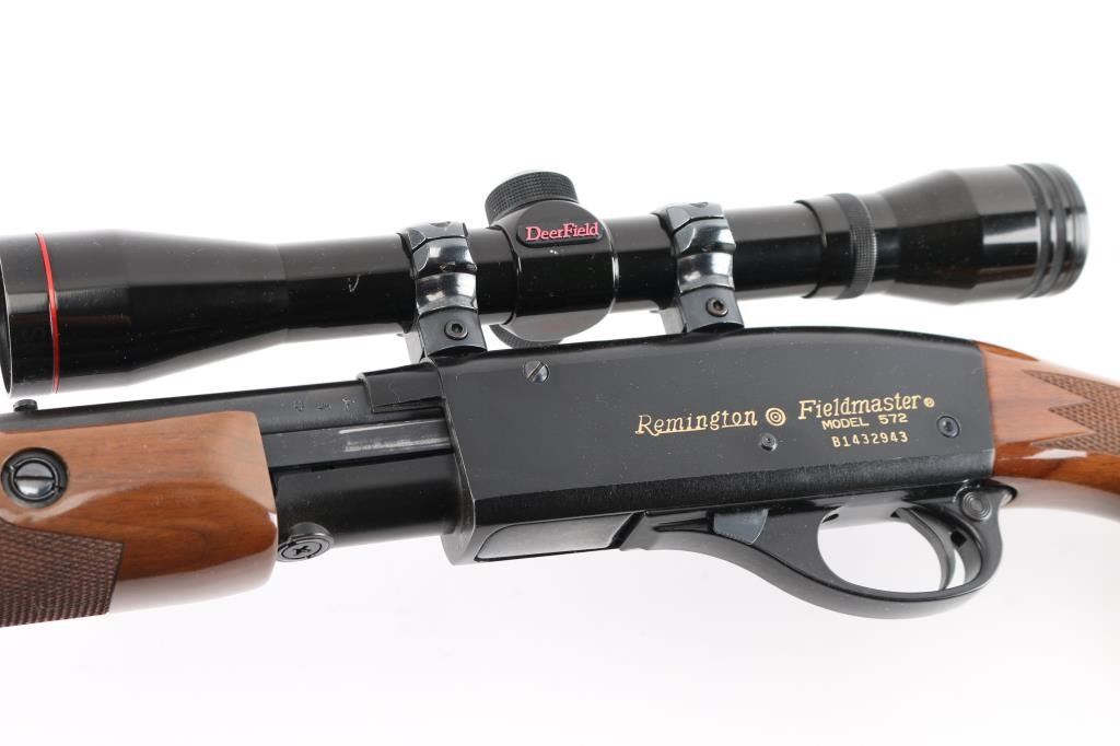 'Fieldmaster' Pump action rimfire rifle, with 1991 barrel date code (based on the warning stamp). Features blued finish, checkered walnut pump handle and stock with curved wrist, 22" barrel, magazine tube under barrel, blade front sight, rear sight removed, push button safety and Remington black plastic butt plate. Mounts a Simmons Deerfield 4x32mm scope with duplex reticle. Bore is pristine. Retains 98% finish with minor handling marks, rubbing wear on action bar. Stock is near perfect, few blemishes to the urethane finish. Scope is very good with clear view.