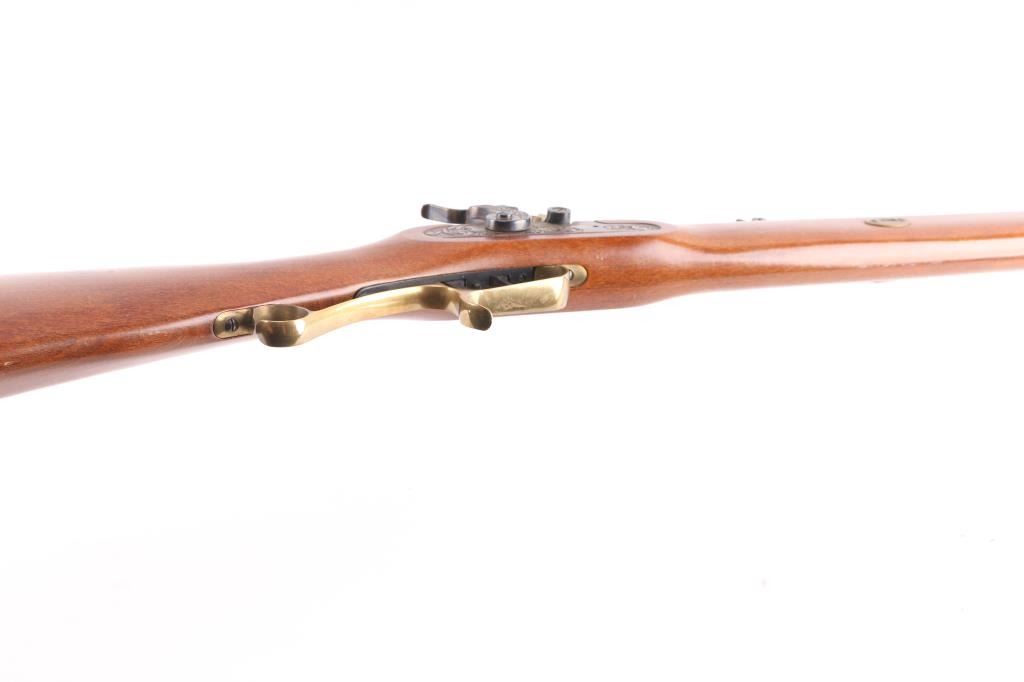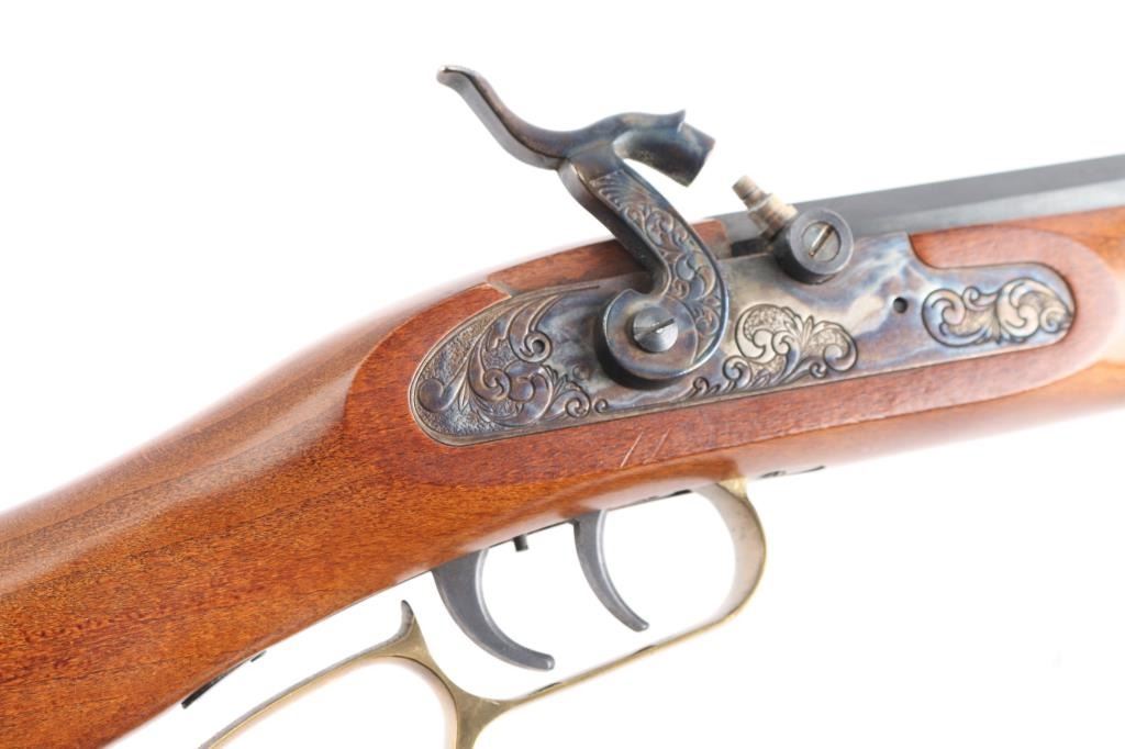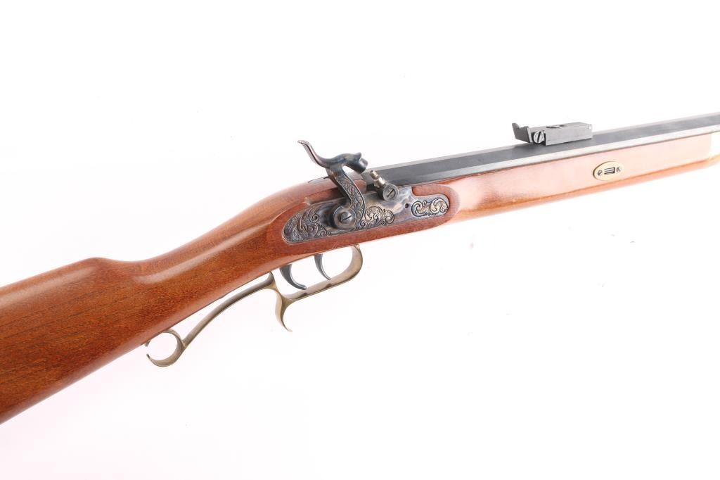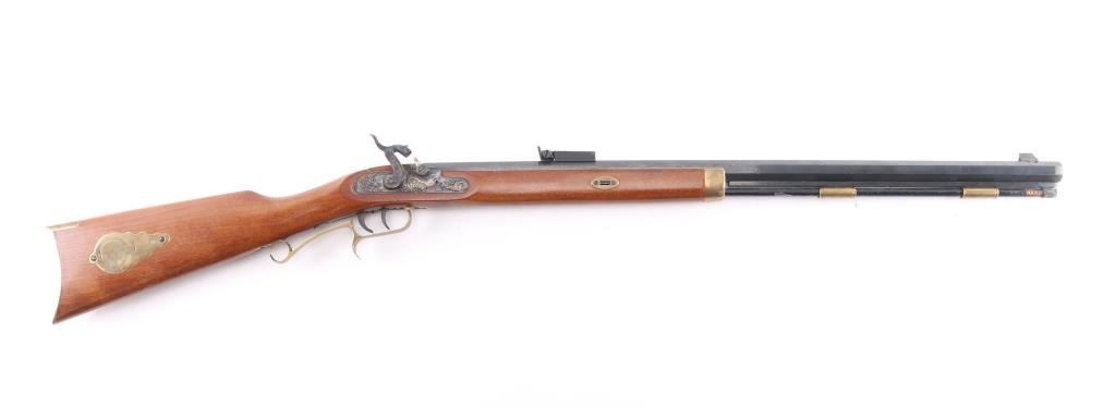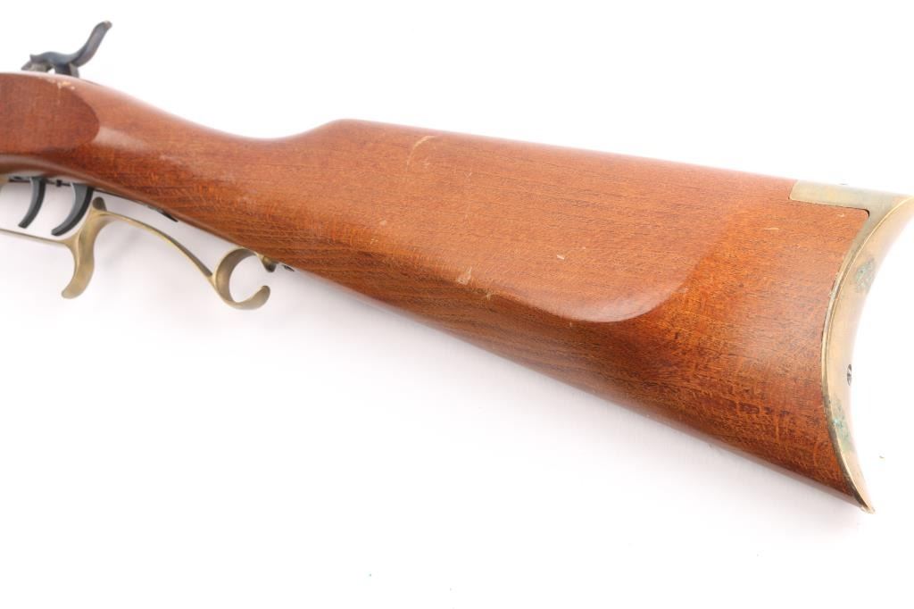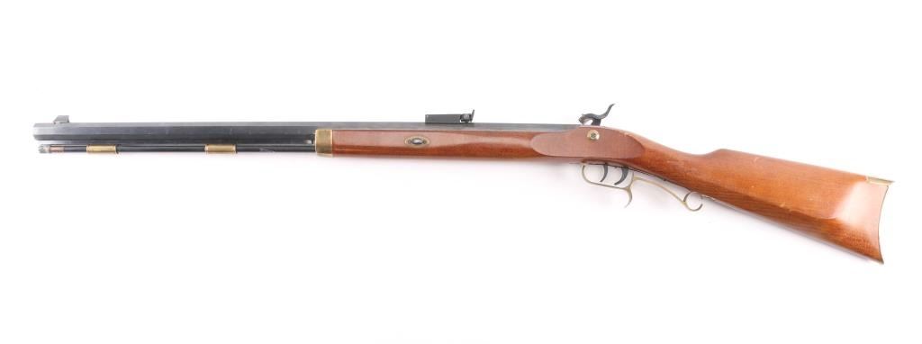 Made in Spain, for Black Powder Only. Features blued 28" octagon barrel, blade front & adjustable rear sights, fiberglass ramrod, brass fittings, crescent buttplate, hardwood stock with scant right hand cheekpiece, double set triggers, case colored right hand lock. Bore is good or better condition, very dusty. Retains 85% finish on barrel with scratches and dings. Does not appear to have been fired. Brass is bright with little aging. Wood is very good.