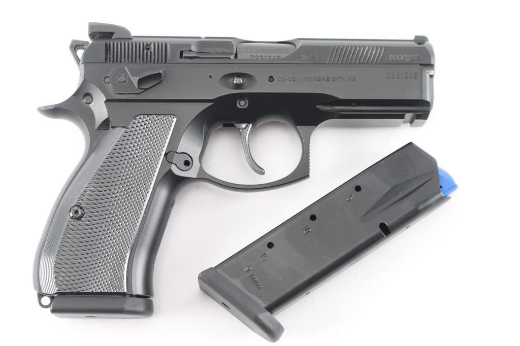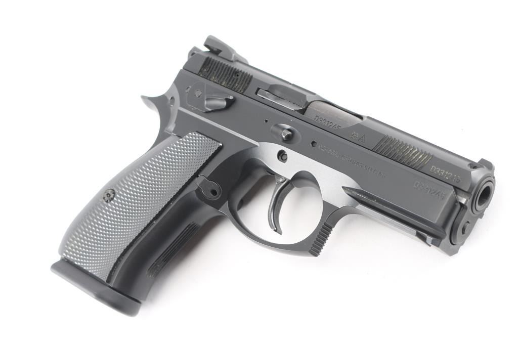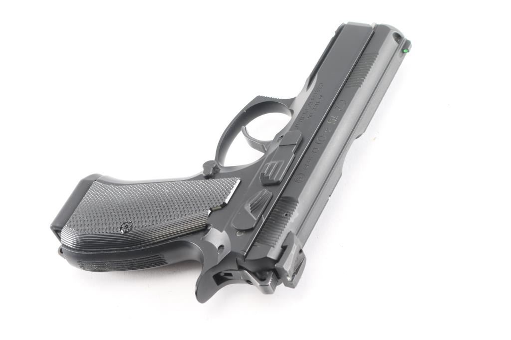 "Omega" Czech double/single action semiautomatic pistol imported by CZ USA, Kansas City KS. Features matte black finish on metal parts, black polymer grips with checkered gripping surface, 3.7" barrel, fixed 3 dot sights in dovetails (rear dots painted black), ambi frame mounted decocker, accessory rail at dust cover, lanyard stud on butt. Serial numbers match on frame, slide, barrel. Includes (2) magazines total, additional set of grips, additional control parts, plastic hard case.
