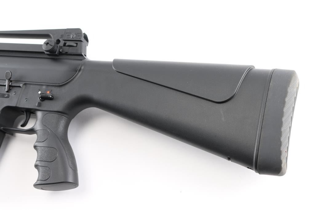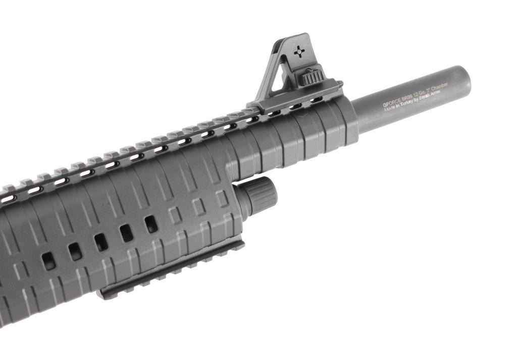 Made in Turkey by Barak Arms for GFORCE ARMS Reno, NV. M16 style gas operated semi-automatic 12 Gauge shotgun chambered for 3" shells. Features a 20 1/2" barrel with a FULL choke tube installed, black polymer grooved forearm with integral full Picatinny top rail and partial barrel shroud with adjustable front sight. Black polymer M16 style lower receiver and shoulder stock with non-adjustable cheek riser and grooved soft rubber buttpad, finger grooved pistol grip, full Picatinny rail on top of upper receiver with removable polymer M16 style handle/adjustable rear sight. Smooth curved trigger, push button magazine release and safety lever on left side. Right side ejection/charging handle. LOP is 14". Retains 98% finish with little to no scratches and or handling marks. Bore is clean and shiny. Comes with a metal 5 round magazine.