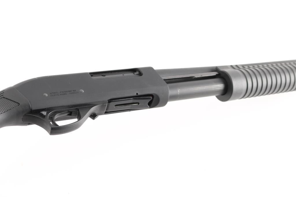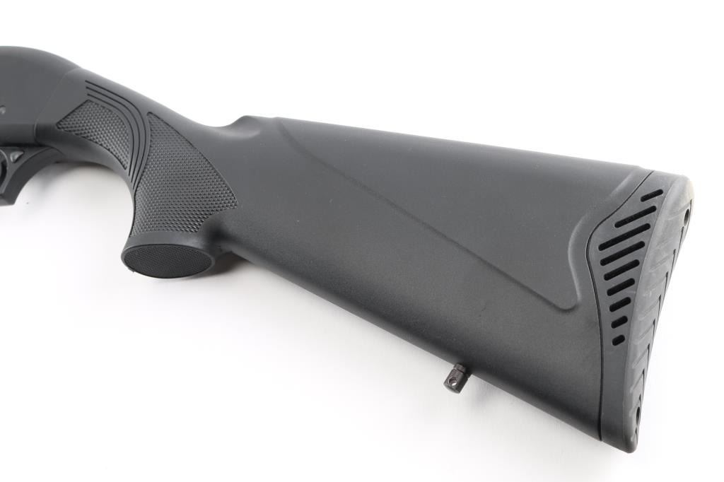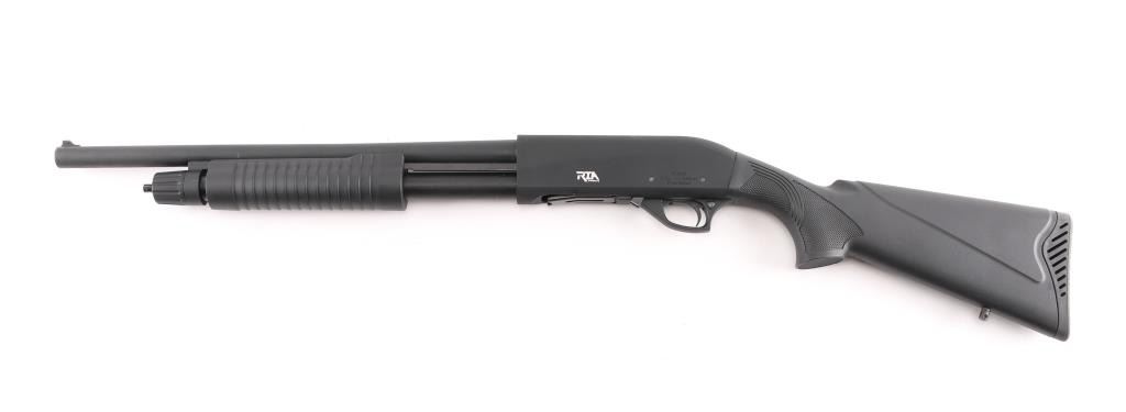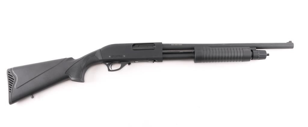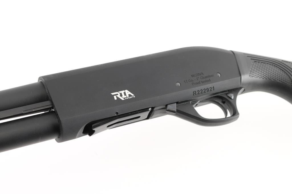 Made in Turkey, the Rock Island Armory/Armscor Meriva 12 gauge pump shotgun has a 3" chamber, 5 round tube magazine, an 18.5" Parkerized barrel with a fixed IMPROVED CYCLINDER choke, fixed blade front sight and black synthetic stock with a soft rubber recoil pad. Sling swivel studs attached and LOP of 14". The matching receiver has integral grooves in the top for mounting scope bases. The stock has pressed checkering at the wrist and a "corn cob" style forend. The finish is approximately 95% with little to no wear marks overall. The bore is clean and shiny. Action is smooth/tight. Condition is NRA Excellent