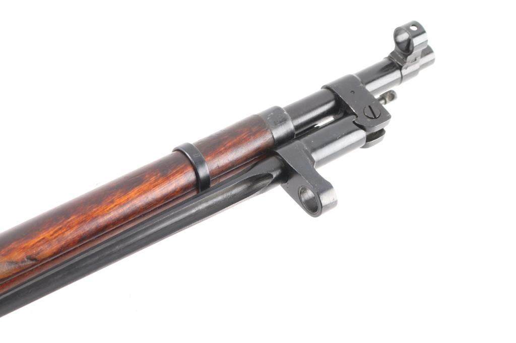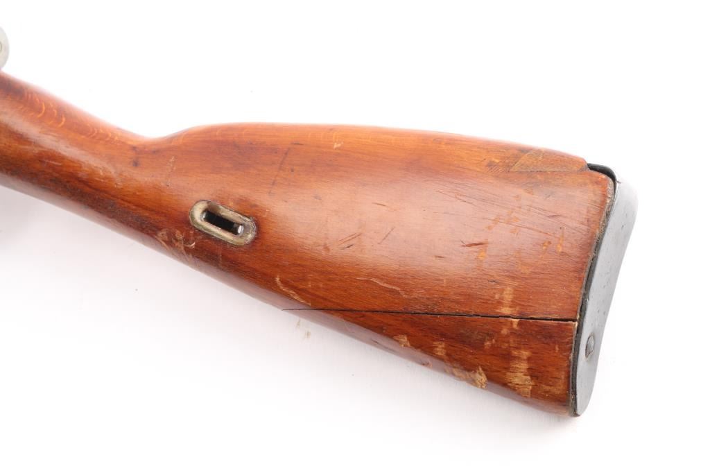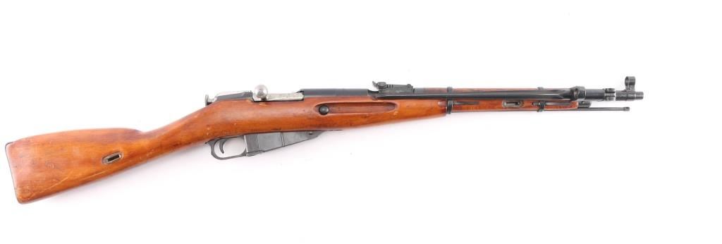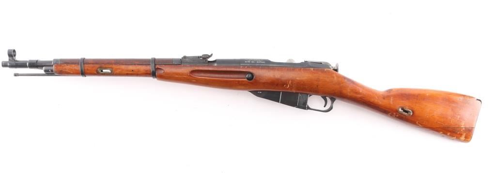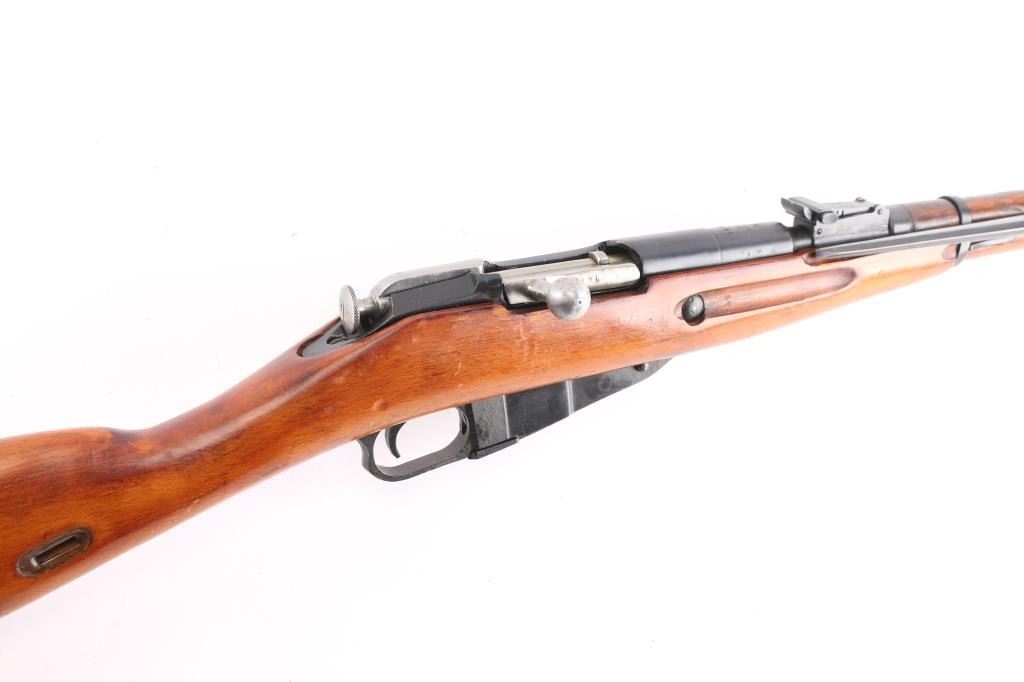 Russian (Soviet Union) military bolt action rifle imported by PW Arms, (left receiver. Dated 1944. Features 20" barrel, hooded post front & tangent rear sight, folding spike bayonet, manual safety, cleaning rod, sling slots. Bore is fair to good condition, dark grooves, slightly pitted, strong rifling. Retains 85% dark blued finish with handling marks. Bare metal bolt is clean polished condition. Varnished hardwood stock & handguard are very good condition with scrapes, dings. Appears arsenal refinished. Original serial number matching where observed (previous number struck thru on floorplate, & butt plate), importer applied number on left receiver