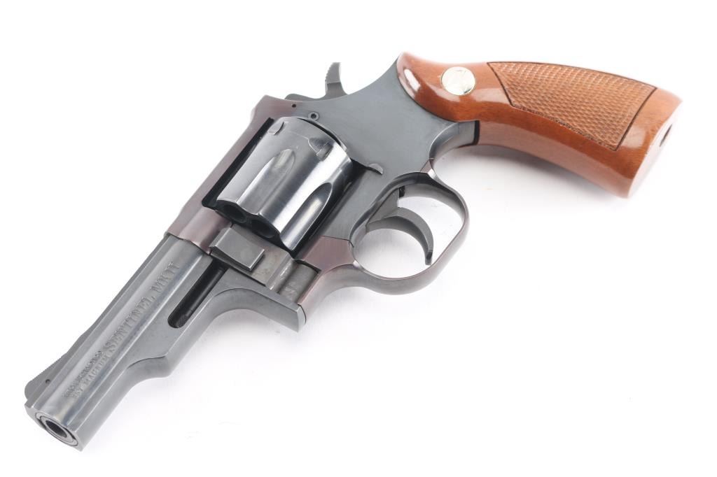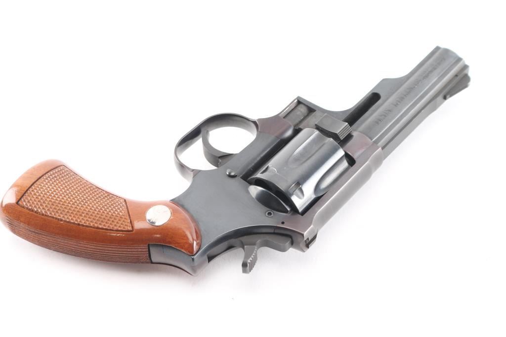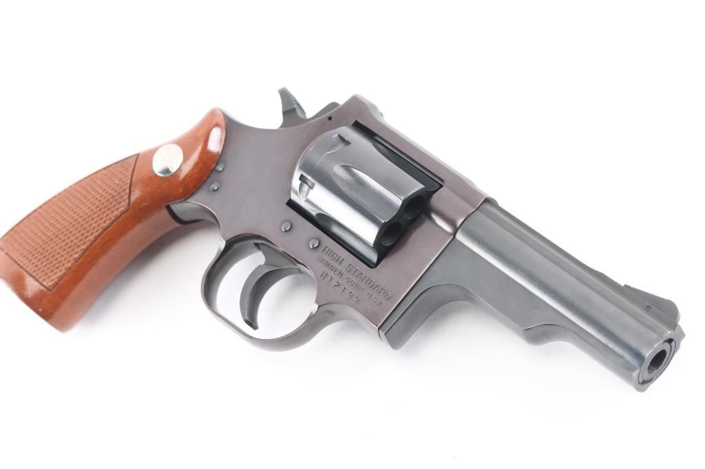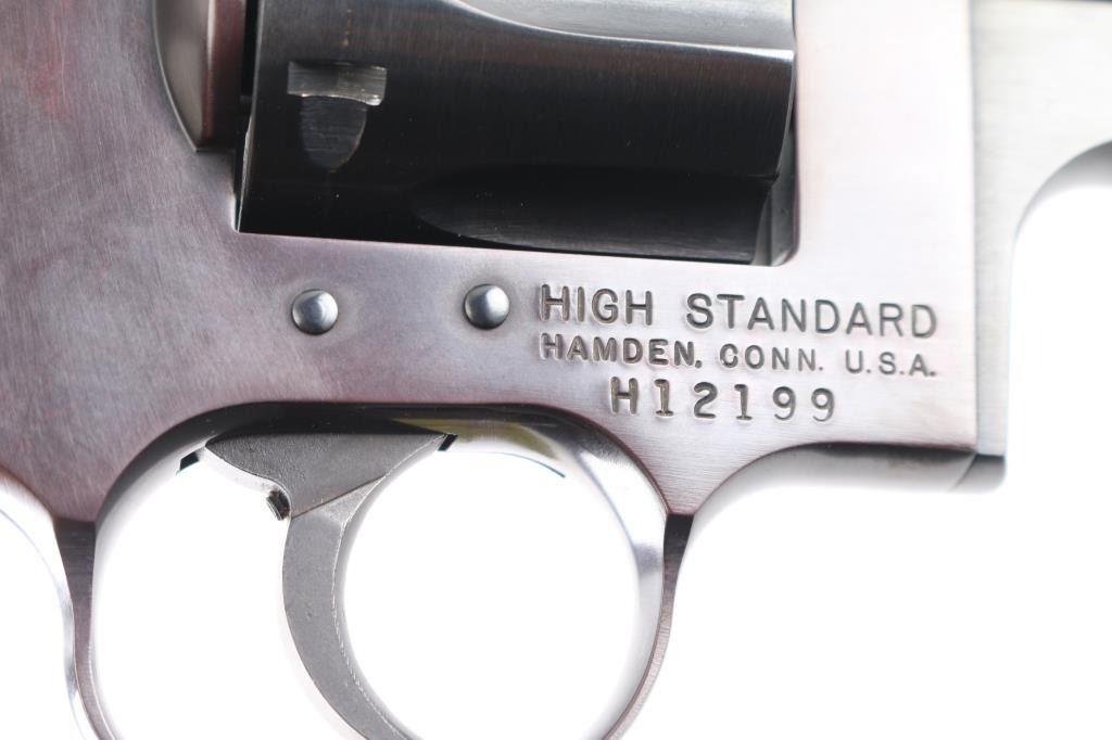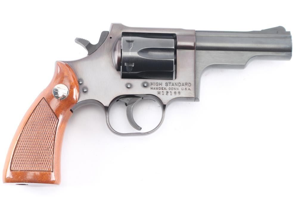 Uncommon double action revolver in 357 Magnum, manufactured circa 1974-76. Appears similar to early Dan Wesson revolvers, such as "pork chop" barrel shroud, flush fit barrel bushing, opening latch on side of frame forward of cylinder. Features blued finish, steel frame, one piece checkered wood grip with High Standard logo medallions, 3.75" barrel, fixed sights, smooth trigger, serrated hammer spur, 6 shot fluted cylinder. Bore and charge holes are very good. retains 95% finish with handling marks. Grips are near pristine. Action is sound, single action cocking is a bit stiff, has good lock-up.