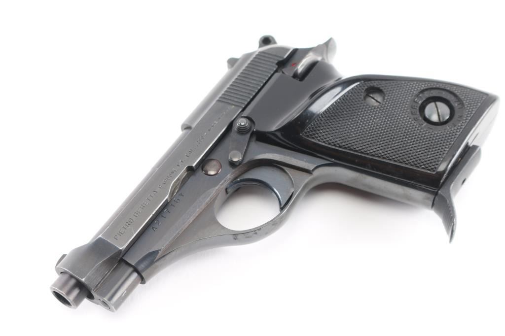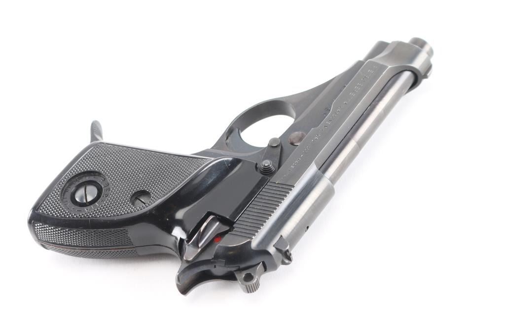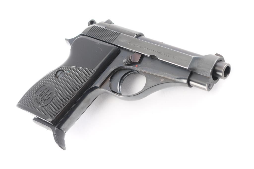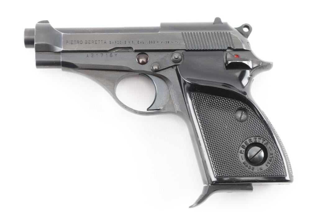 Italian made single action semi-automatic pistol chambered in .380 Auto, circa 1979. Imported by Berben Corp, NY NY. Features blued finish, 3.5" barrel, partridge front sight, dovetailed rear sight with square notch, partially serrated trigger, serrated round hammer spur, frame mounted thumb safety, steel frame, push button magazine release near heel, factory 7 round magazine, and two-piece checkered black plastic grips with right hand thumb rest & Beretta decor. Bore is very good. Retains 95% of it's original finish showing handling marks and some light slide wear on the barrel. Grips are very good. One magazine.
