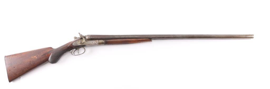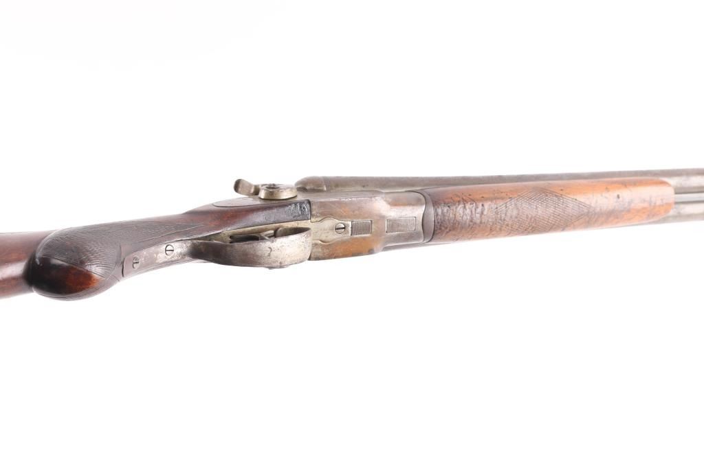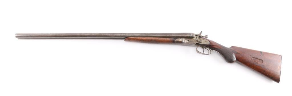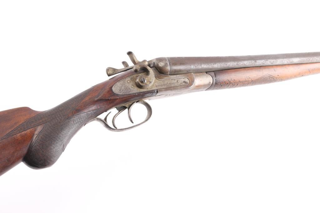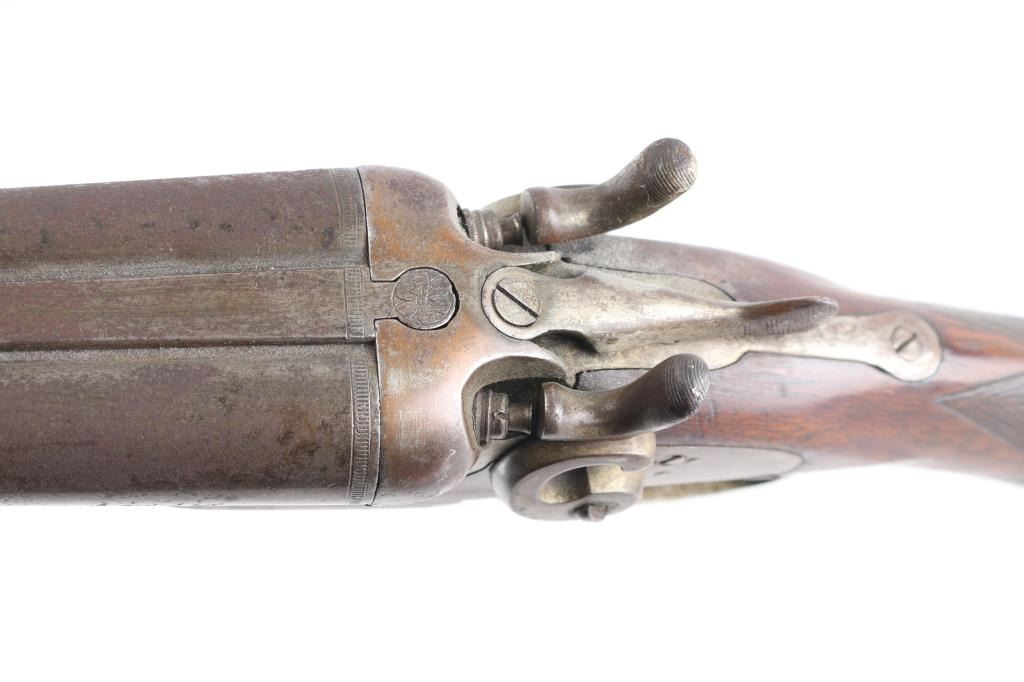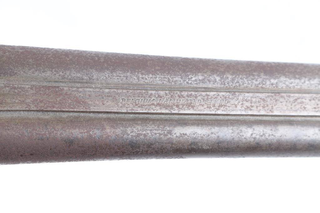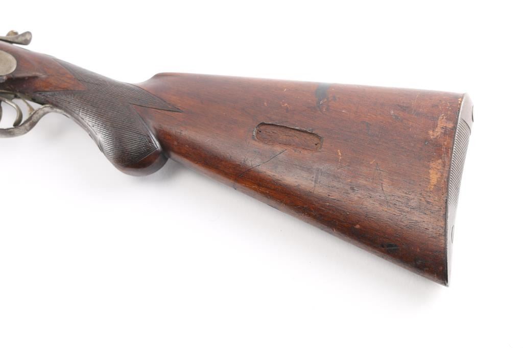 Antique Blackpowder Belgian SxS shotgun, "Rabbit Ear" hammers Serial number on watertable, beneath barrels, and bottom of forend, 30 in. barrels marked Belgium Laminated on rib, single bead front sight, barrels choked IM & M, , double triggers, shell extractor. Hammer actions work well, wood is sound, numerous sctraches/dings, bores look good, dirty, barrels have turned a brown patina covered with pitting. We do not recommend firing this shotgun, a wall hanger,