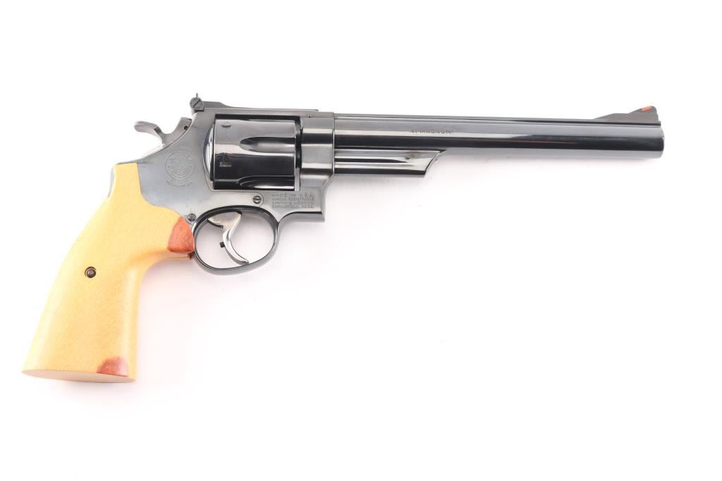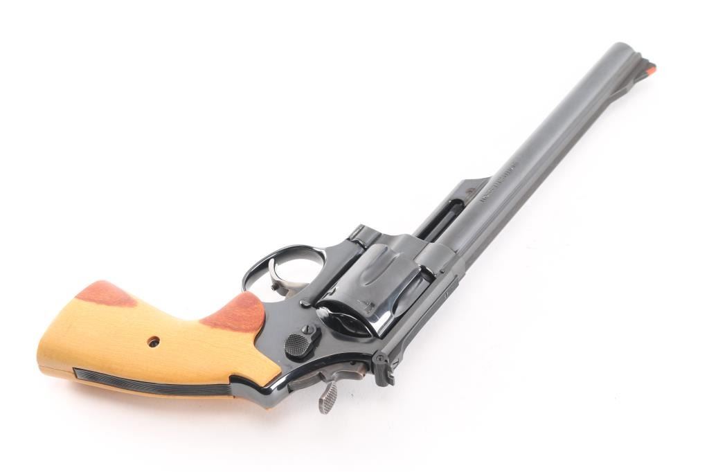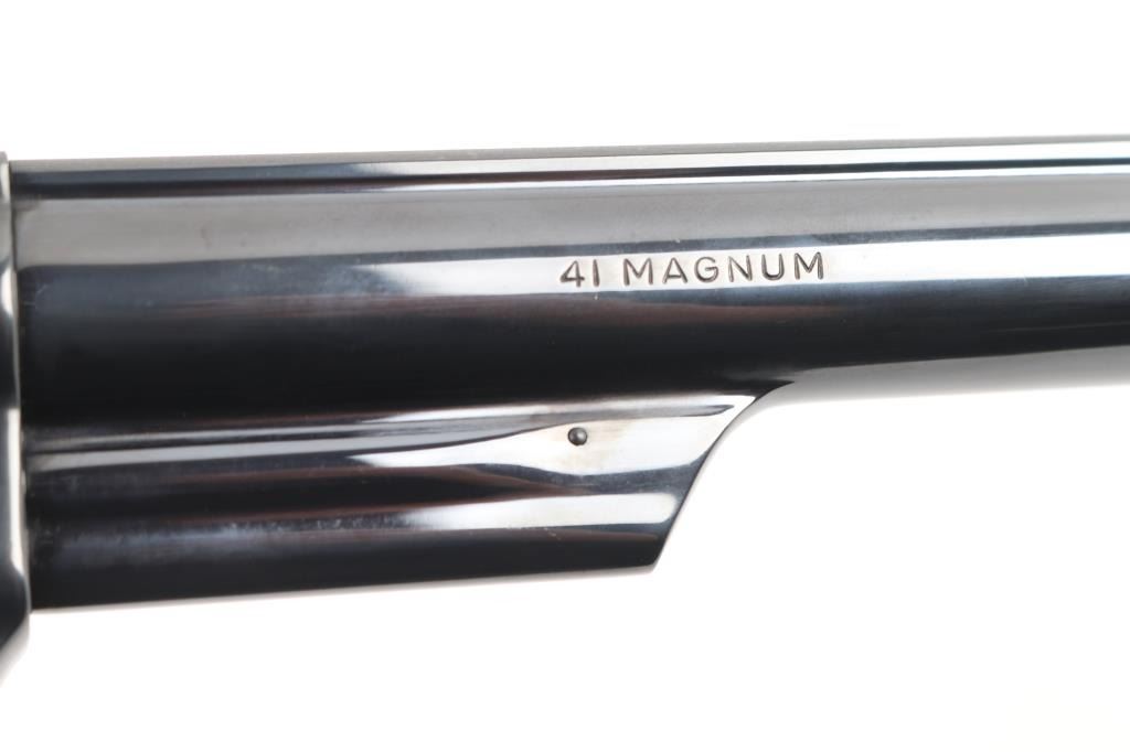 'The .41 Magnum Target' Large frame double action revolver chambered in .41 Remington Magnum, manufactured circa 1979-80. Features a blued finish, pinned 8 3/8" heavy barrel with partially serrated wide sighting rib, raised ramp front sight with orange insert, adjustable micrometer click rear sight with white outline, fluted six-shot cylinder with counterbored chambers, shrouded ejector rod, smooth wide target trigger, knurled wide target hammer, three screw square butt N target frame and custom two-piece smooth wood target grips. Bore and charge holes are very good bright condition. Retains 95% finish with handling marks, cylinder drag line. Trigger face has been polished and smoothed, bright metal. Grips are a lighter color, maybe walnut sap wood, some darker areas, very good condition. Action is smooth with tight lock-up.