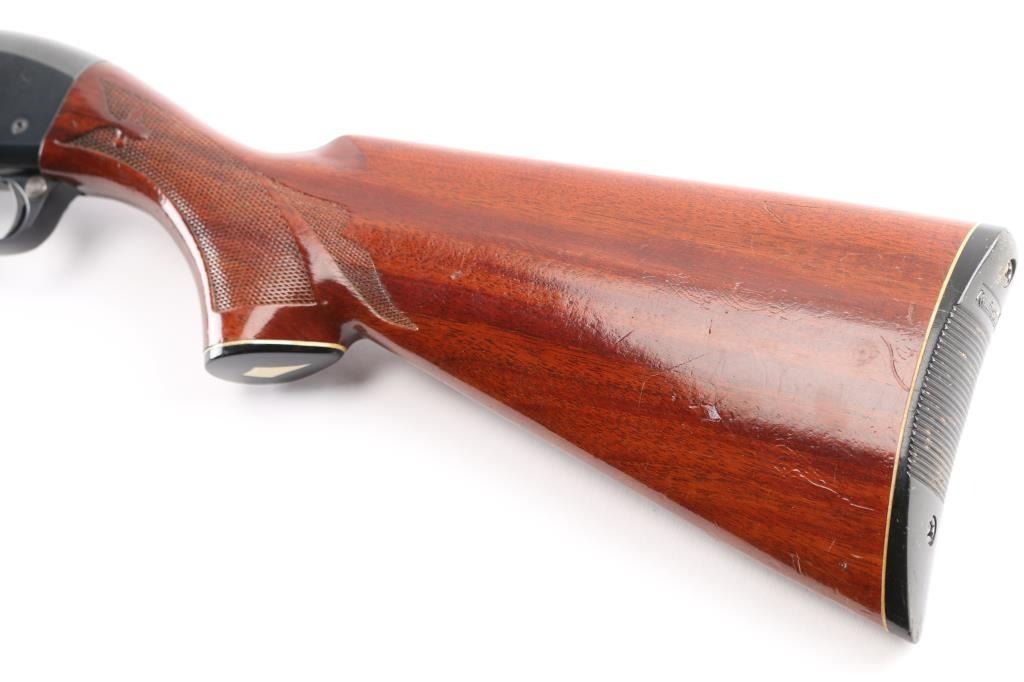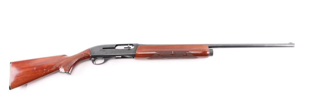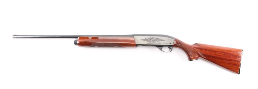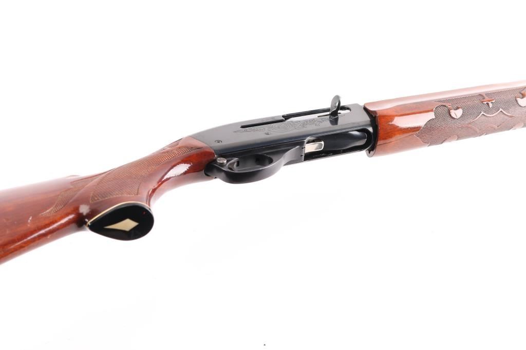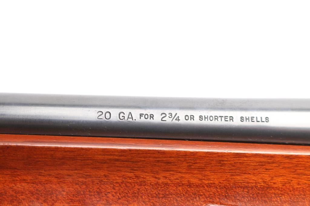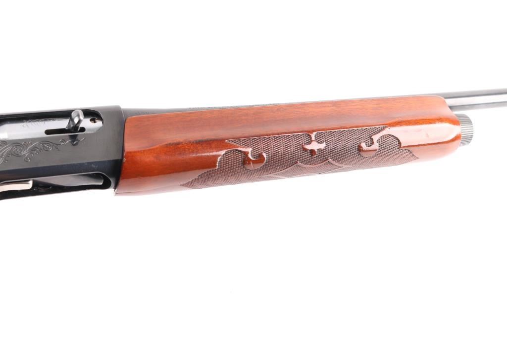 ***TRIGGER GROUP PROBLEM*** (hammer does not fall when trigger pressed) . Gas operated semi-automatic 20 gauge shotgun chambered for 2 3/4" or shorter shells. Features a 26" blued finish barrel marked "MOD", with a brass bead front sight. Checkered wood forearm and shoulder stock in floral design, black serrated plastic butt cap and black plastic grip cap with white diamond-shaped insert. Smooth curved trigger and push button safety. Floral engraving on both sides of receiver and bolt. LOP is 14". Retains approximately 90% finish with some scratches on the top back and front of barrel, dents on wood surfaces. Bore is clean and shiny.