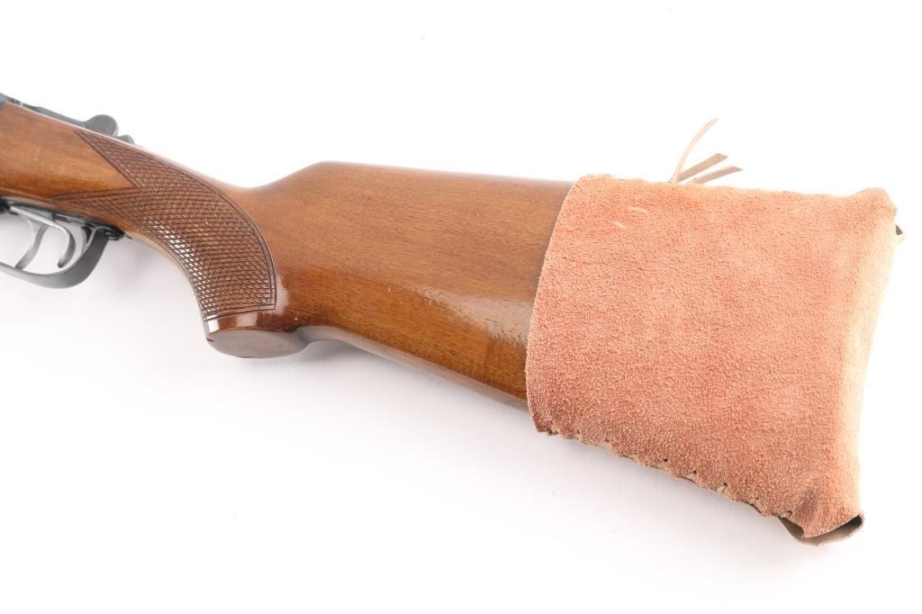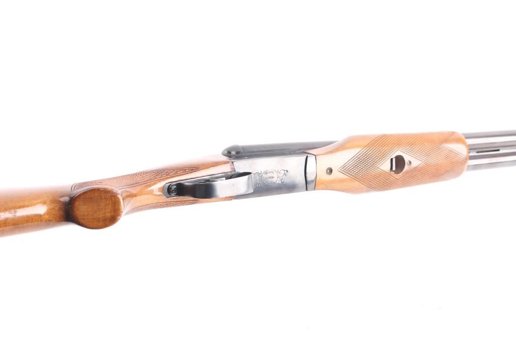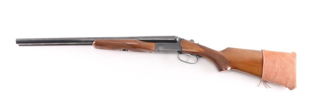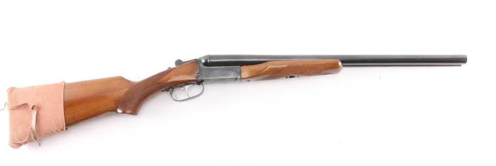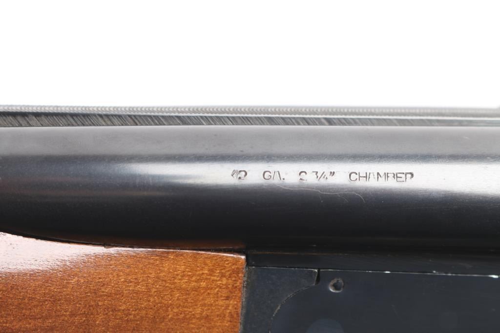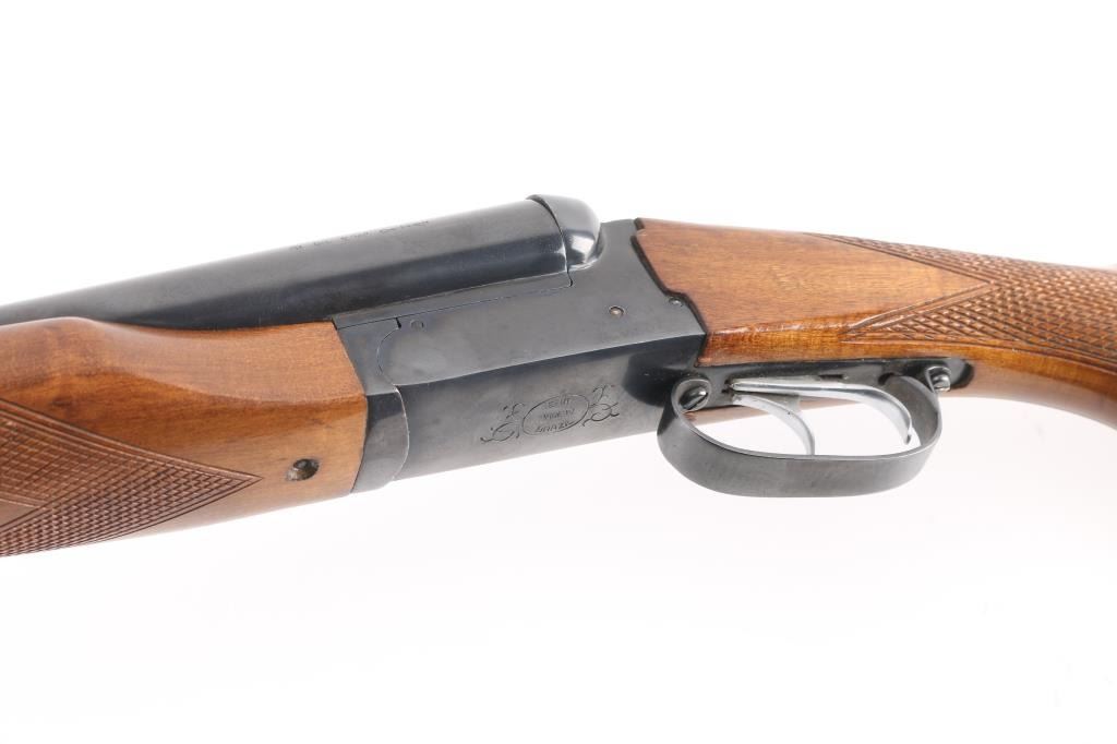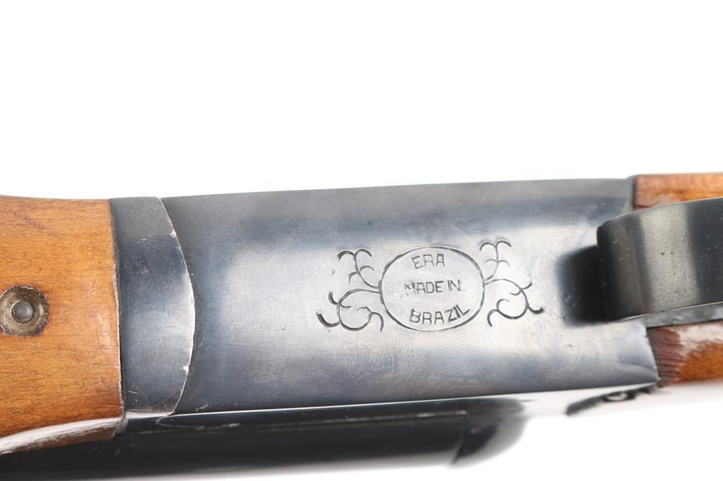 Brazilian made side by side double barrel 12 gauge shotgun imported by F.I.E. This shotgun has been modified to"Coach Gun" configuration by shortening the barrels. Features 21" blued raised vent rib barrels, brass bead sight, 2 3/4" chambers, blue finish, tang safety switch, single, double triggers. Bores appear very good/bright, a little dirty. Action locks up tight, blue finish is very good with minor scratches/chips. Wood is very good/sound. LOP is 14 3/4" to front trigger, chokes are IC, & CYL. Brown leather sleeve on buttstock.