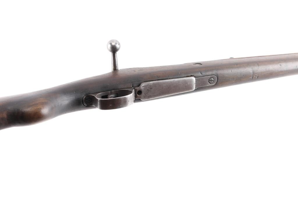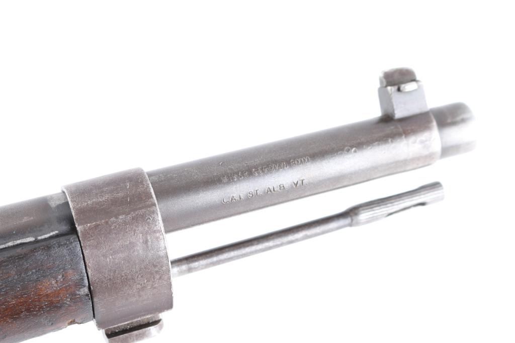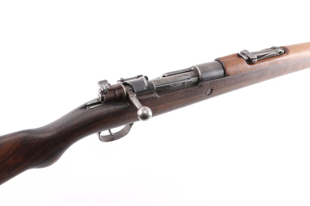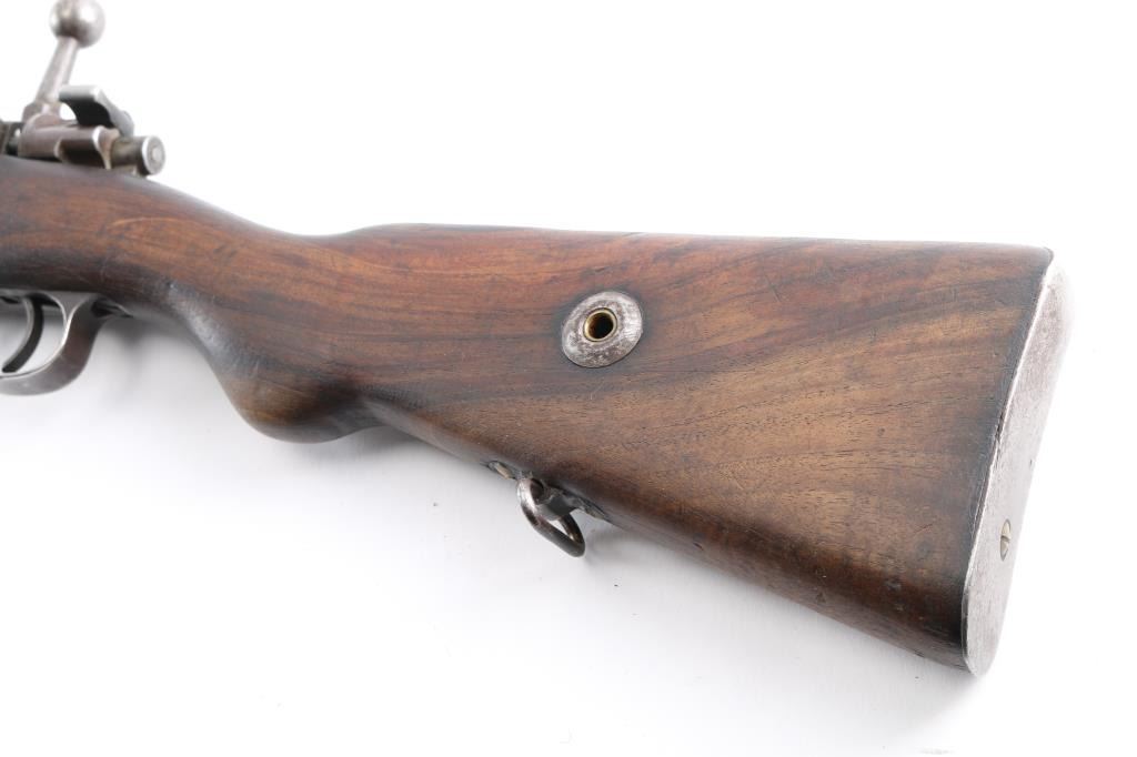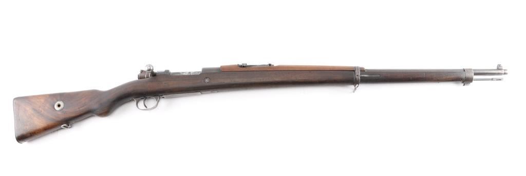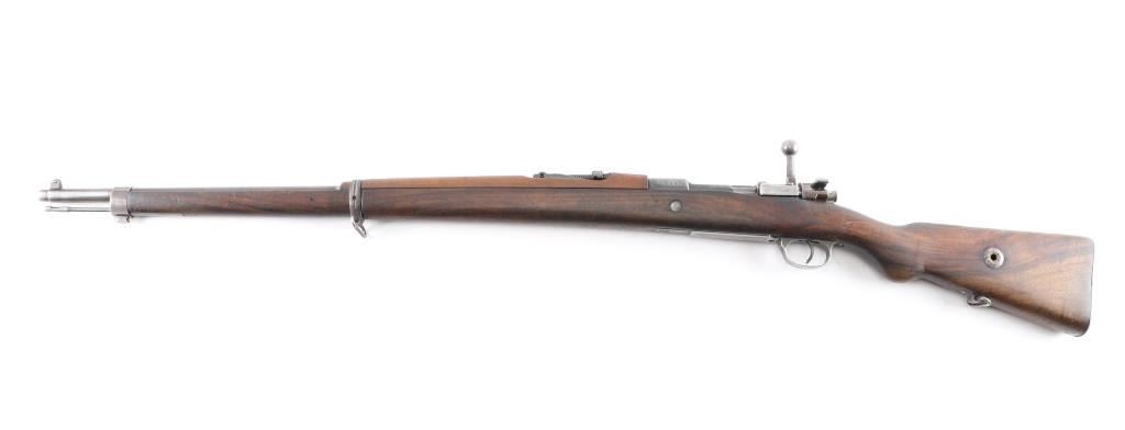 Turkish military bolt action rifle built by the ASFA Ankara Rifle Factory and imported by CAI, Georgia VT. Chamber dated 1941. Features blued finish, wood stock & handguard, 29" barrel, blade front sight, tangent rear sight, bayonet lug, cleaning rod, sling swivels, straight bolt handle, manual safety. Bore is good condition, frosted with strong rifling. Finish has turned a brown patina.. Stock is good condition, showing many small dents & scrapes. Handguard is fair, lighter color than stock.