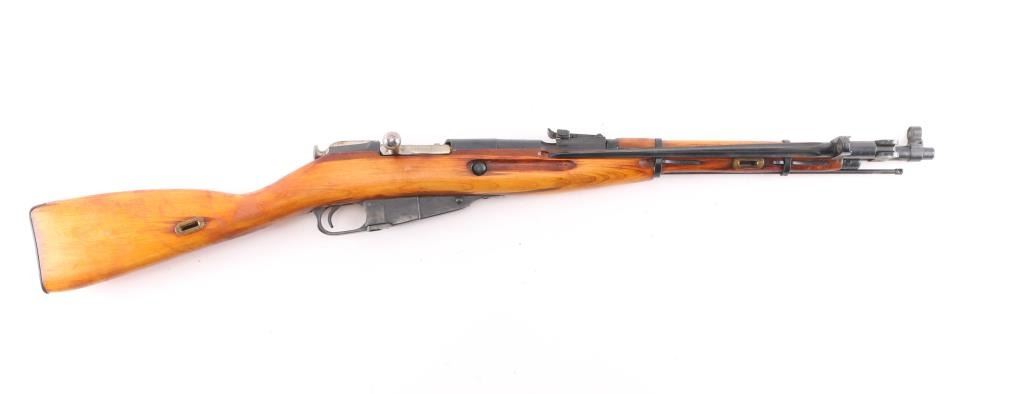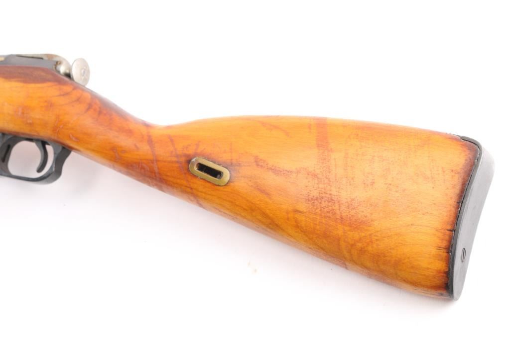 Russian Mosin Nagant military bolt action rifle dated 1948, imported by CAI, Georgia VT. Features 20" barrel, post front sight inside protective ring, tangent style rear sight, manual safety, straight bolt handle, sling slots, cleaning rod under barrel, folding spike bayonet. Bore is rough, rifling present, may improve with cleaning.. Retains 90% dark blued arsenal refinish with small scratches and handling marks. Bolt assembly is good polished bare metal, there is dried cosmoline in the chamber, and on the bolt. Laminated stock & handguard are very good condition, good fit to metal. Original Russian serial numbers matched on barrel shank, floorplate, bolt, and steel butt plate.