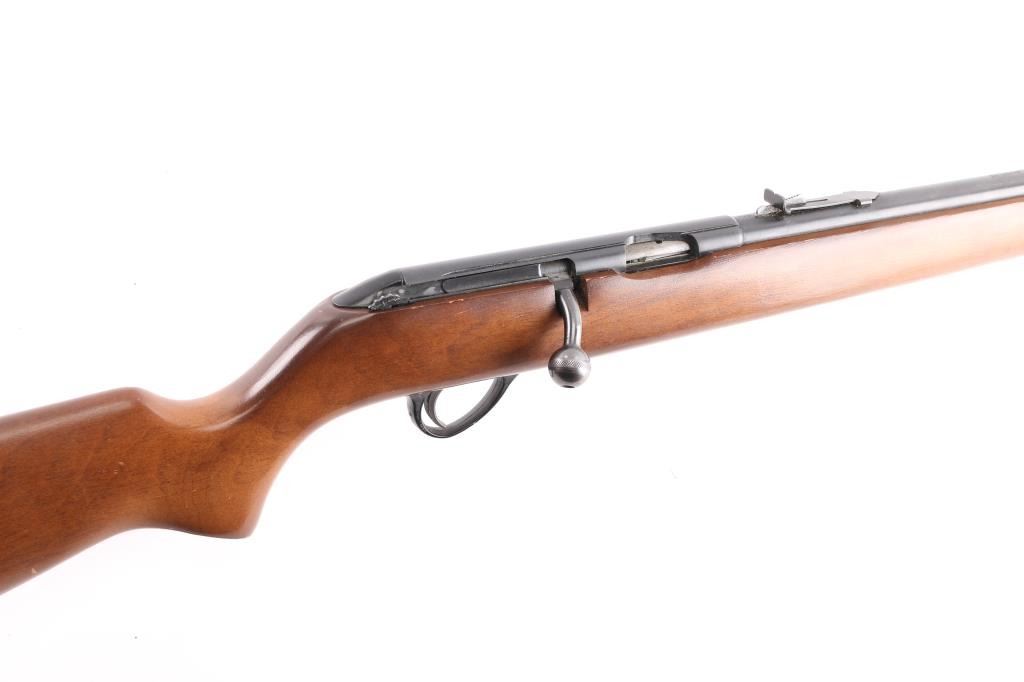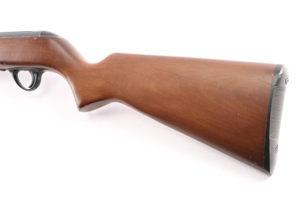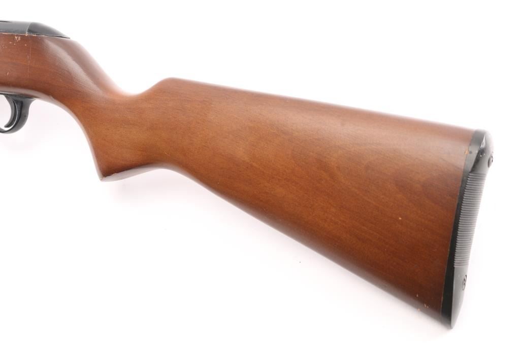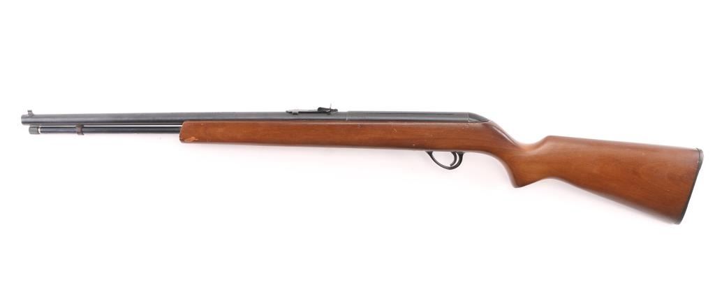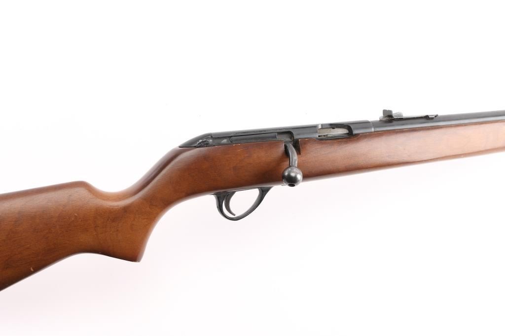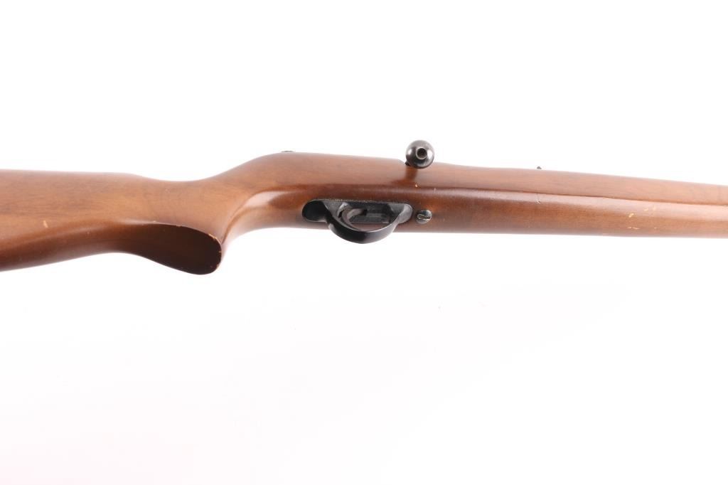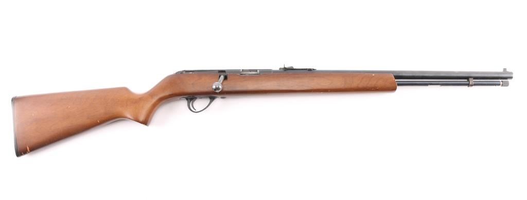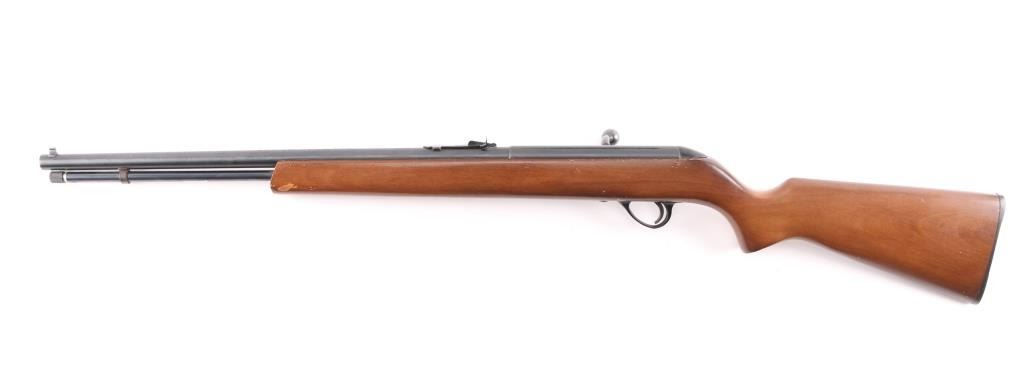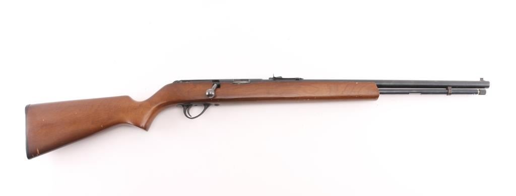 Note: Rifle does not fire, seems like the safety does not disconnect. American made bolt-action, tube fed rifle chambered in .22 S/L/LR. Features a blued finish, 20" barrel, dovetailed blade front sight, adjustable rear sporting sight, full-length 15 rd tube magazine, scope rail cuts on the receiver, smooth trigger, manual safety, black plastic triggerguard, smooth wood pistol grip shoulder stock with black hard rubber buttplate. Rifle exhibits approximately 90% of it's original finish showing a couple areas of finish loss on the barrel. Action is smooth. Bore is fairly dirty with scattered light pitting and wood stock is good with moderate blemishes.
