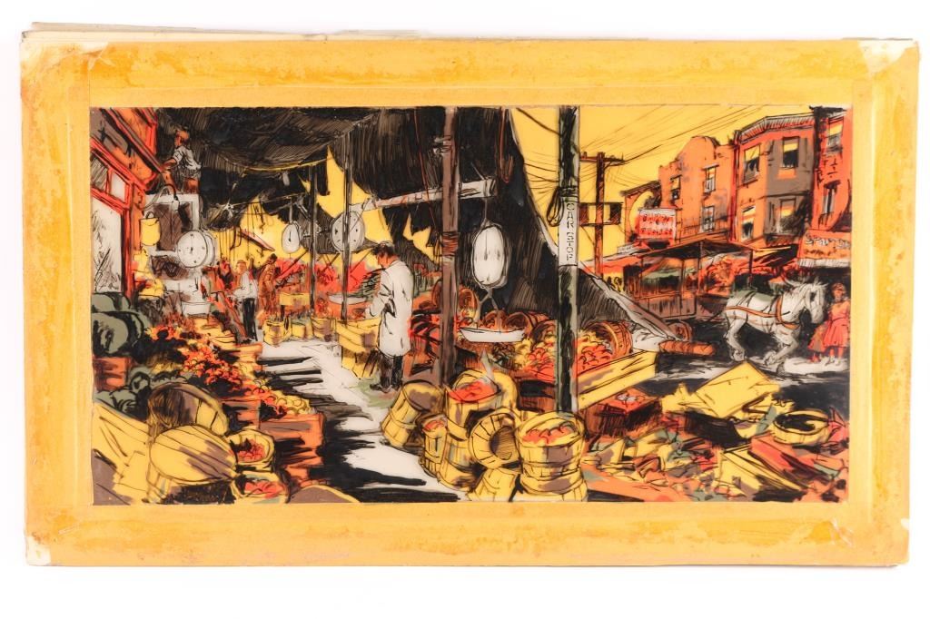 (1)Celluloid rendering from movie, depicts a street market scene, 22"x12".