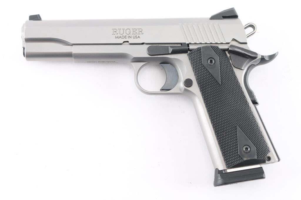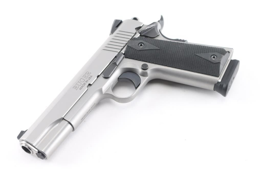 This is a modern 1911 from Ruger chambered in .45 ACP. It is stainless construction with a matte finish and a 5" barrel. The bore is excellent/bright. It has checkered black rubber grips. The gun has a blue ring hammer, trigger, and controls, serrated hammer spur, oversized beavertail grip safety, knurled mainspring housing, rear slide serrations and drift adjustable Novak 3 dot sights. Overall excellent condition. Bore is excellent, like new. It comes with factory 8-rd magazine with extension.