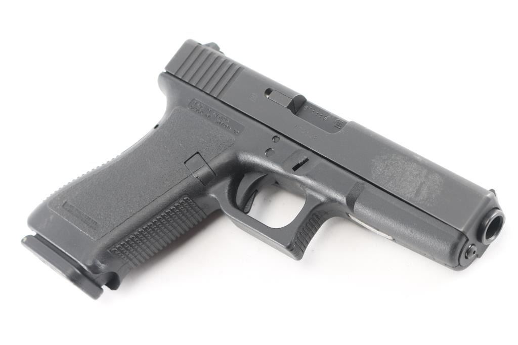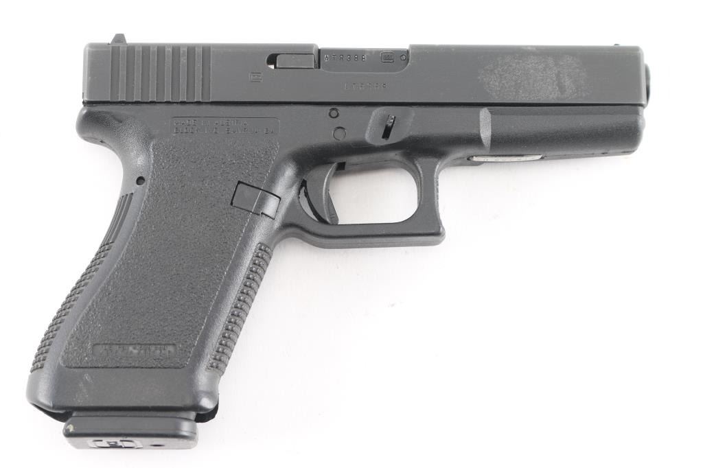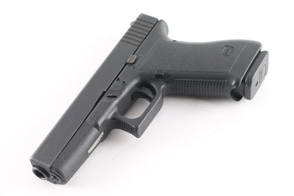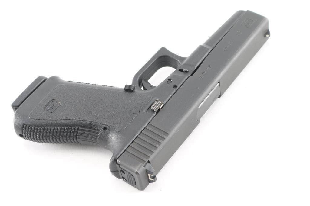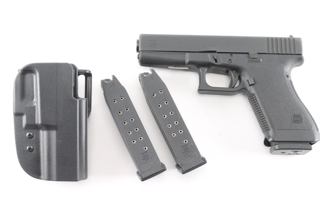 Austrian made safe-action semi-automatic full-size pistol chambered in .45 Auto. Imported by Glock Inc. of Smyrna, GA with import information molded into the right side of the frame. Features a black phosphate finished slide, 4.61" barrel with polygonal rifling, white dot front, dovetailed white outline notch rear sights, integrated trigger safety, push button magazine release, factory 13 round magazine, and durable black polymer frame with checkered grip straps. Pistol retains approximately 97% of its original finish showing some high point edge wear and scattered handling marks/scuffs. Action is smooth, the bore is excellent/bright, and the polymer is excellent. 2 spare factory 13 round magazines, (3) total, and a 'Uncle Mikes' black polymer holster