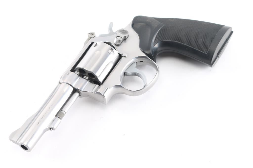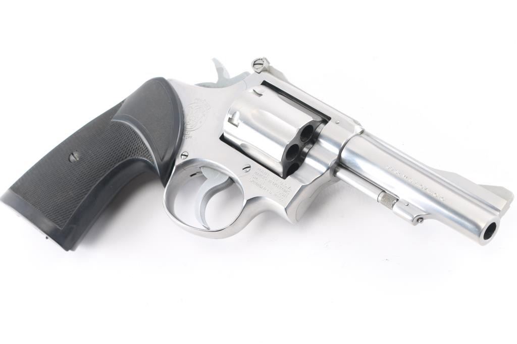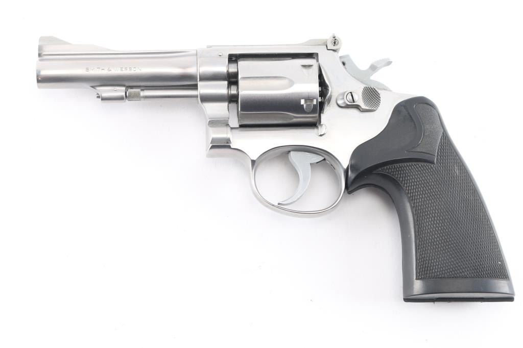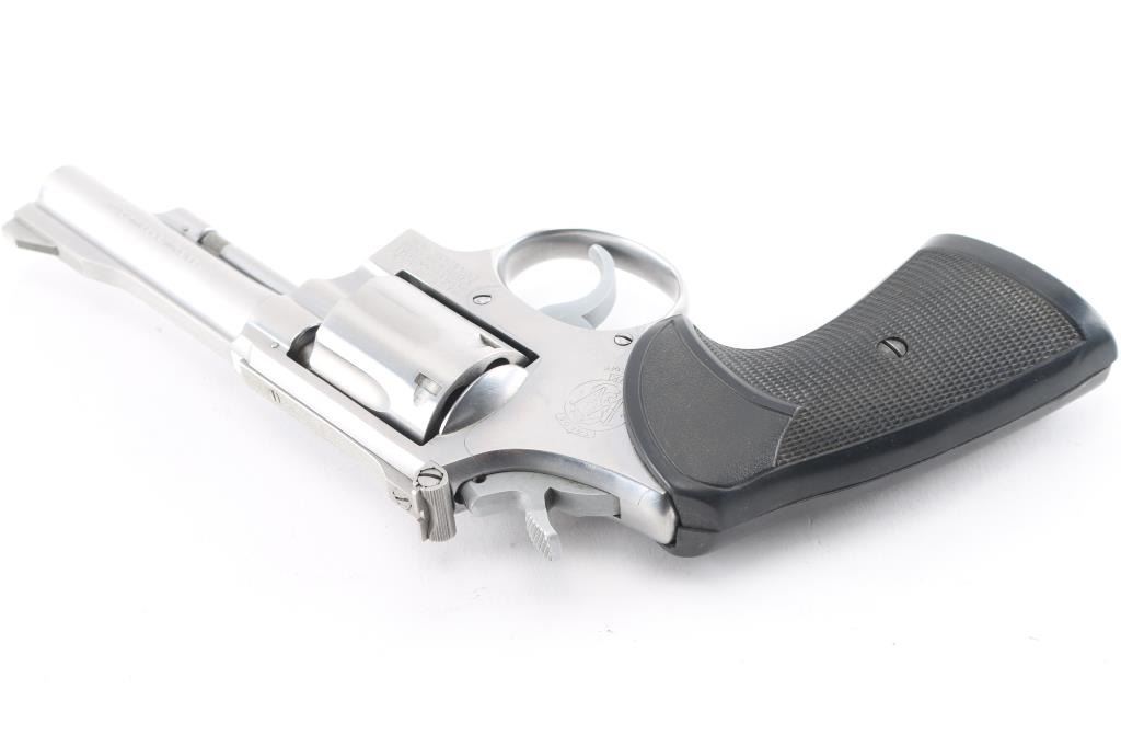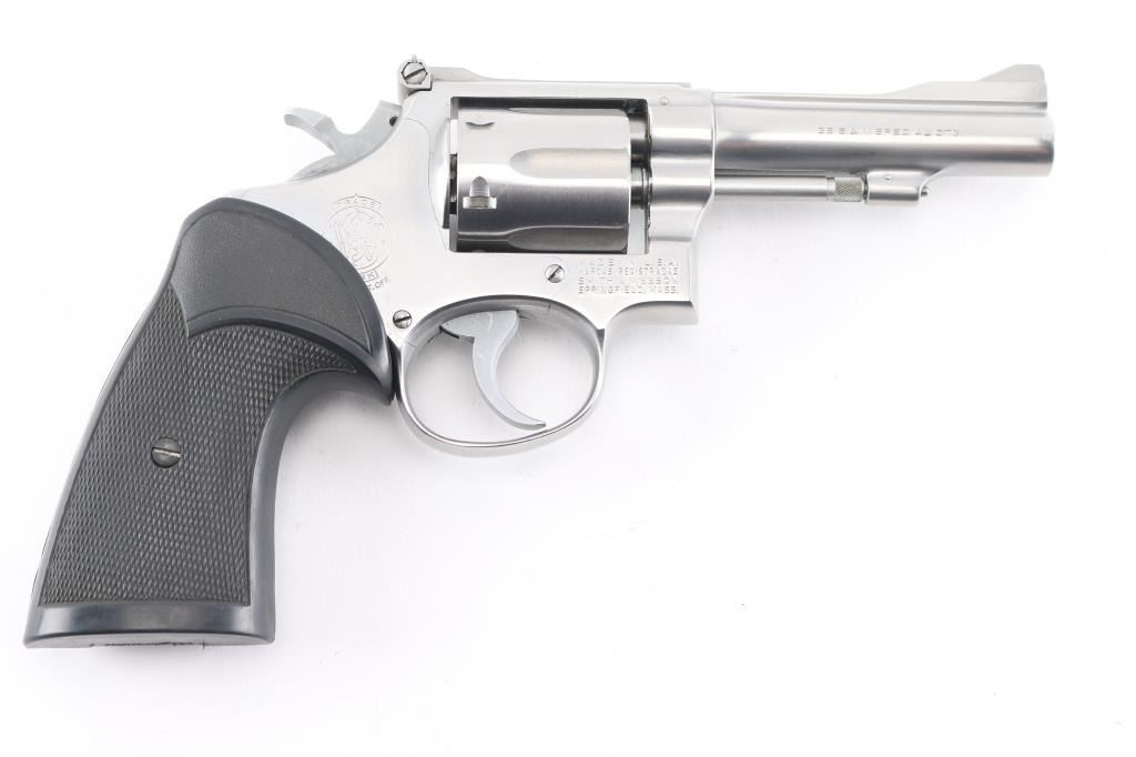 The "38 Combat Masterpiece" American made six shot revolver chambered for .38 Special ammunition. Built on a square butt target K frame. It features stainless steel construction, a 4" pinned, ribbed barrel, raised serrated ramp front sight, adjustable rear sight, fluted cylinder, knurled hammer spur and cylinder release. It has two piece checkered black rubber grips. Metal finish looks good with minor signs of handling, grips are fine. Bore is excellent/bright. Action is crisp/tight.
