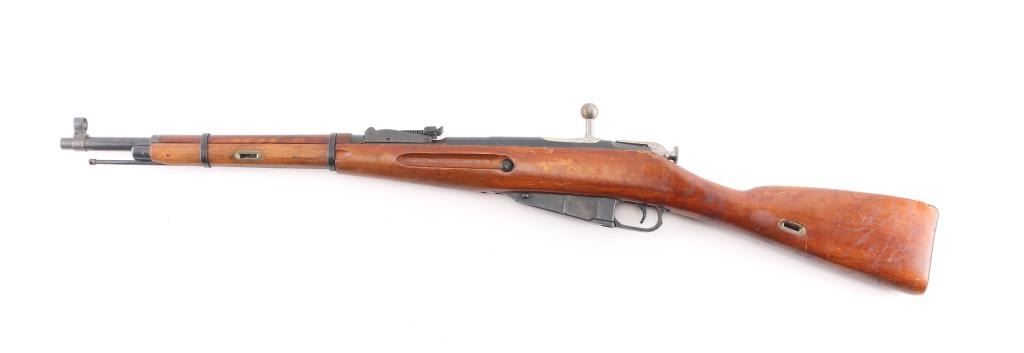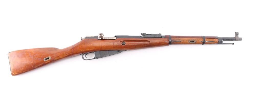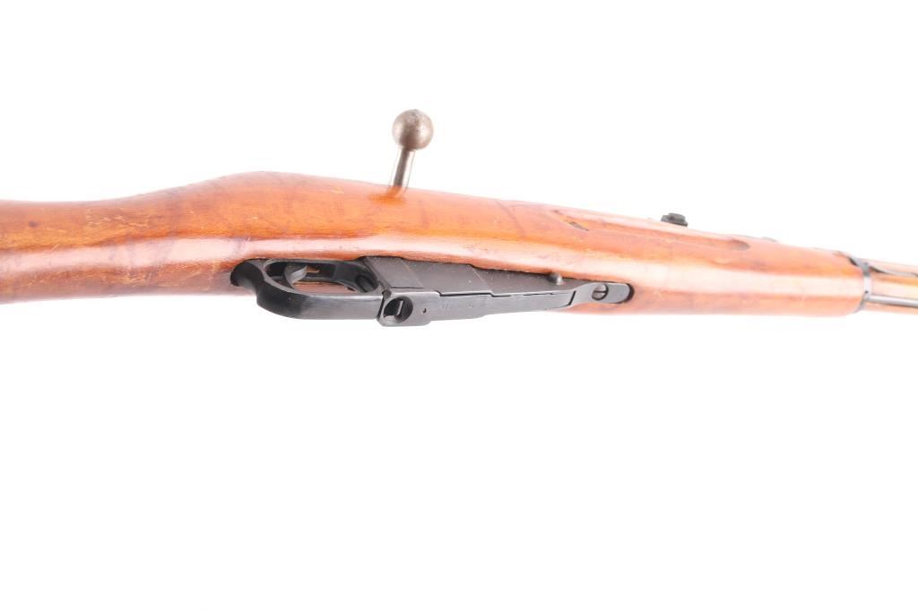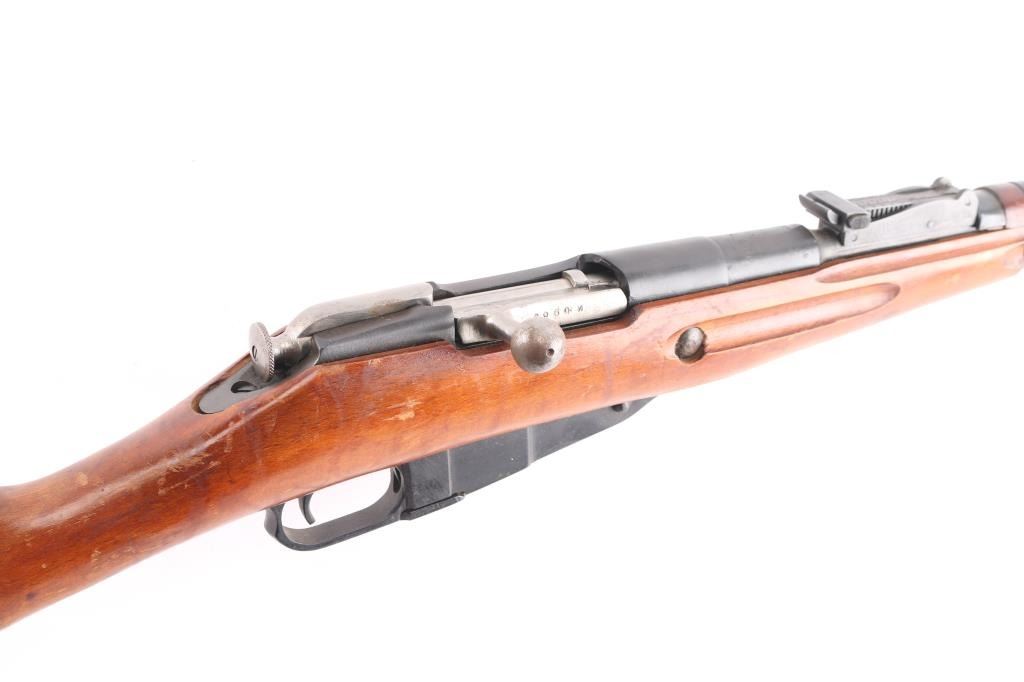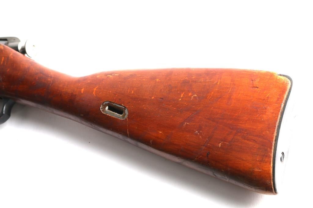 Reconditioned WW2 Russian military bolt action service rifle chambered in 7.62x54R, circa 1943. Features a blued finish, Izhevsk marked 20.25" barrel, hooded post front sight, graduated rear sight to 1,000 meters, cleaning rod, two barrel bands, 5 round fixed magazine, straight bolt handle, smooth wood handguard and straight grip shoulder stock with metal buttplate. Matching serial numbers on barrel, receiver, floorplate, steel butt plate, & bolt. Import marks on barrel. Rifle retains approximately 95% of it's blued finish showing few losses. Action performs well, bore is very good/bright, and wood stocks are very good.