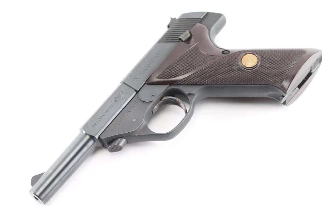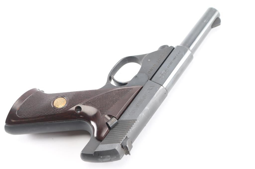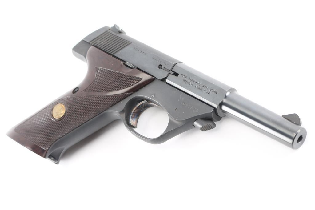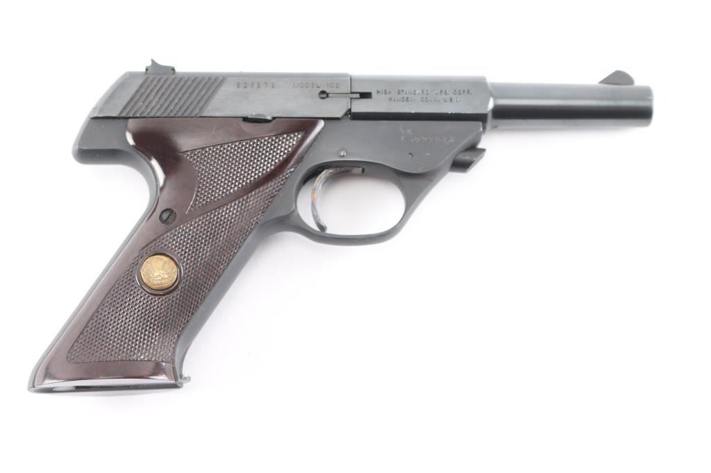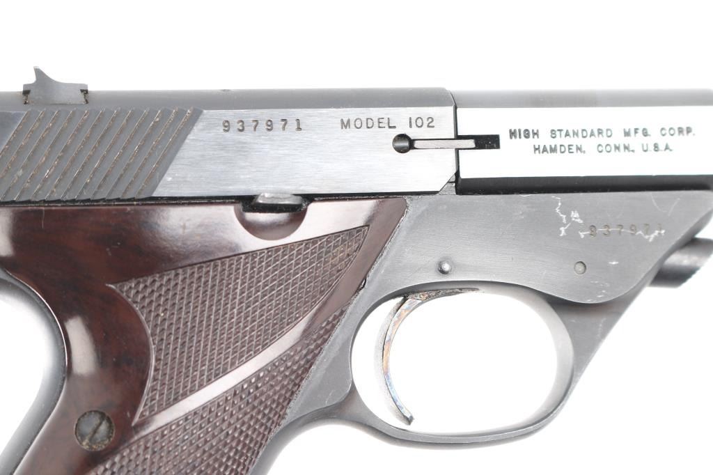 'Model 102' Semiautomatic rimfire pistol features blued finish, checkered brown plastic grips with slight thumb rest depressions and High Standard logo medallions, 4.5" tapered barrel with square rear portion, ramp front & dovetailed rear sights, manual safety, heel magazine release. Bore is very good condition. Retains 95% finish with light edge losses & handling marks. Grips are very good. Slide numbered to frame. Includes one magazine.