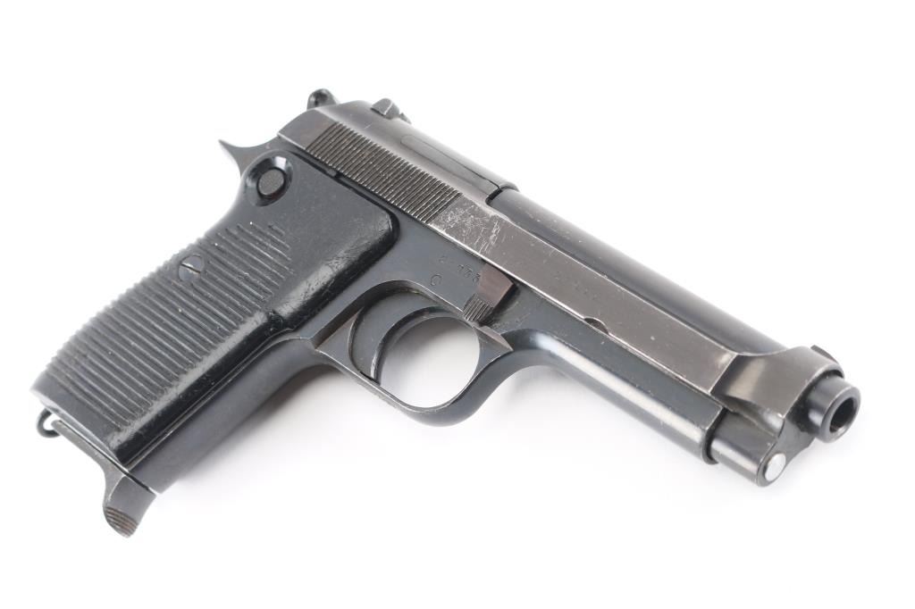 'Brigadier' single action semi-automatic pistol. Imported by PW Arms, Redmond WA. Features a blued finish, 4.6" barrel, fixed front sight, dovetailed rear sight, smooth trigger, push button safety, serrated round hammer spur, push button magazine release low on grip, 8 round magazine with pinky rest extension, lanyard loop and two-piece grooved black plastic wrap-around grips. Bore is very good condition. Retains 80% finish with scratches (especially on right side of slide) and edge losses. Grips are good condition with scratches. Slide numbered "21933". Includes one magazine.